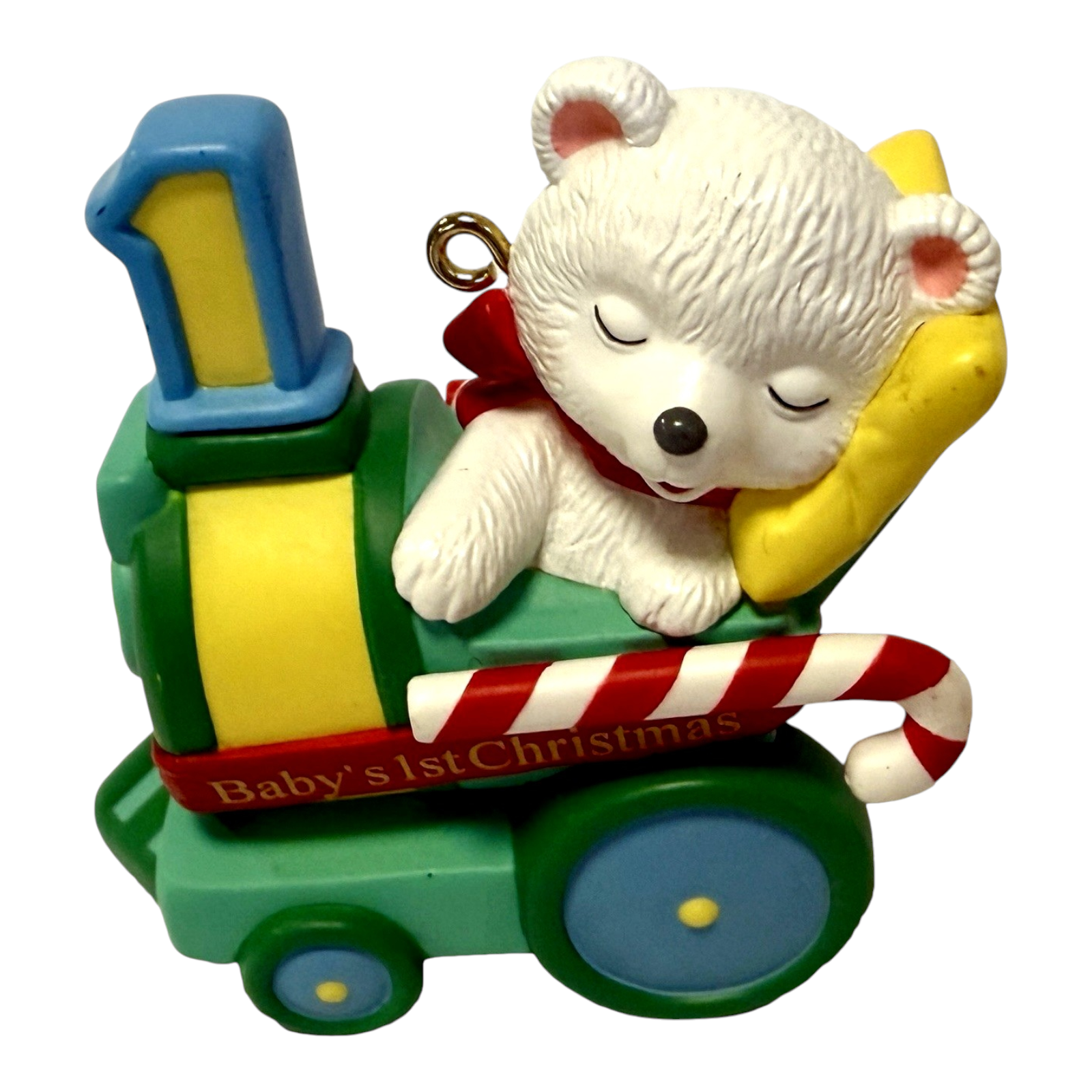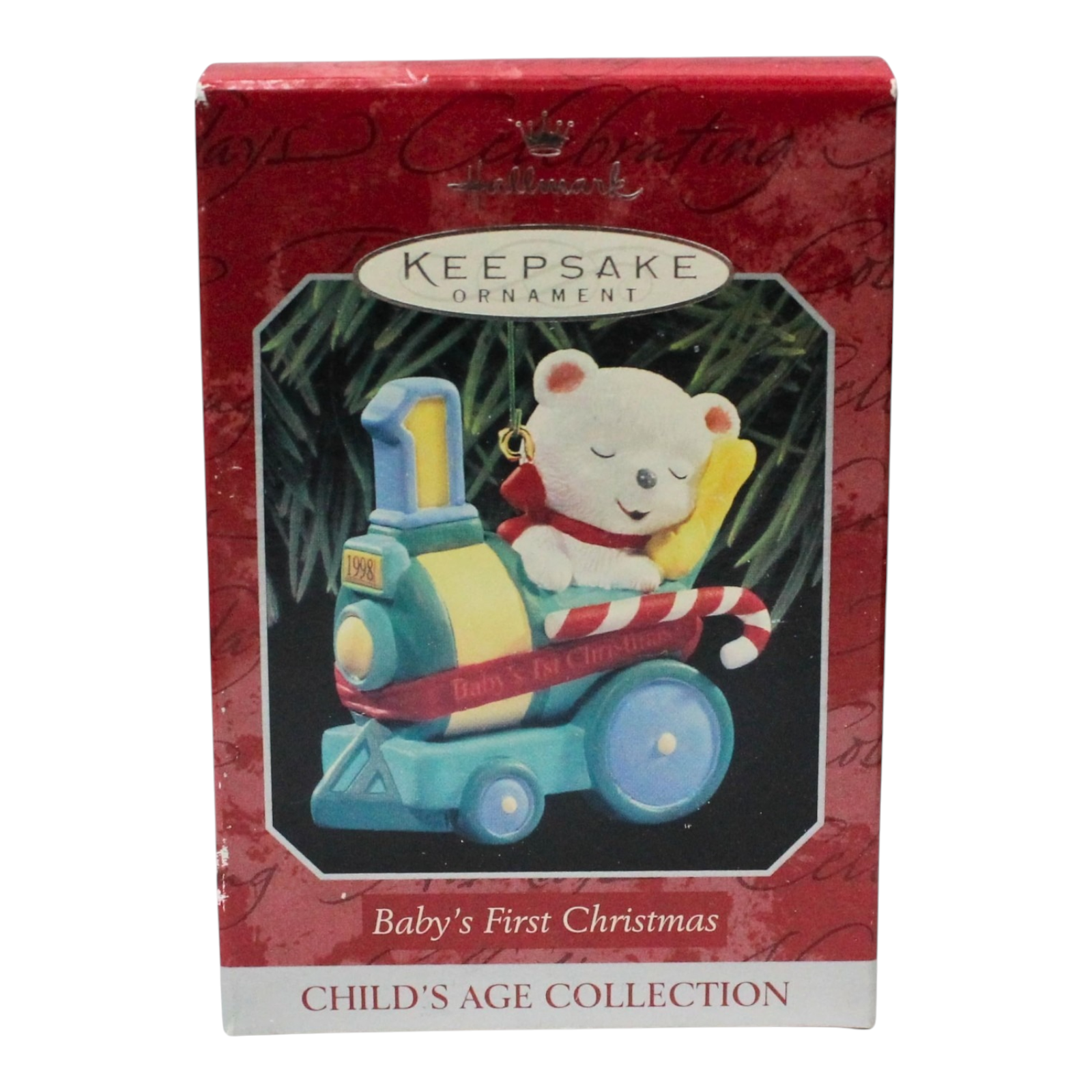 Celebrate a treasured milestone with the 1998 Baby's First Christmas ornament from Hallmark’s Child’s Age Collection. This adorable keepsake features a sweet sleeping bear nestled in a peppermint-trimmed train car, complete with a #1 smokestack and candy-cane accents. A heartwarming tribute to a baby’s first holiday, it often arrives mint in its original box, making it the perfect sentimental gift or collectible for new parents and families.