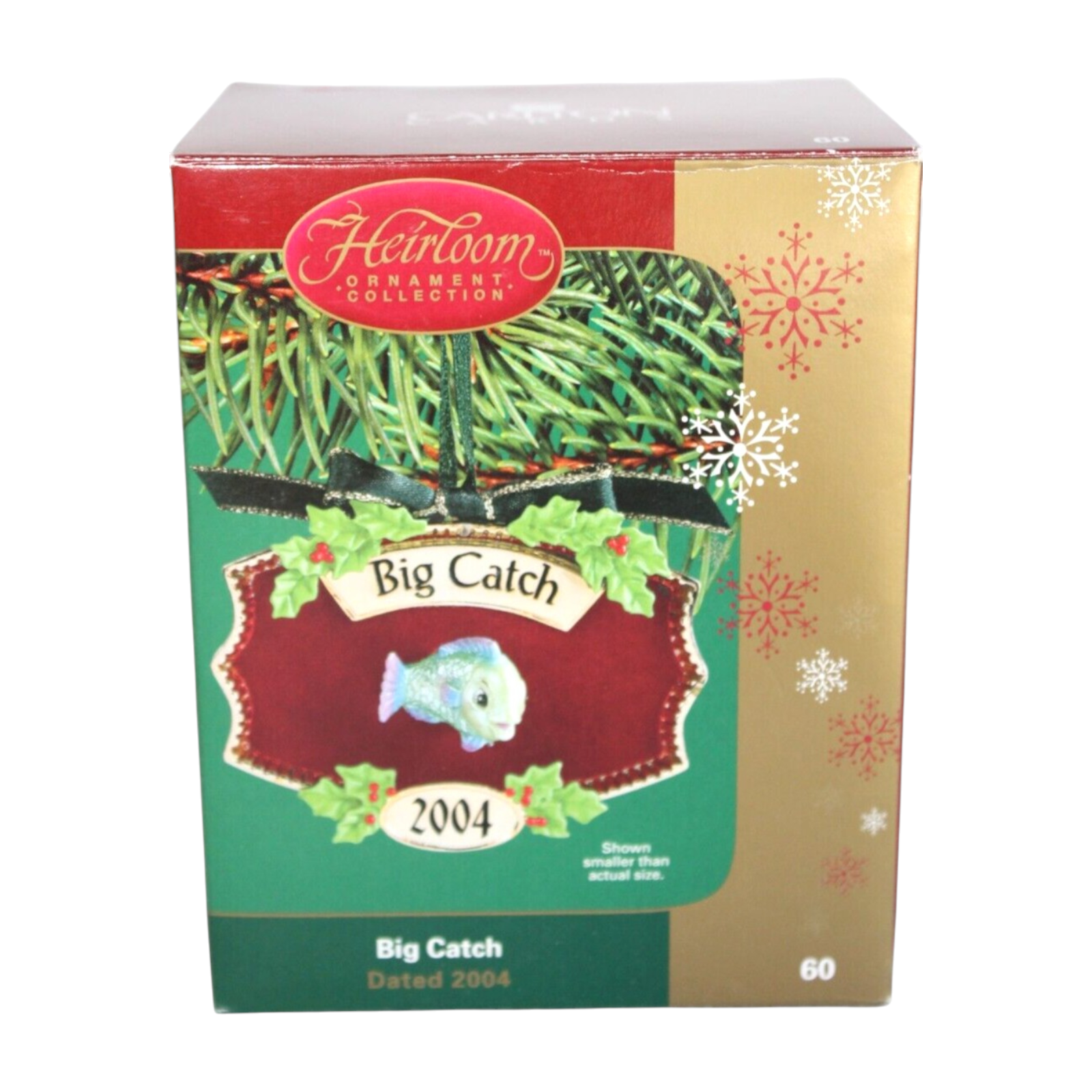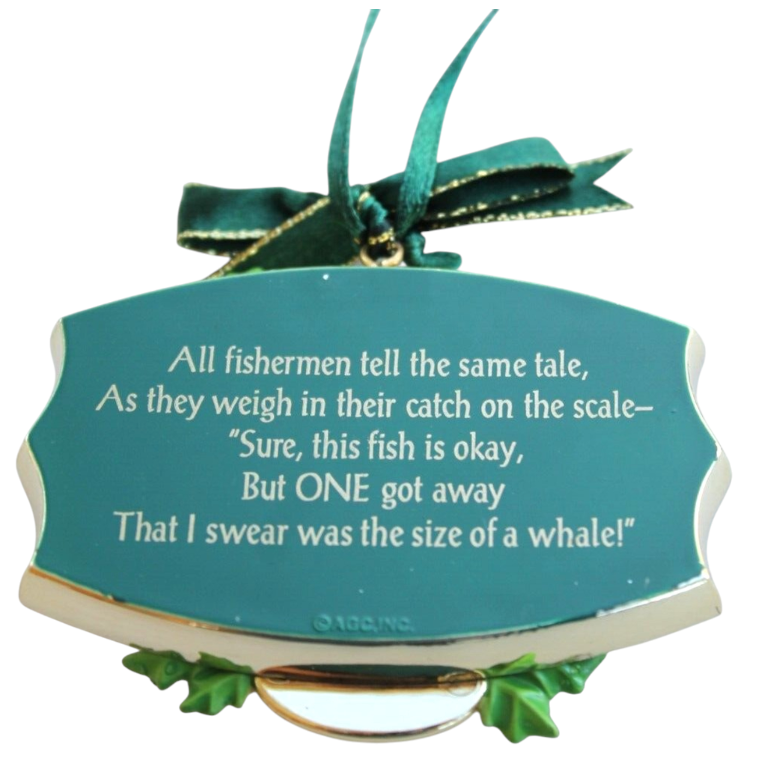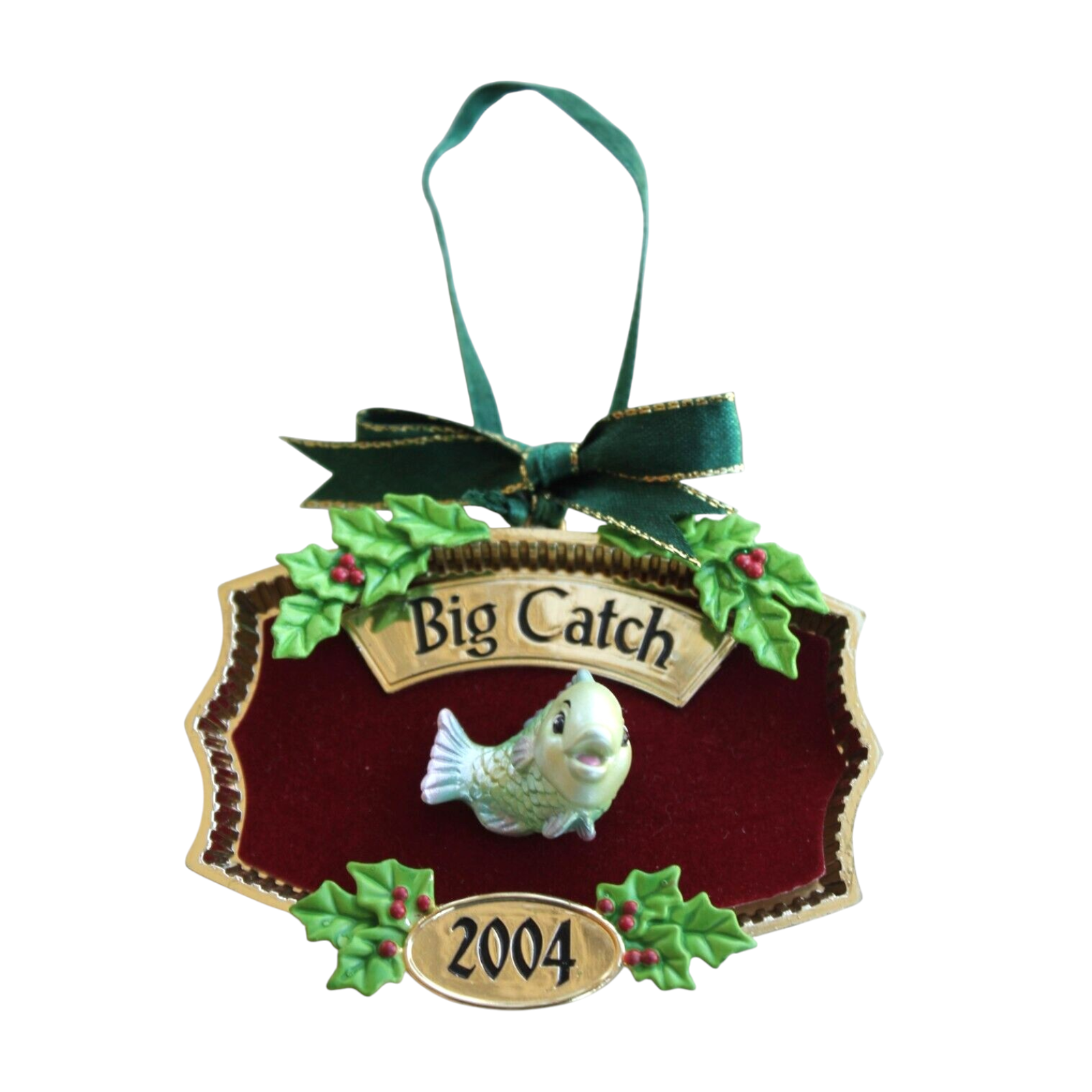 This playful ornament from the Carlton Cards Heirloom collection captures the thrill of the catch with a miniature fisherman reeling in his prize on a festive holiday-themed background. The design features detailed molded plastic with colorful paintwork, holiday accents and a thematic nod to the outdoor fishing hobby—perfect for anglers, nature lovers and ornament collectors alike. As a dated 1998 piece with a niche theme, it holds both display appeal and collectible value.