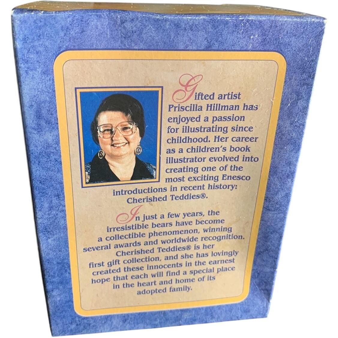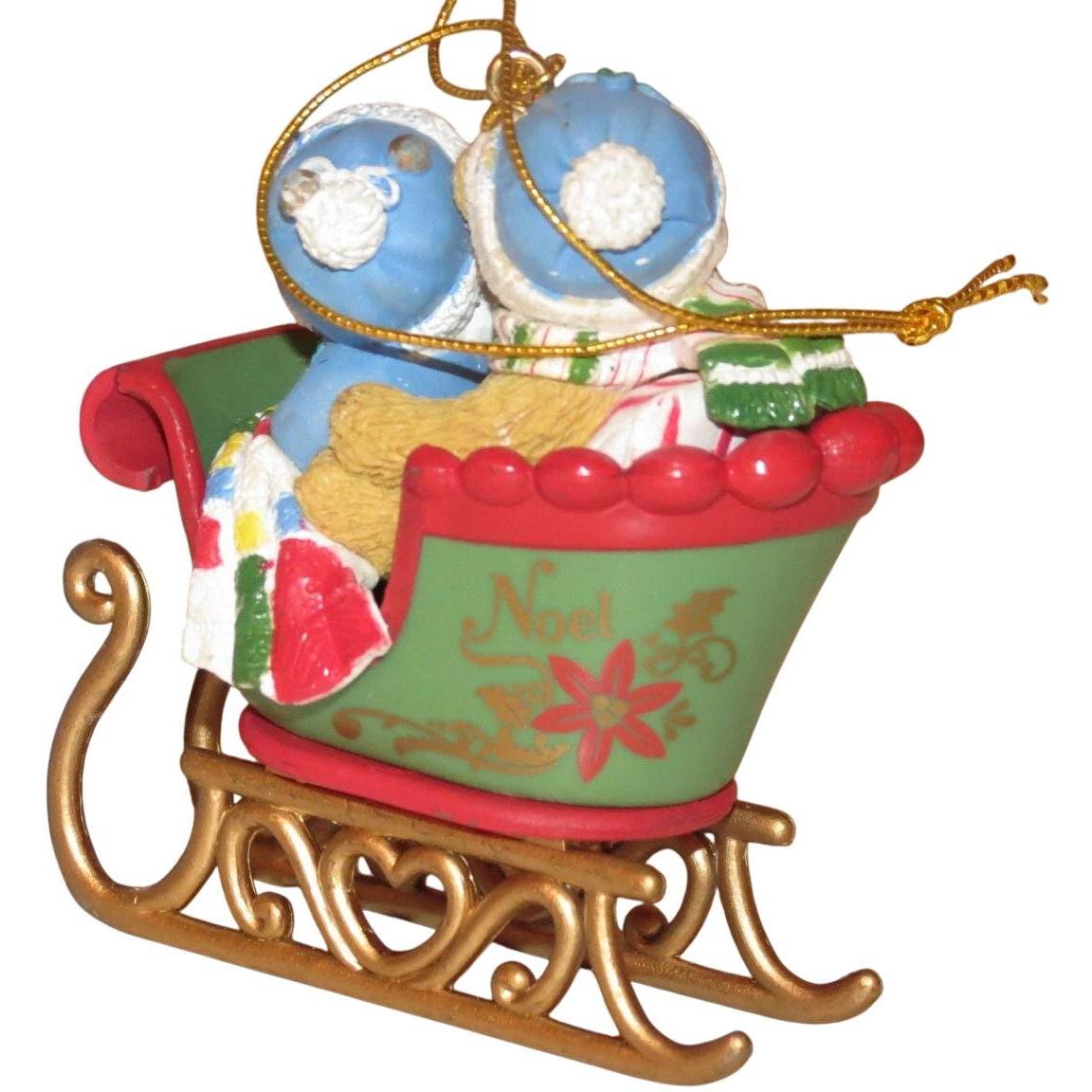 This enchanting ornament features two teddy bears joyfully nestled in a festive red sled filled with holiday gifts and greenery, embodying the warm spirit of Christmas. The detailed hand-painted finish on multicoloured resin/plastic gives it a rich texture and nostalgic appeal, typical of the Cherished Teddies line. Released in 1998 and designed by Priscilla Hillman, it appeals both to teddy-bear collectors and those seeking vintage holiday keepsakes. With its compact size and lovable characters, it’s a charming addition to any tree or display, evoking the cozy joy of winter traditions.