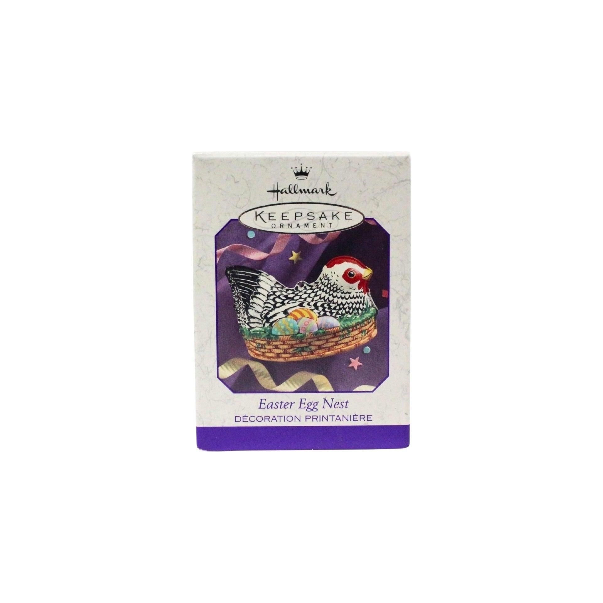 Add a touch of pastoral charm to your Easter décor with Easter Egg Nest, a 1998 Hallmark Keepsake ornament (QEO8427) also known as the “Hen in Egg Nest” tin decoration. This vintage piece features a black-and-white hen sitting contentedly in a woven tin nest filled with colorful Easter eggs. The design evokes spring’s renewal and gentle warmth. The package includes the pressed-tin ornament itself; box & tag included when available.
