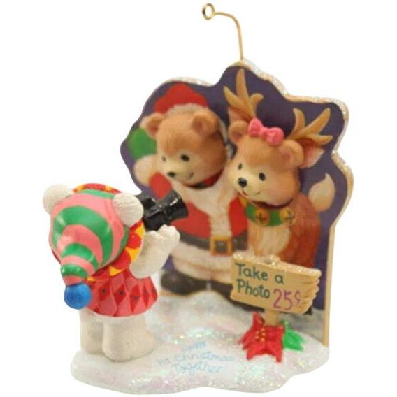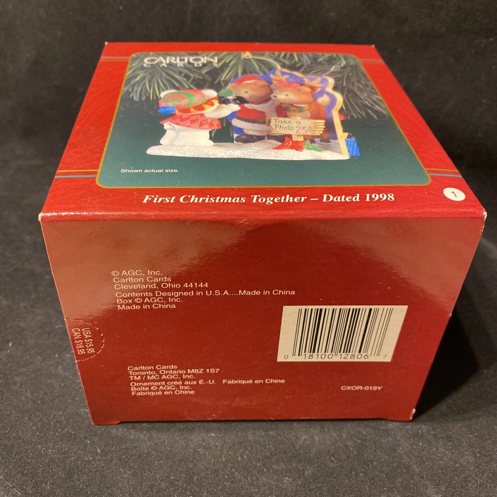 This tender keepsake ornament from the 1998 Carlton Cards Heirloom collection commemorates a couple’s first holiday season together. The design typically features romantic motifs — such as hearts, intertwined figures, or festive greenery — set against a soft holiday palette. Crafted in durable molded plastic with painted detail, it offers both aesthetic charm and collectible appeal. The date-specific branding and sentimental theme make it a meaningful addition to any collection, ideal as a first-Christmas gift or treasured heirloom.