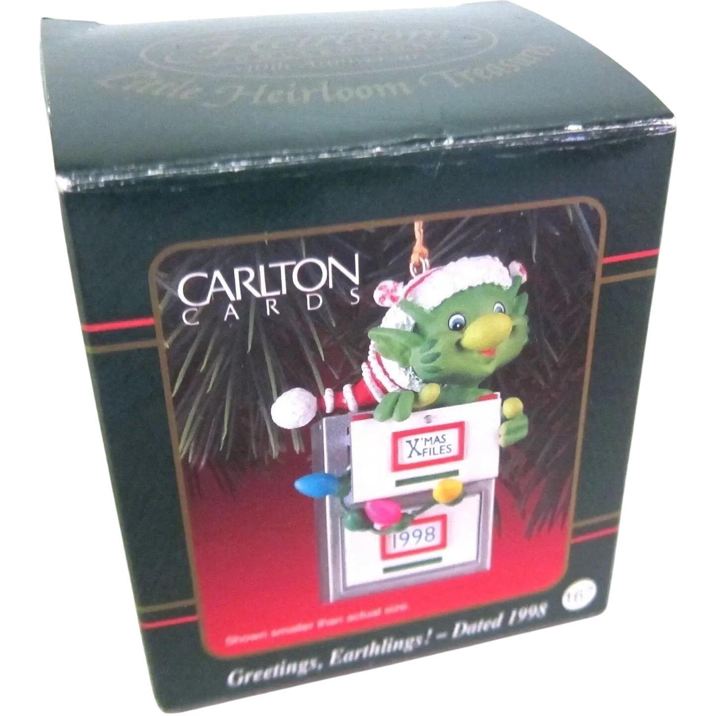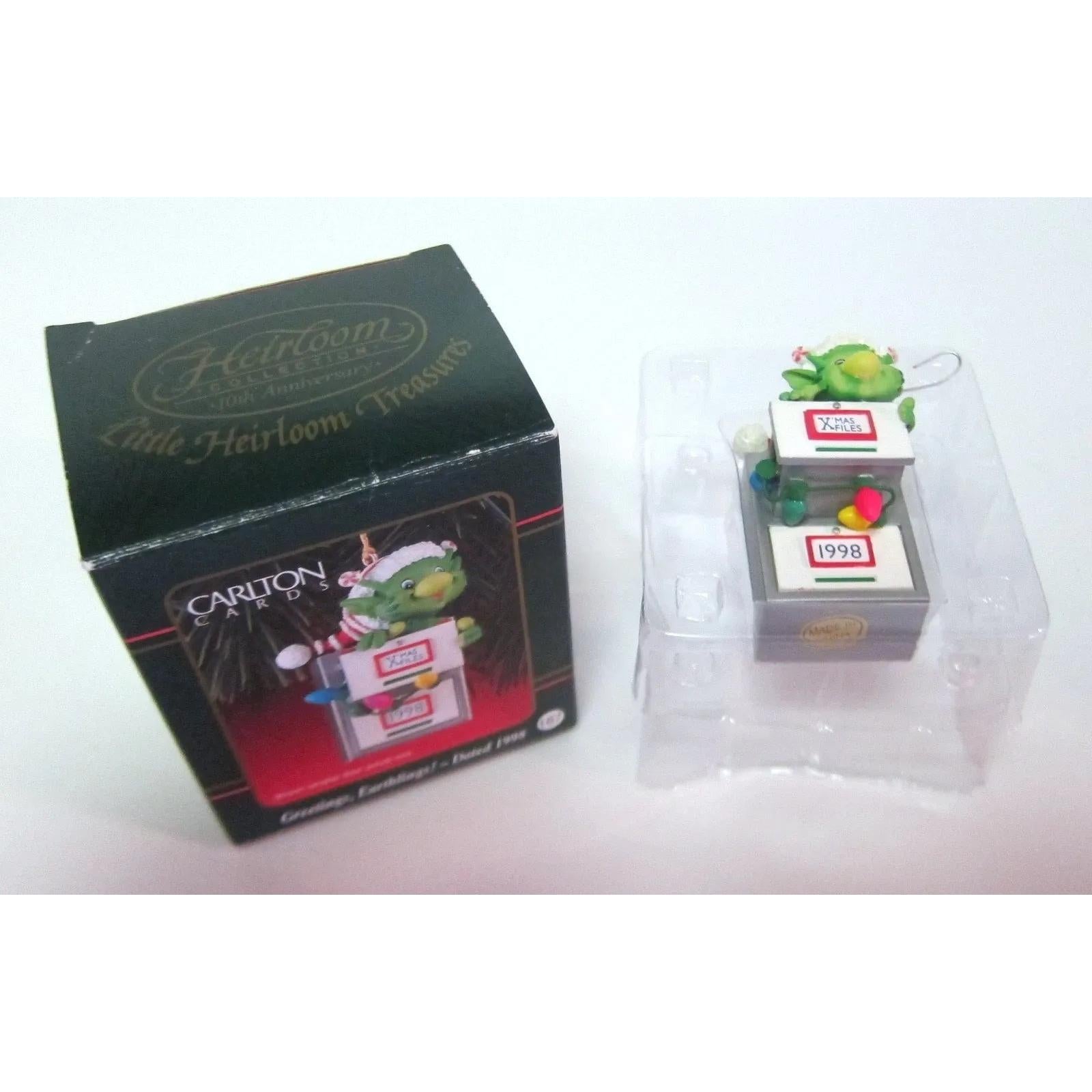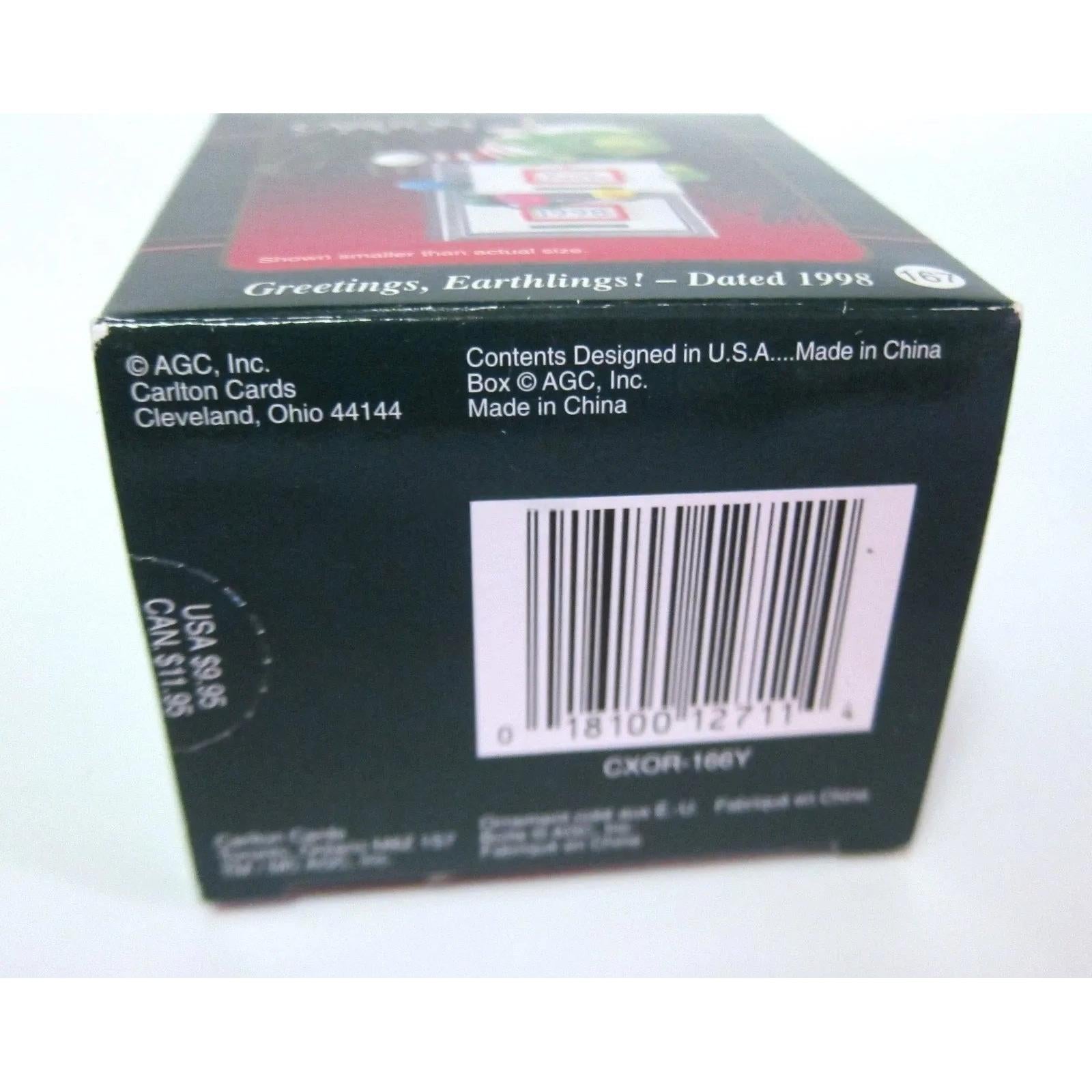 Blast off into holiday fun with this 1998 Greetings, Earthlings! dinosaur ornament from Carlton Cards. The design features a playful dinosaur character in festive colors—complete with holiday accents and a whimsical alien-theme twist. Crafted in durable molded plastic, the ornament captures a quirky, collectible charm that stands out in any vintage holiday collection. Ideal for collectors who enjoy themed ornaments with a sense of fun and nostalgia, it’s a unique addition to seasonal décor that brings both character and craftsmanship.