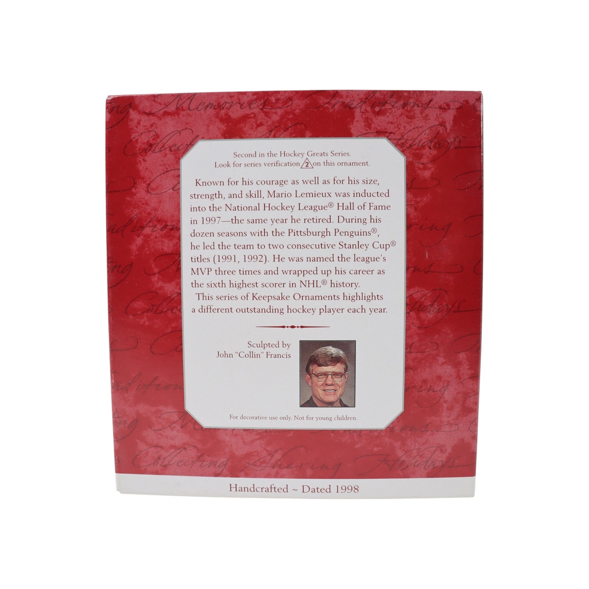 Honor one of hockey’s legends with the 1998 Hallmark Keepsake Ornament, Mario Lemieux, the second release in the Hockey Greats series. This finely crafted ornament captures Lemieux’s prowess and prestige—featuring his likeness in full Pittsburgh Penguins gear. Accompanied by an exclusive trading card and sculpted by John “Collin” Francis, it offers a heartfelt nod to Lemieux’s iconic career—no batteries or cords needed.