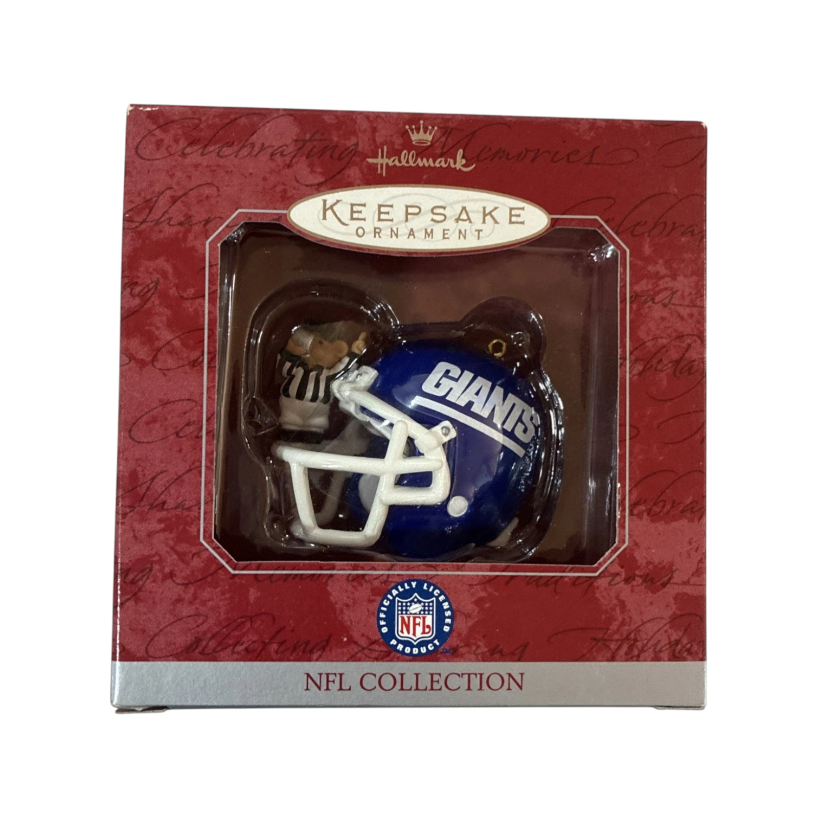 Display team pride with this spirited 1998 New York Giants ornament. Crafted in painted plastic, it depicts the classic Giants helmet topped with an adorable referee mouse—a charming nod to both the sport and the season. Designed by John "Collin" Francis, this festive miniature arrives mint in its original box—ready to hang with no extras required.