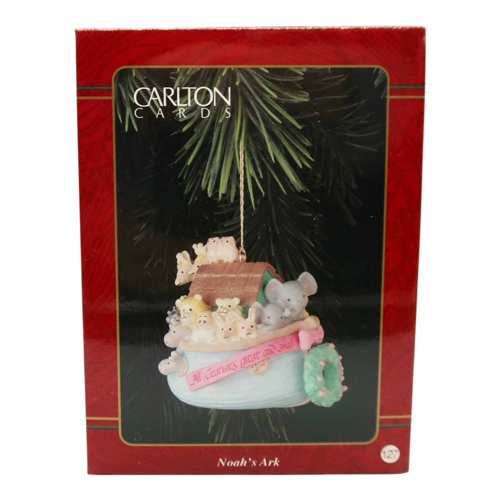 This charming collectible ornament presents a miniature depiction of the biblical story of Noah’s Ark, featuring the ark vessel nestled among stylized waves and pairs of animals, rendered in rich holiday tones with gold-accented highlights. Part of Carlton Cards’ Heirloom line, the design evokes timeless tradition and carries decorative storytelling appeal. Crafted in molded resin/plastic with hand-painted finish, the piece blends reverence, artistry and Christmas décor charm—ideal for those who appreciate sacred themes, storytelling ornaments or vintage religious décor. Released circa late 1990s, the model appeals to collectors of holiday narratives and Heirloom-series ornaments alike.