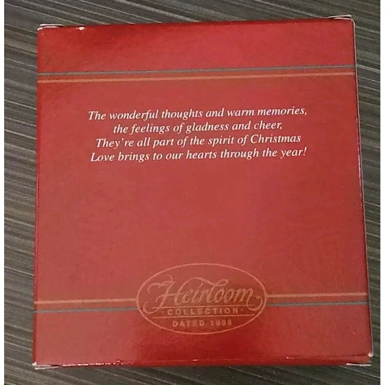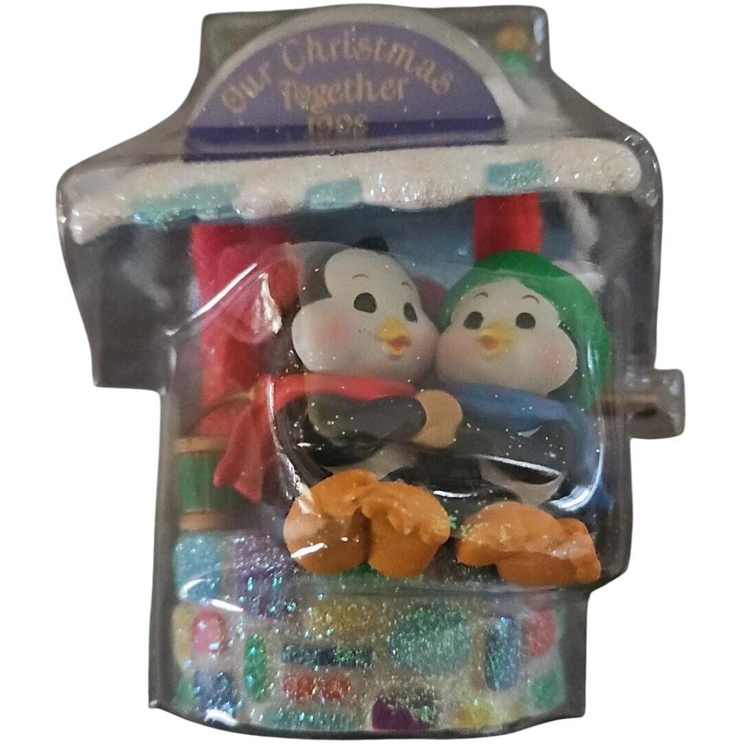 Celebrate the warmth of holiday togetherness with this charming ornament from the 1998 Carlton Cards Heirloom collection titled Our Christmas Together. The design depicts a festive scene of a loving couple (or affectionate animal pair) in holiday attire surrounded by seasonal greenery and accents, rendered in molded plastic with hand-painted detail. Its sentimental message and date-specific branding make it a meaningful keepsake for couples or anyone commemorating shared holiday memories.