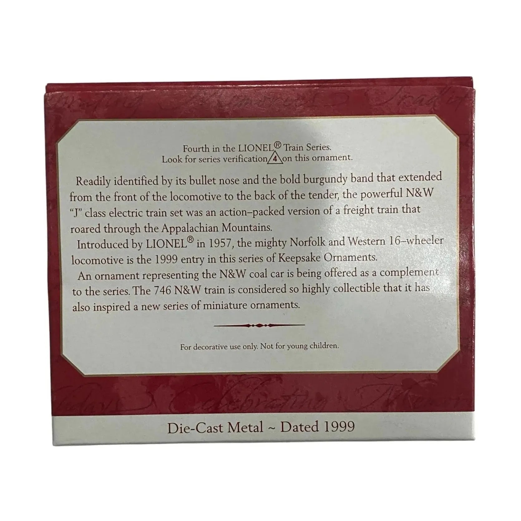 Bring a touch of railroad grandeur to your holiday décor with this beautifully detailed, die-cast metal Keepsake ornament depicting the iconic 1950 Lionel 746 Norfolk & Western steam locomotive. Its distinctive bullet-nose and bold burgundy band running from the front locomotive to the tender evoke the classic 16-wheeler freight engines of the mid-20th century.