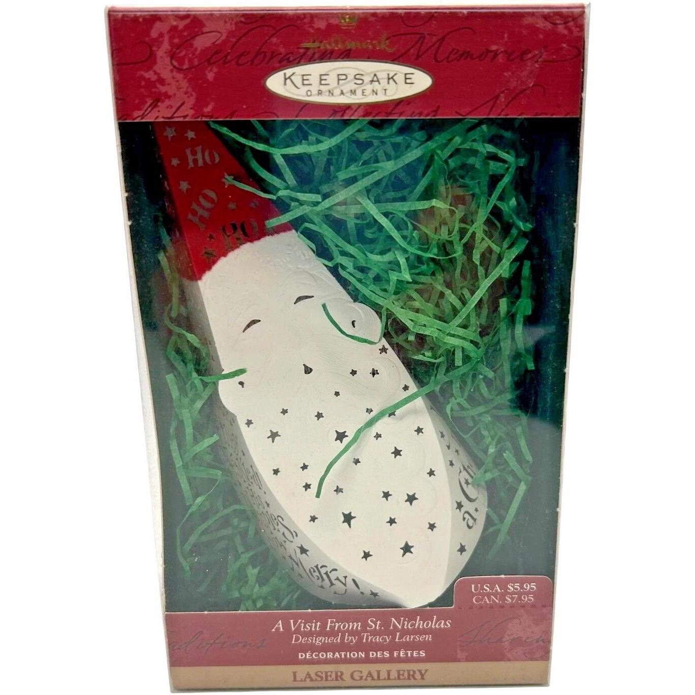Immerse yourself in the classic charm of Christmas with the 1999 “A Visit From St. Nicholas” ornament, part of Hallmark’s beloved Laser Gallery line. This intricate laser-cut design illuminates the nostalgic poem—“A Visit from St. Nicholas”—with delicate detailing brought to life when paired with festive lights. Featuring a clip for miniature light strings, it creates a warm, glowing focal point in any holiday display. Often found mint in its original box, this piece is both a heartfelt gift and a timeless addition to festive décor.