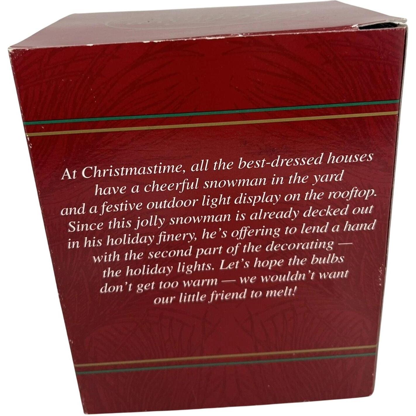 This cheerful collectible ornament features a snowman figure joyfully holding a string of glowing Christmas lights, part of the Heirloom Collection. The design captures festive whimsy with the snowman’s bright scarf, top hat, and holiday-light garland that seems to sparkle against the molded plastic finish. Crafted with hand-painted detail and vibrant holiday colours, this piece brings warmth, nostalgia and a playful touch to any tree or collection. Released in 1999, it is especially appealing to snowman-theme decorators, vintage ornament collectors, and fans of festive lighting accents.