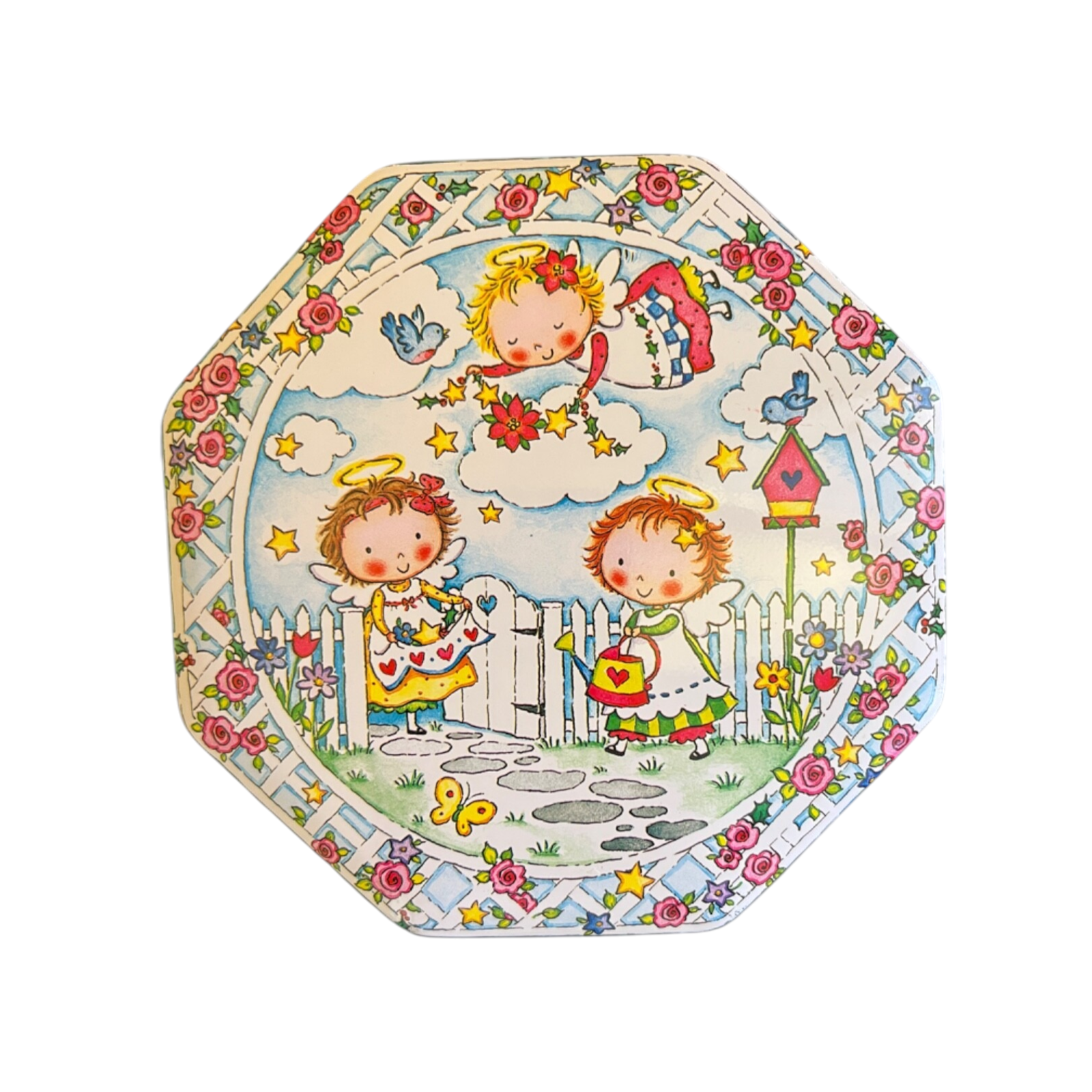 Item Dimensions: Each angel approximately 2″ tall; tin box approx. 4″ × 4″ × 1.5″ (≈5.1 × 5.1 × 3.8 cm)