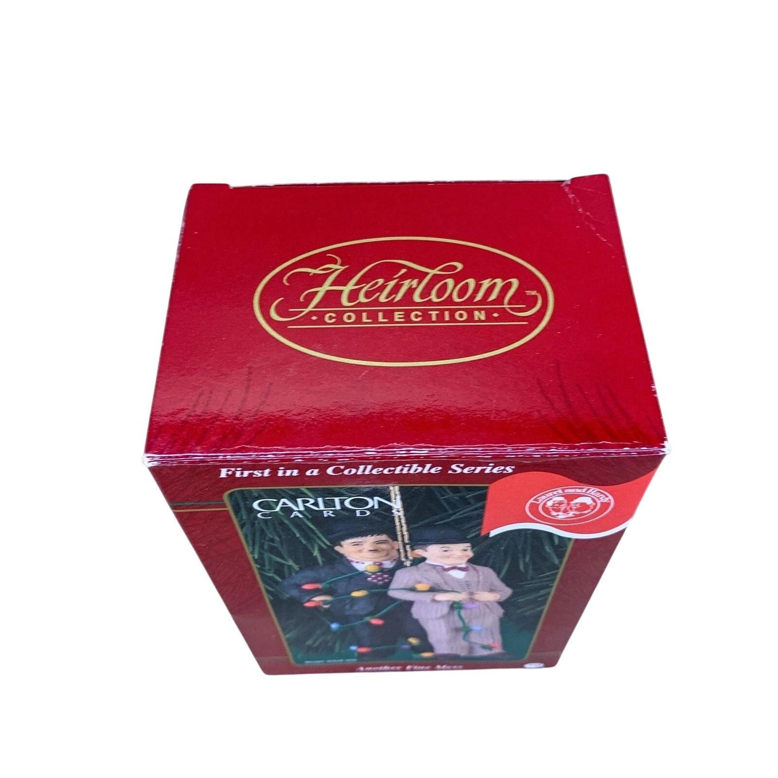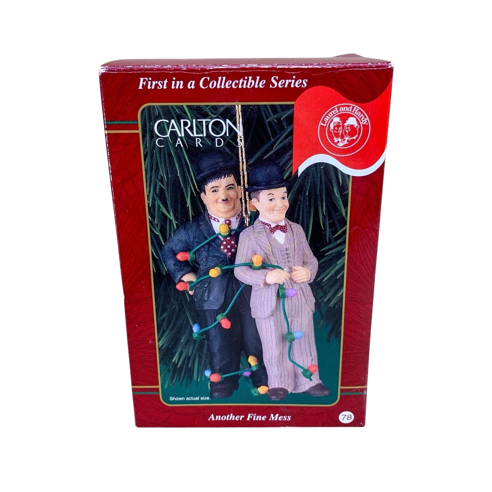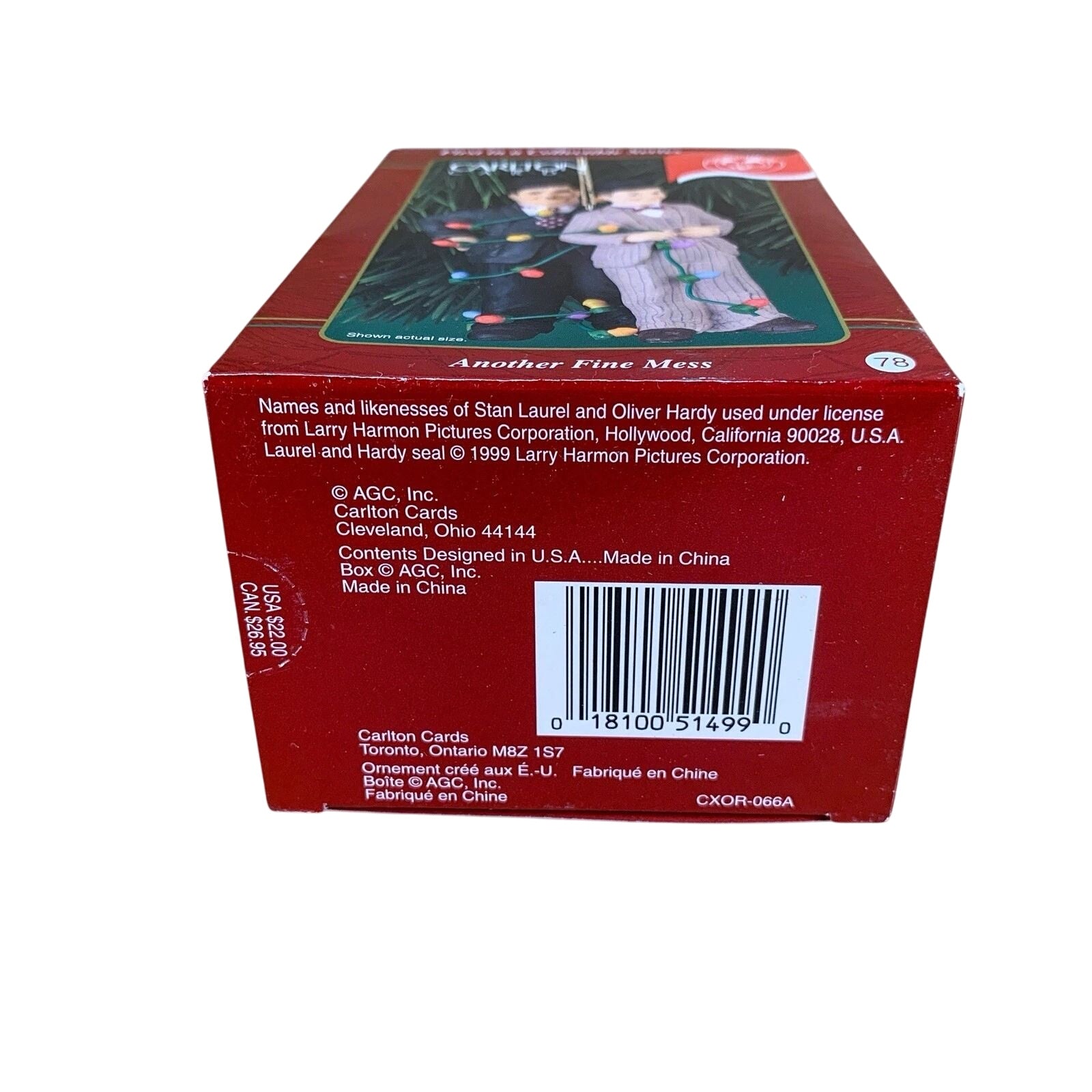 This collectible ornament features the iconic comedy duo Laurel & Hardy in holiday form, titled “Another Fine Mess,” part of Carlton Cards’ Heirloom series. Laurel and Hardy are depicted in their classic poses—one bewildered, the other exasperated—wearing festive winter gear and standing atop a colorful base that evokes comedic chaos in the season of cheer. Crafted in molded resin/plastic with hand-painted finish and fine detailing, it blends vintage film charm, nostalgia and holiday décor in one meaningful piece. Released in 1999, it appeals to movie-memorabilia collectors, vintage ornament enthusiasts and fans of classic comedy alike.