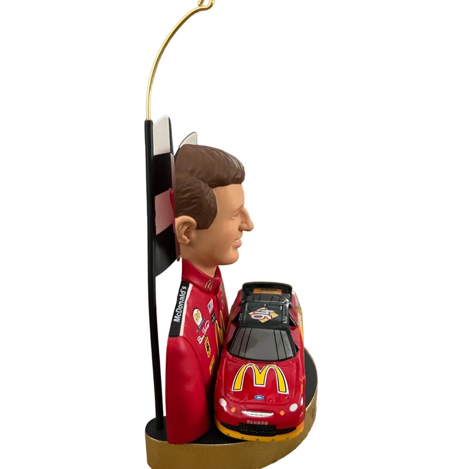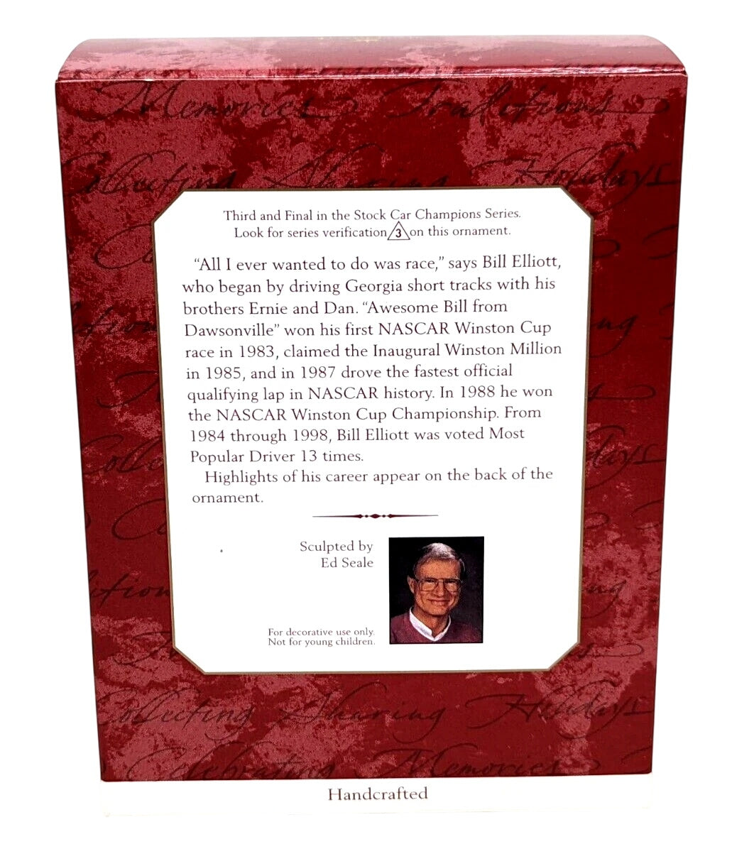 Celebrate the racing legend Bill Elliott with this 1999 Hallmark Keepsake ornament from the Stock Car Champions series. The ornament features Elliott’s #94 McDonald’s Ford Thunderbird in vibrant red, with career highlights on the back: his 1988 Winston Cup Championship, fastest qualifying lap in NASCAR history in 1987, the inaugural Winston Million in 1985, and his long streak as Most Popular Driver.
