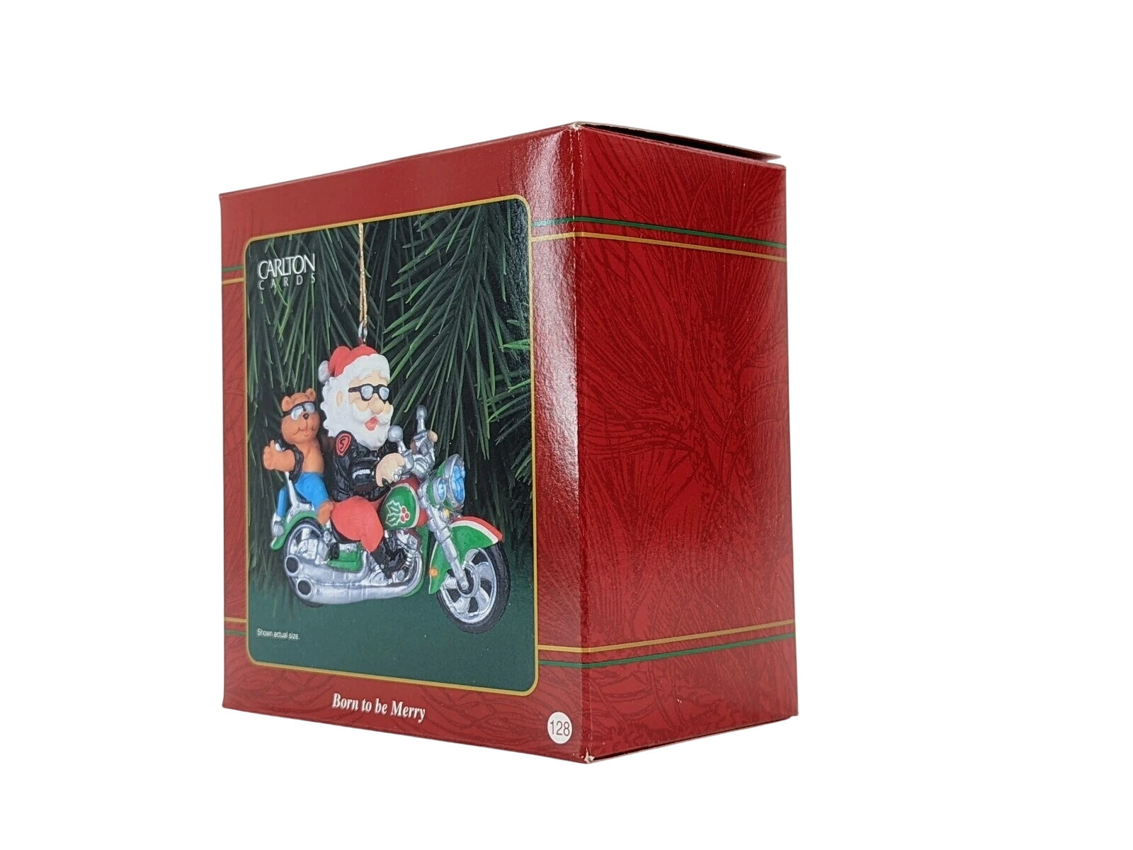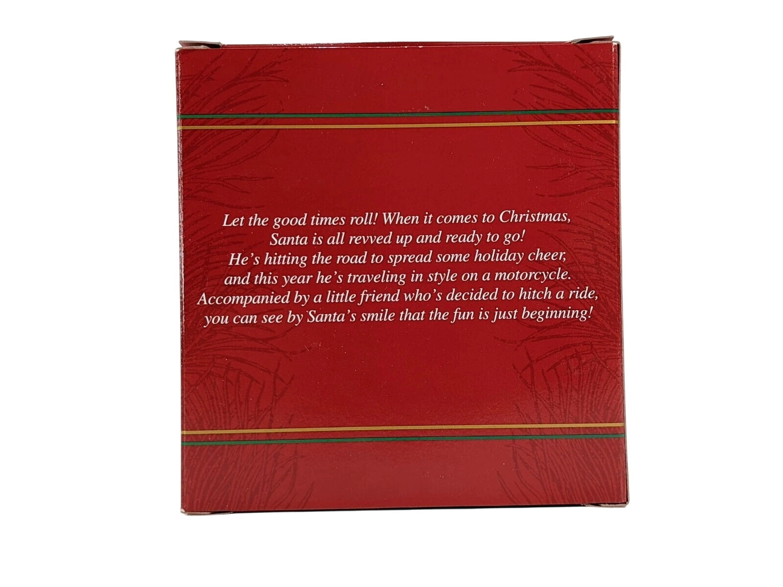 Add a high‑octane twist to your festive décor with the 1999 Born to Be Merry ornament from Carlton Cards’ Heirloom Collection. This playful resin and metal ornament features a leather‑clad Santa and his cheerful reindeer co‑riding a motorcycle, complete with peppermint-striped wheels and the motto “Born to Be Merry.” Brand new in box with molded clamshell and hang tag included—no batteries or cords required. Simply hang and let this holiday duo ride into your celebrations!