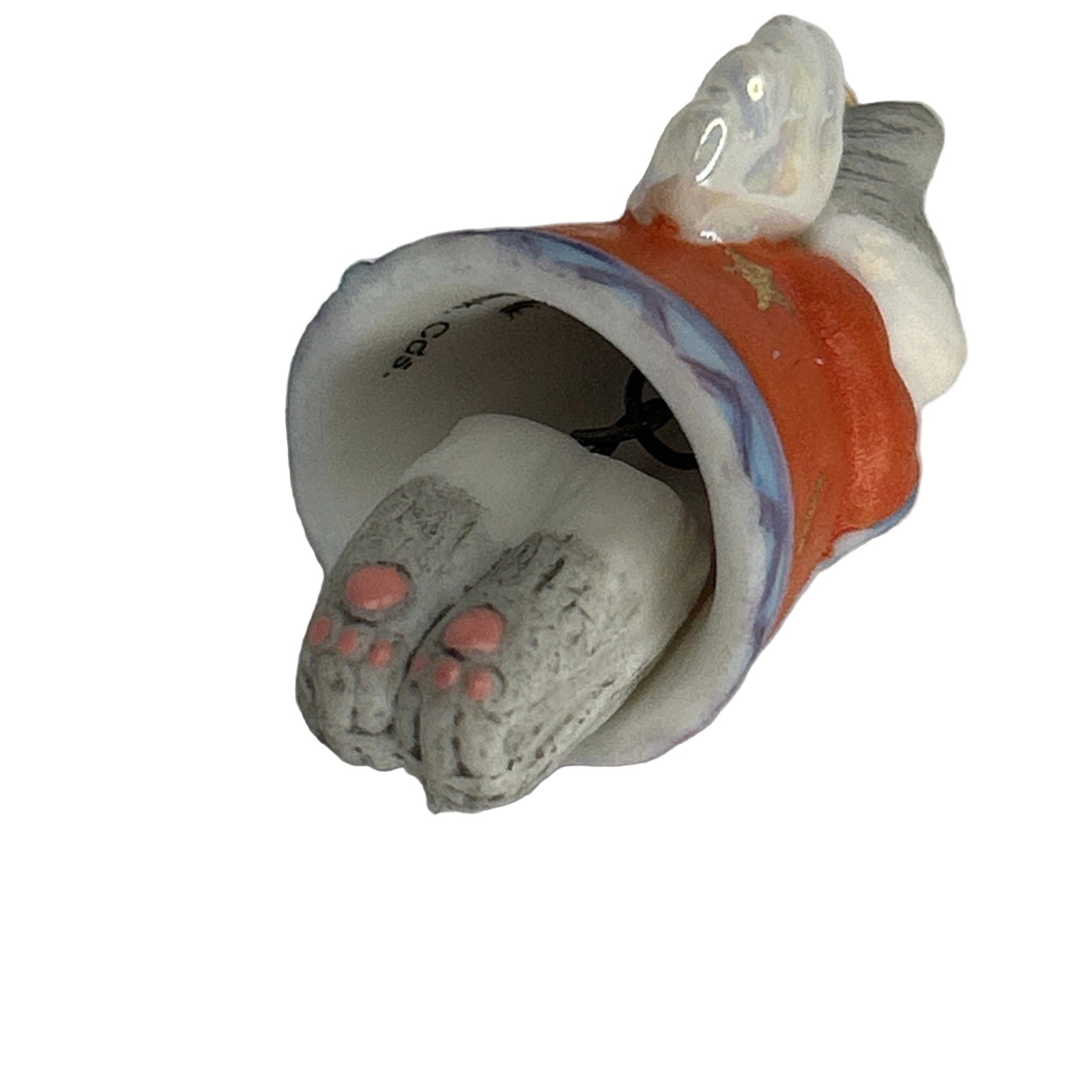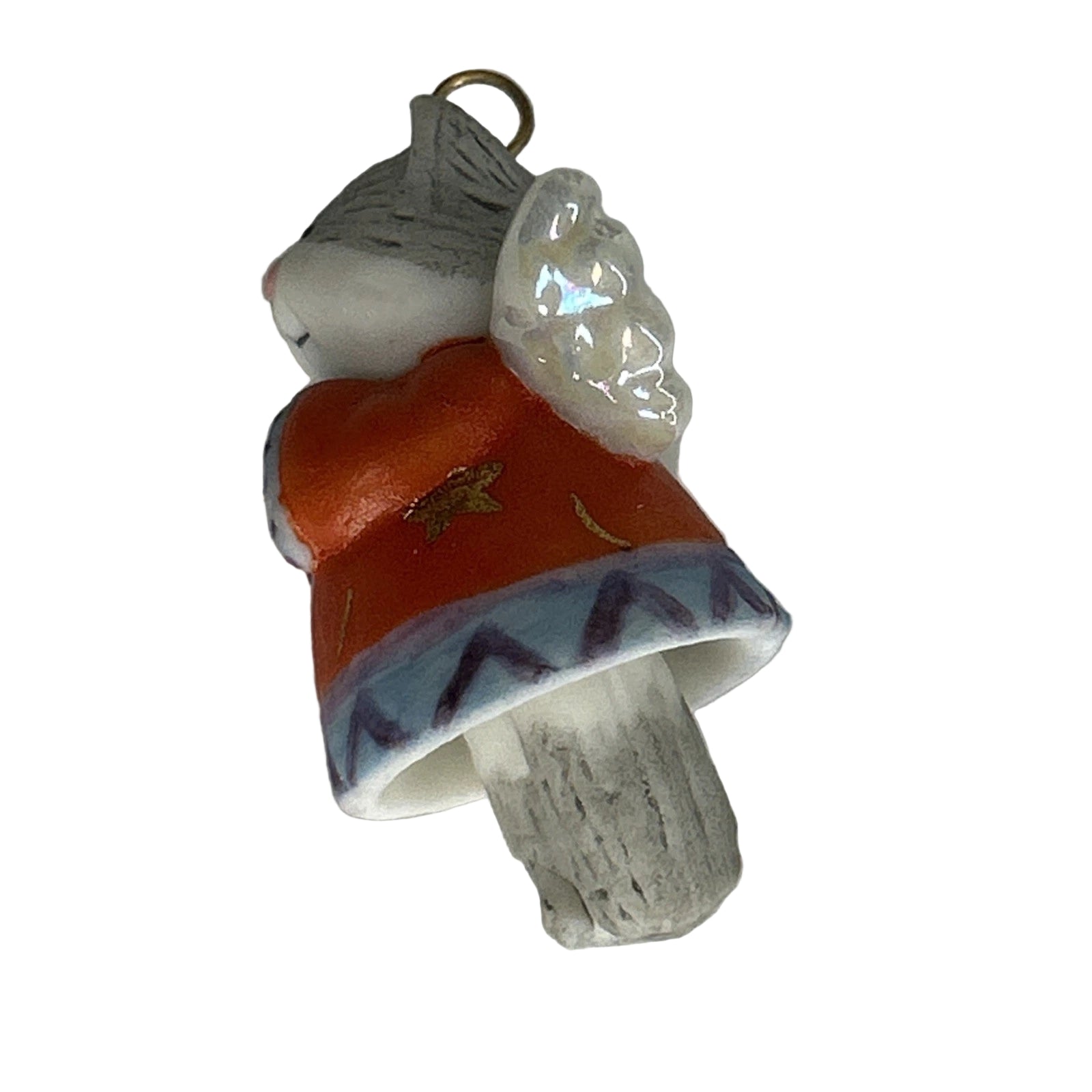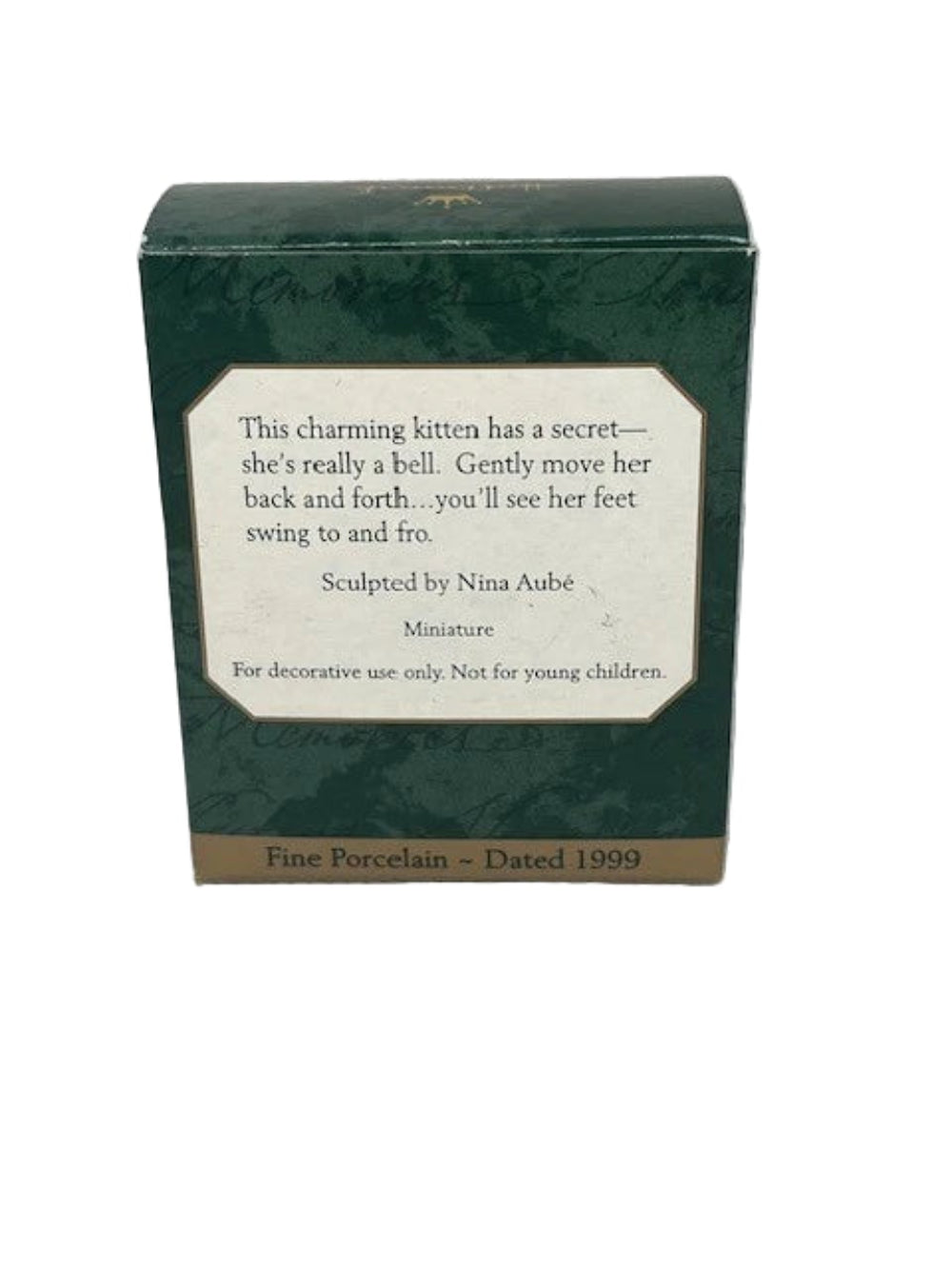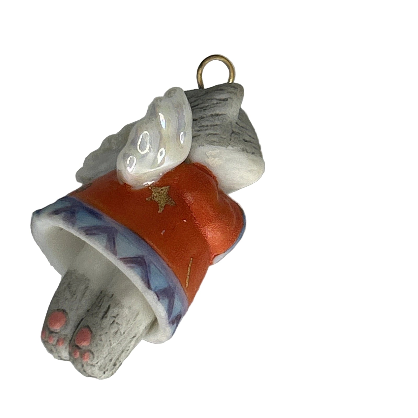 This 1999-dated miniature from the Hallmark Keepsake line features an angel-kitty with delicate wings, dressed in a star-and-moon-adorned robe in red and blue, perched atop a tiny bell that gently swings with motion. The kitten’s robe is beautifully embellished with celestial motifs, and on gently nudging the piece the feet swing back and forth, revealing the “bell” function of the ornament. Created by artist Nina Aubé, this porcelain figure blends whimsical pet-lover appeal with celestial angel imagery—ideal for kitty collectors, angel-theme displays or anyone collecting late-1990s Keepsake miniatures.