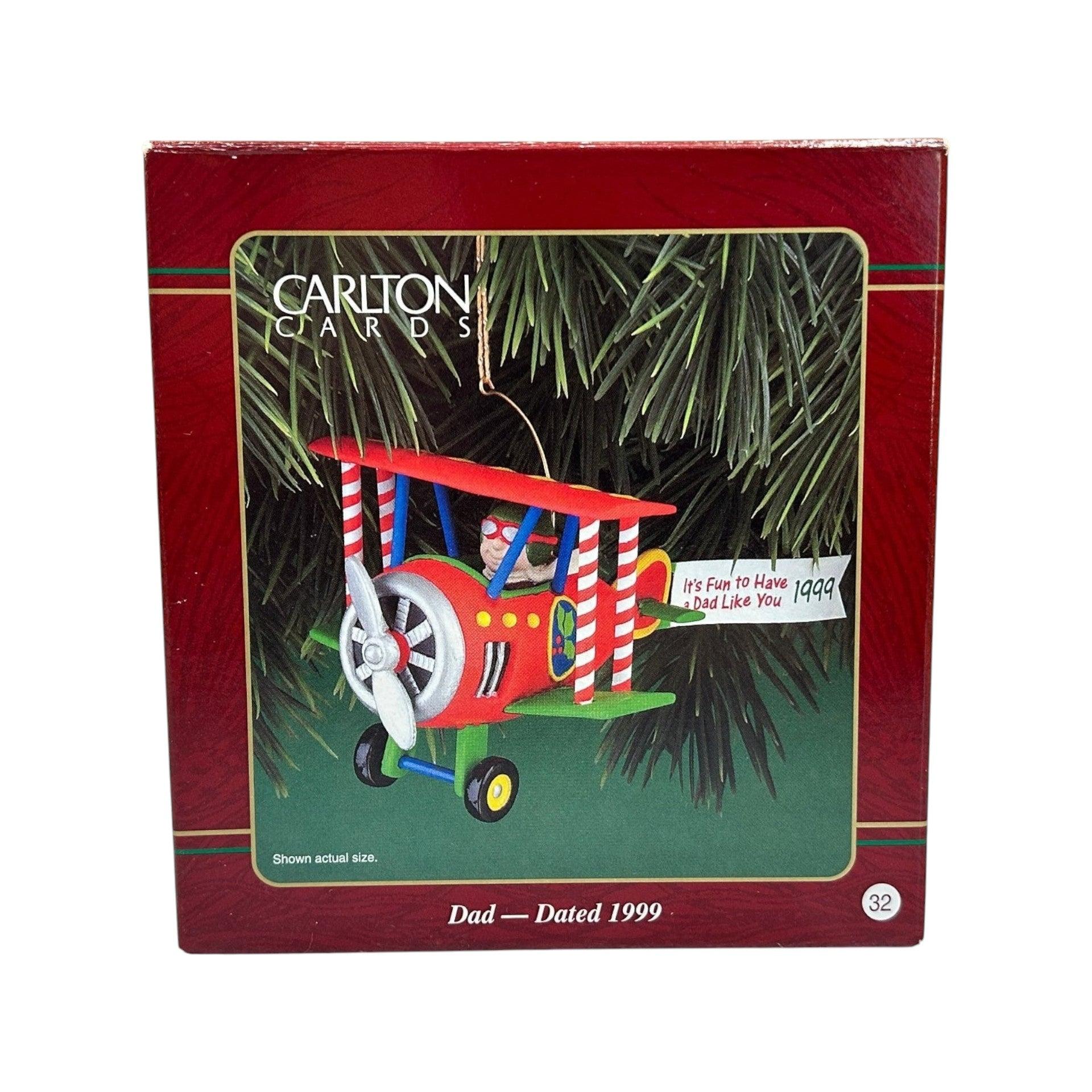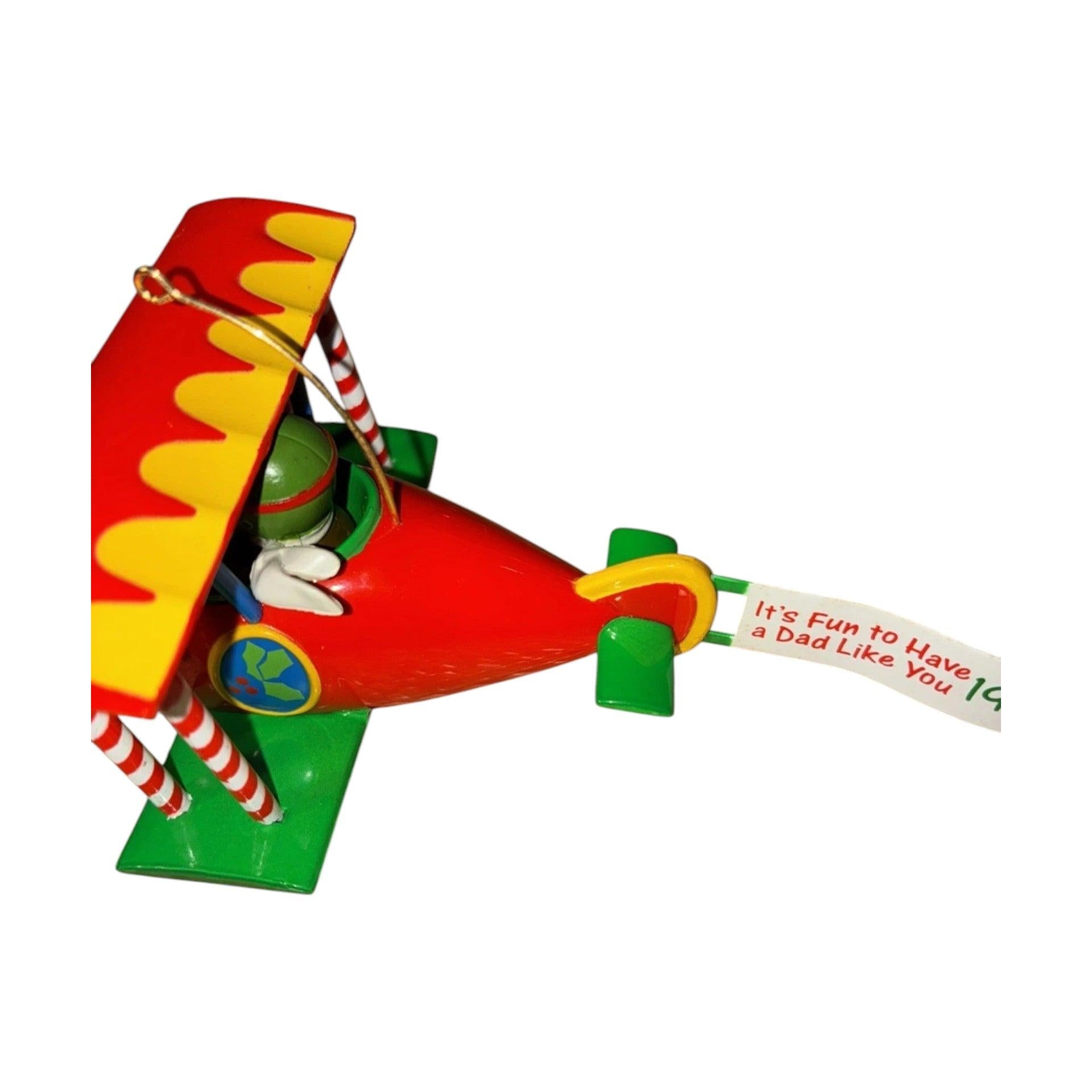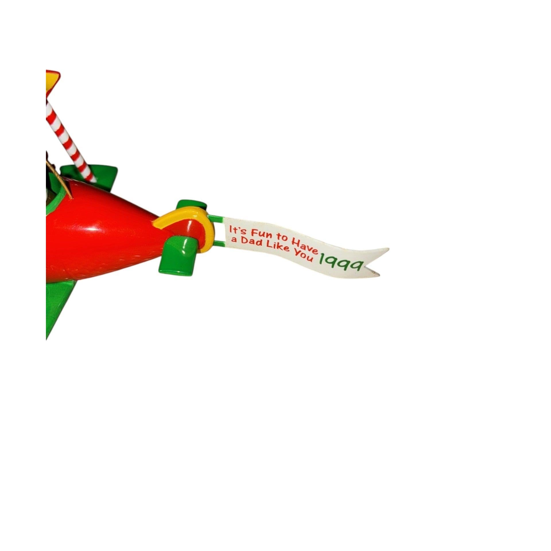This sentimental ornament from the 1999 Carlton Cards Heirloom “Family” series celebrates fatherhood with a unique design—depicting a festive biplane motif labeled Dad, perfect for a tree display honoring a father or father figure. The molded plastic/resin construction, painted in rich holiday colors and detailed with wings, a propeller and perhaps a “Dad” label, blends nostalgia, craftsmanship and familial sentiment. As a dated release with strong thematic appeal, it’s ideal for collectors of family-themed holiday décor and those seeking a meaningful keepsake for Dad.