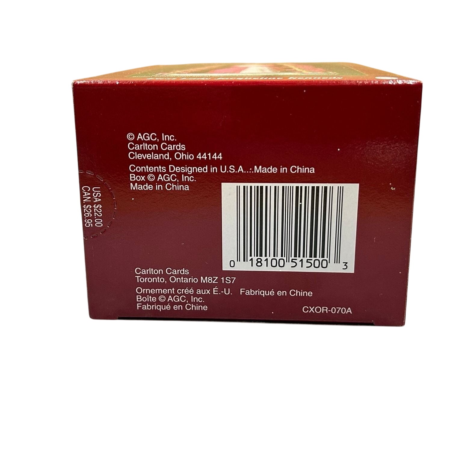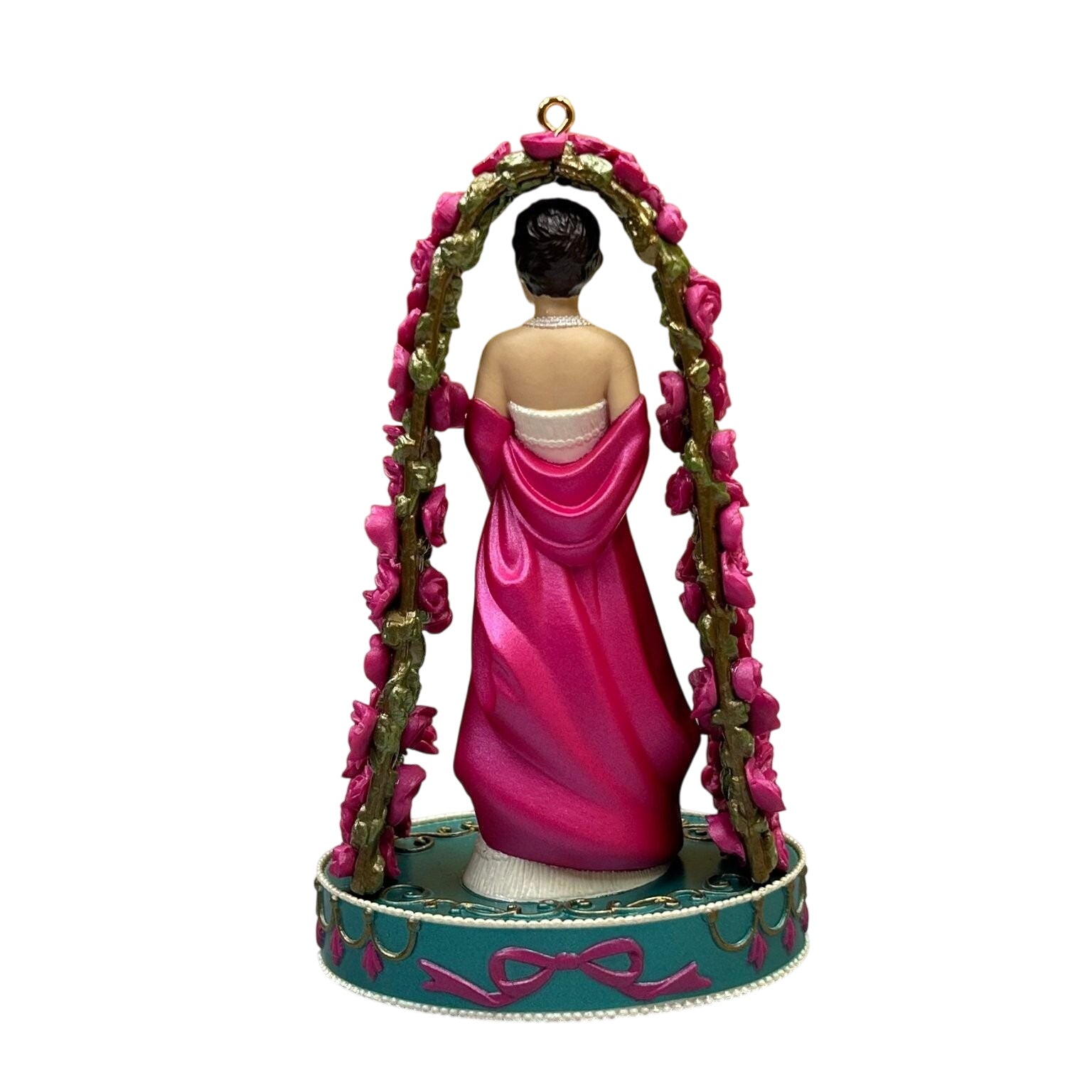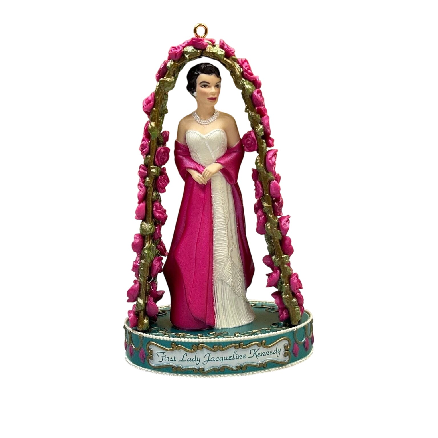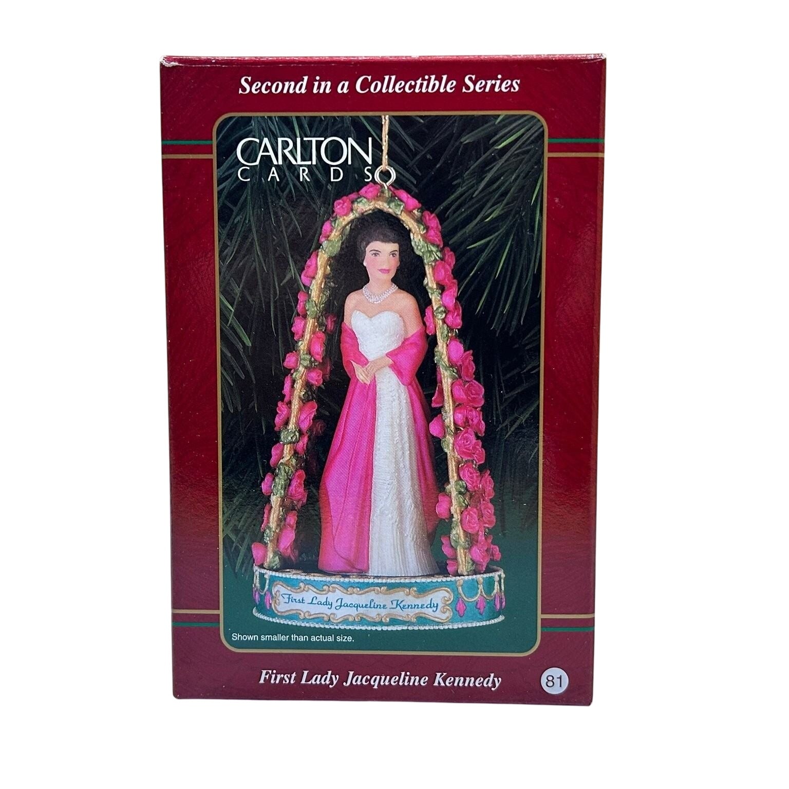 This distinguished ornament presents Jacqueline Kennedy in elegant patriotic styling as part of the “Famous Women in History” collection from Carlton Cards. Depicted in a graceful ball gown with stars-and-stripes accents, the figure embodies American history and refined holiday décor. The molded resin/plastic design features rich coloration, delicate detailing in the gown’s folds, and textured finish that appeals to both historical memorabilia and ornament collectors alike. Released in 1999, this piece offers a tasteful tribute to a beloved First Lady and is particularly suited for those who appreciate vintage holiday collectibles with a historical twist.