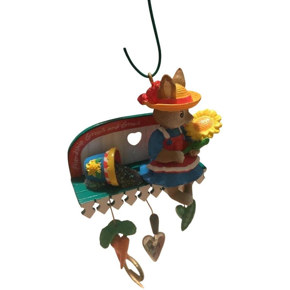 Celebrate friendship with this charming 1999 Carlton Cards “Friends” Bunny Gardener ornament. It depicts an adorable bunny dressed for gardening, seated on a bench adorned with tools, carrot accents, and even a trowel engraved with “1999” — and the sentiment "Friendship Grows and Grows" on the backrest. The package includes the original box in very good condition and the ornament itself in excellent vintage shape. No batteries or cords are required—this delightful piece is all about heartfelt nostalgia.