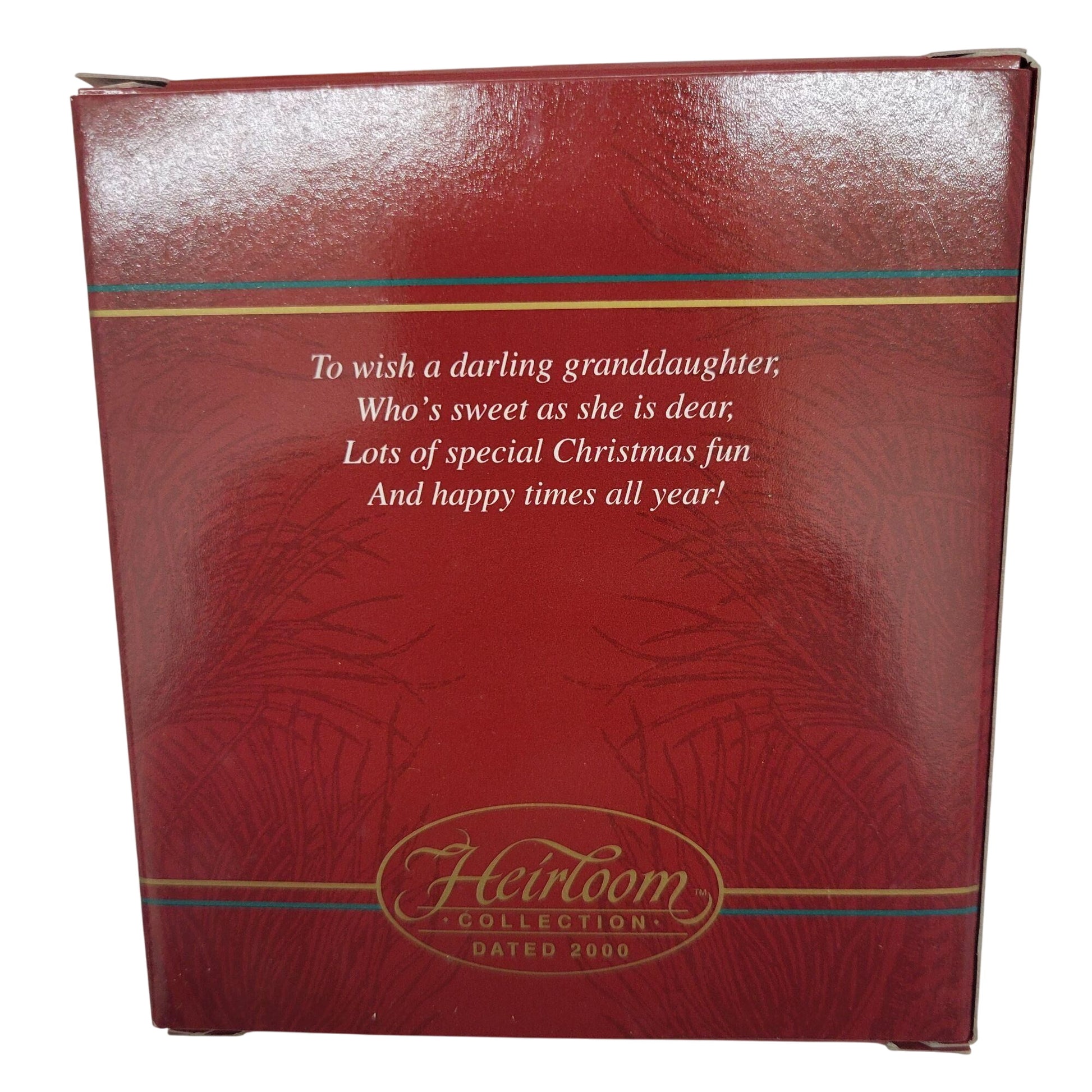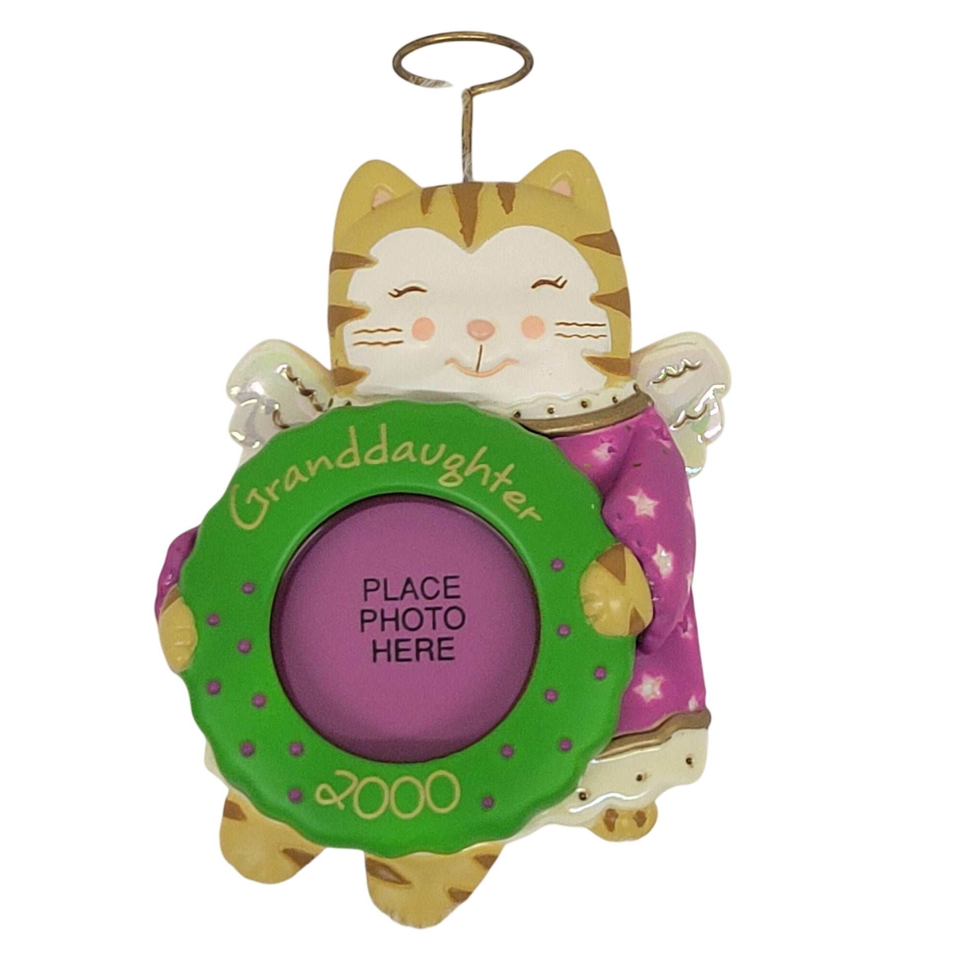 This heartfelt collectible ornament features a sweet kitten motif paired with the inscription “Granddaughter,” making it a meaningful gift or keepsake for a cherished granddaughter. Crafted in molded plastic with hand-painted detail, the kitten is shown in an adorable pose and may include a small photo-holder element for personalizing with a favorite snapshot. Its warm pastel colors and holiday accents combine to evoke both seasonal charm and family sentiment. Released in 1999 as part of the Heirloom collection, this piece is especially appealing to those seeking personalized ornament décor or kitten-themed collectibles.