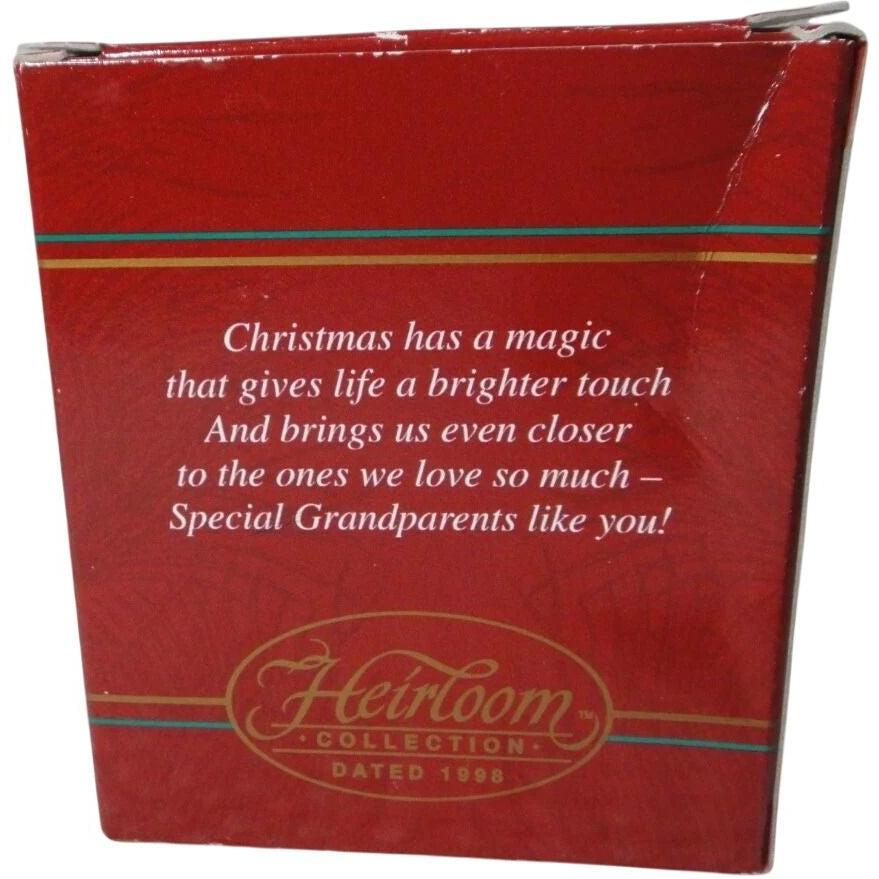 Capture the sweetness of family and holiday tradition with the 1999 GrandParents (Gingerbread) ornament from the Carlton Cards Heirloom Collection. This playful piece features a gingerbread-man conductor driving a candy trolley/cable-car filled with lollipops, candy canes and glittery festive detail. The rich multicolor finish, glitter accents and charming motif make it ideal for holiday décor that honors grandparents, family connection and whimsical design. With its clear 1999 date and variant SKU CXOR-036A, it holds collectible appeal for both family-theme ornament fans and vintage holiday decor collectors.