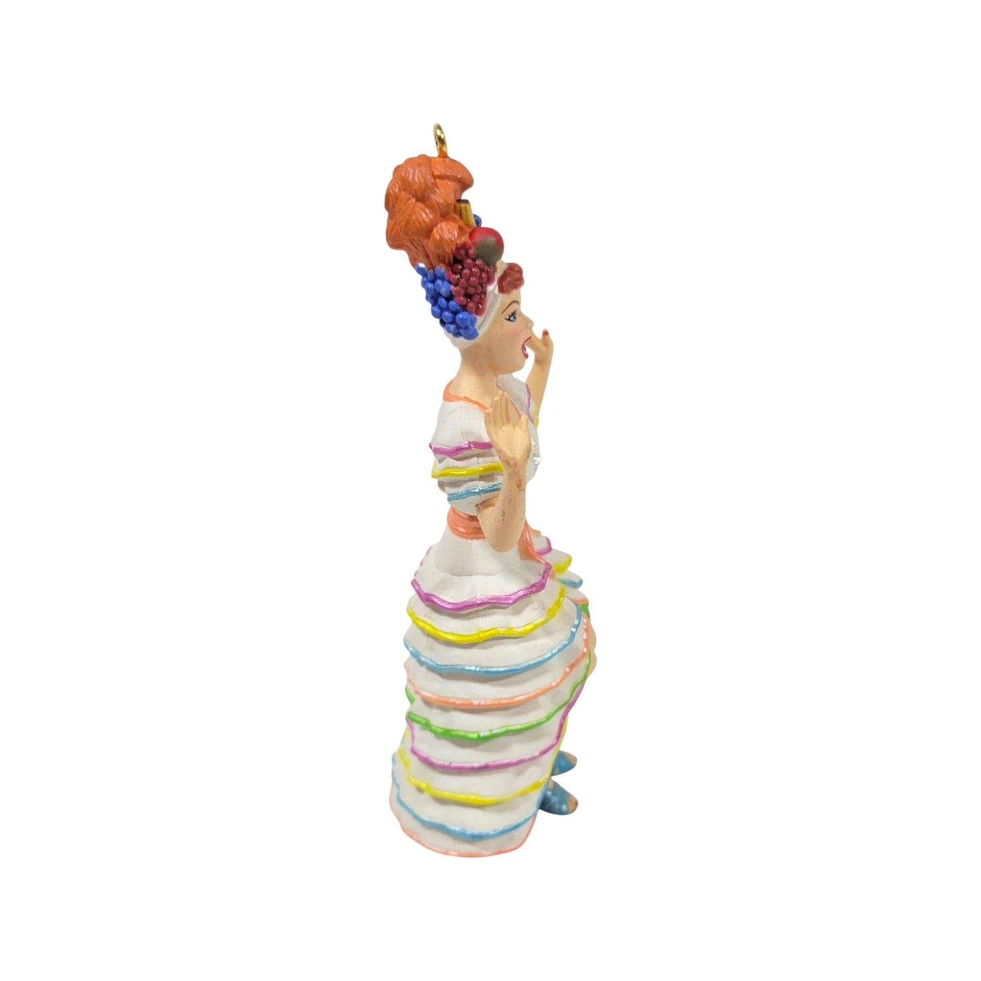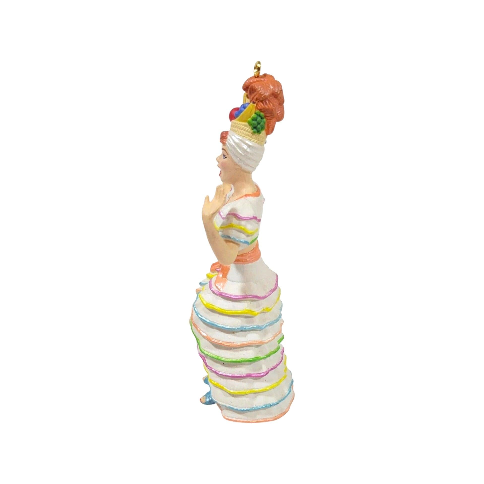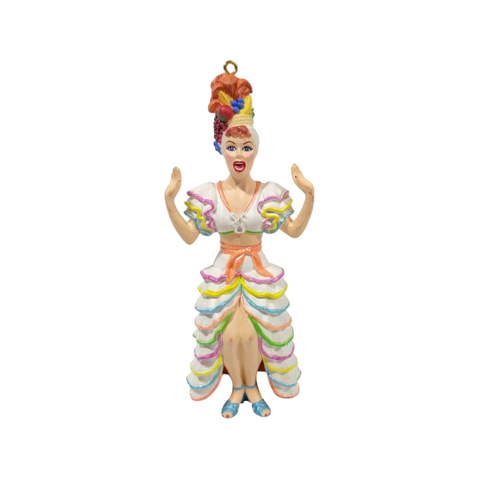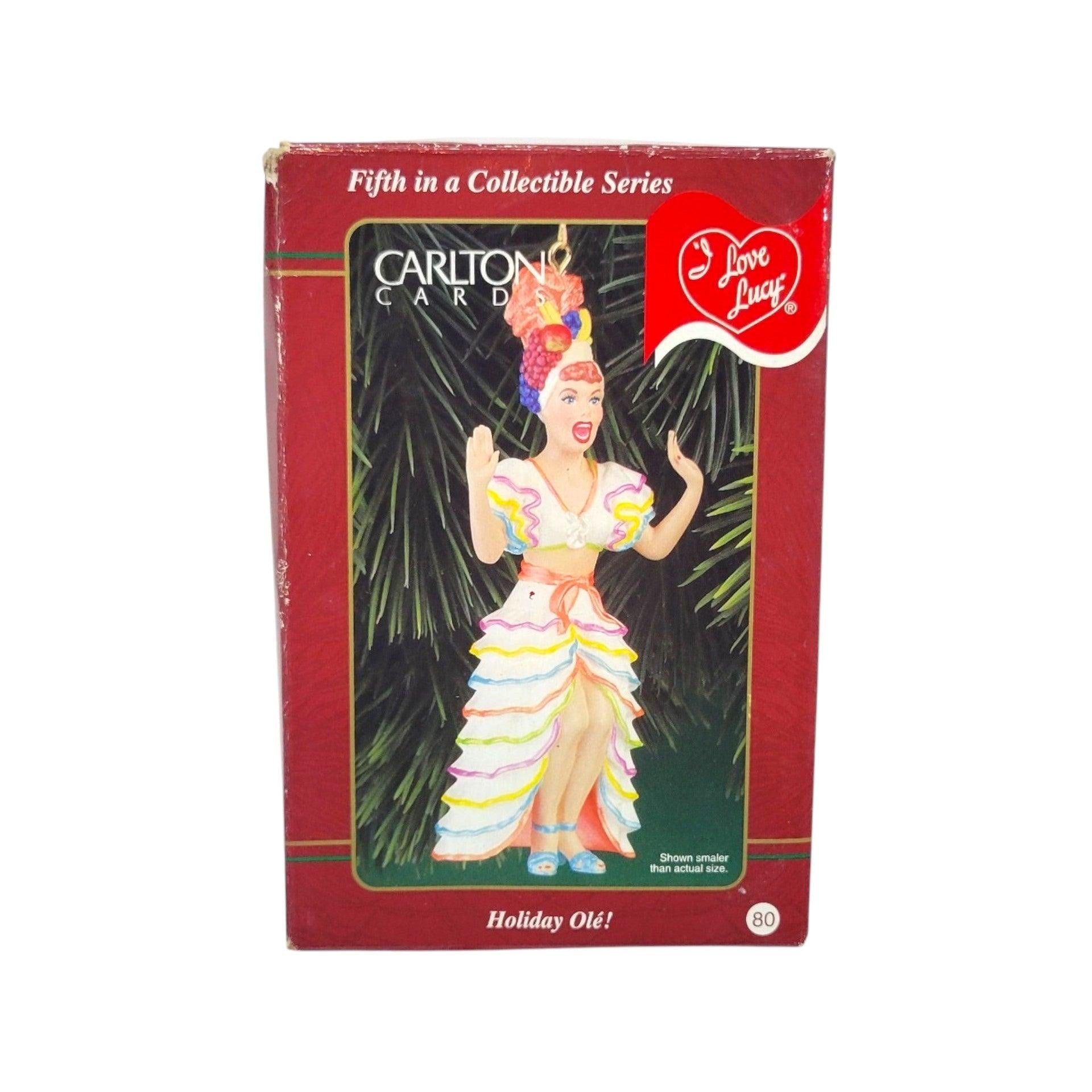 This charming 1999-era “Holiday Olé!” ornament features the iconic I Love Lucy star Lucille Ball (as Lucy Ricardo) in a festive Carmen Miranda–inspired pose, complete with tropical fruit hat and cheerful holiday flair. Crafted with vivid colours, playful motion and fine detailing, it blends mid-century TV nostalgia with collectible Christmas décor appeal. Designed for the collector-club series by Carlton Cards, it stands out for its licensed character, lively design and decorative charm. A delightful addition for fans of classic television, vintage ornaments and holiday pop culture alike.