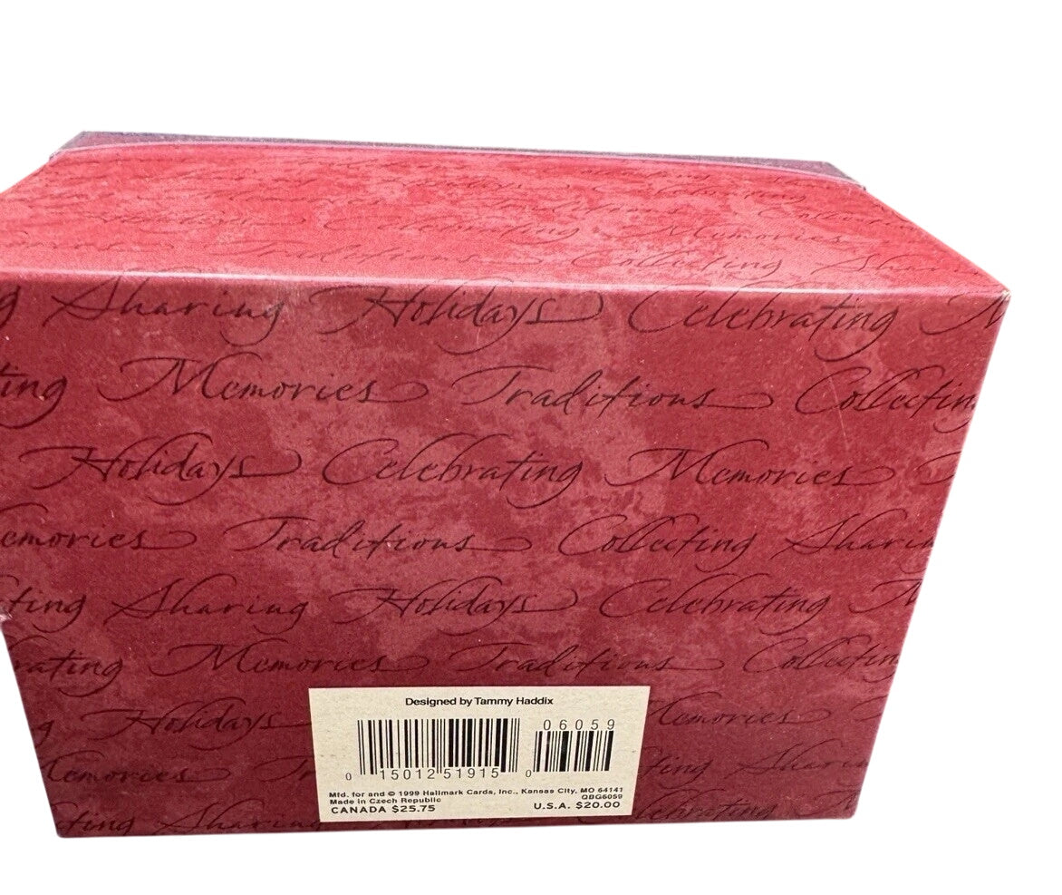 The 1999 Jolly Snowman is a delightful blown glass ornament from Hallmark’s Crown Reflections collection. This cheerful snowman is dressed in a red winter hat and green vest, carrying a bright pink holiday package. With its sparkling details and nostalgic design, it captures the joy of the season perfectly. Created by artist Tammy Haddix, the ornament stands approximately 4 inches tall and comes in its original Hallmark packaging.