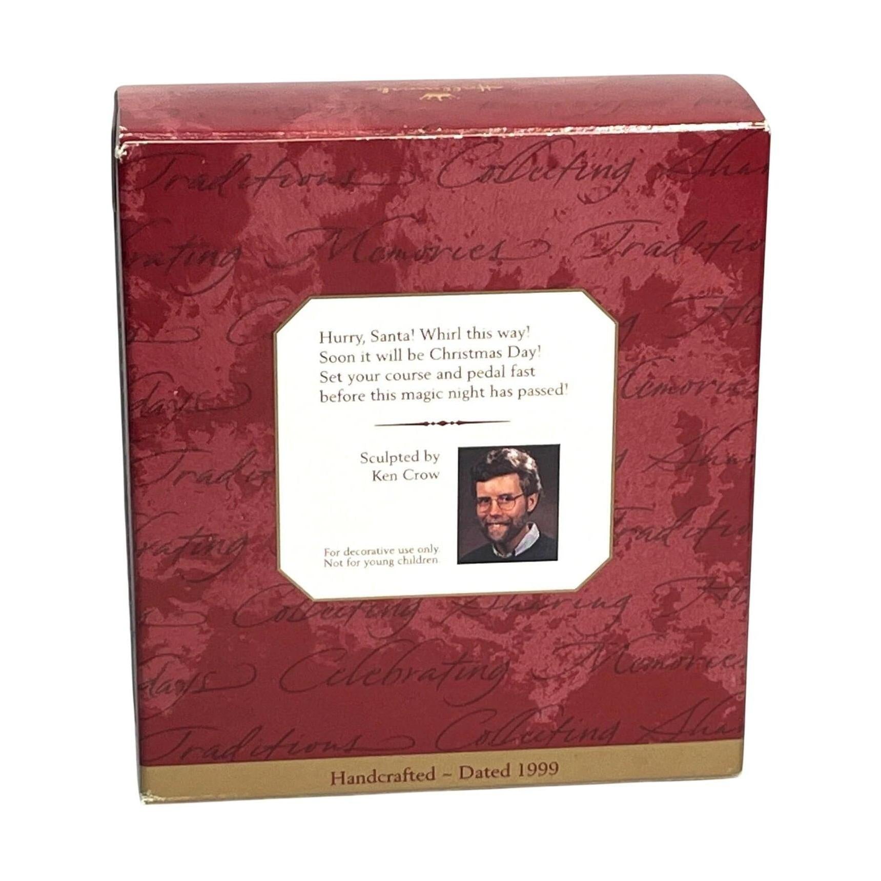 The 1999 Kringle’s Whirligig (QX6847) from the Hallmark Keepsake line is a festive depiction of Santa Claus pedalling a vintage-style whirligig bicycle, complete with a large front “wheel” that actually turns. Painted in cheerful holiday red, green and gold tones, the ornament also includes whimsical detailing—Santa in mid-journey, racing toward Christmas Day. The turning front wheel adds motion and visual interest, making it a standout piece for late-1990s collectors or Santa/transport themed ornament collections. The generous size and dynamic design mean this isn’t just subtle—it’s a fun display piece with vintage charm.