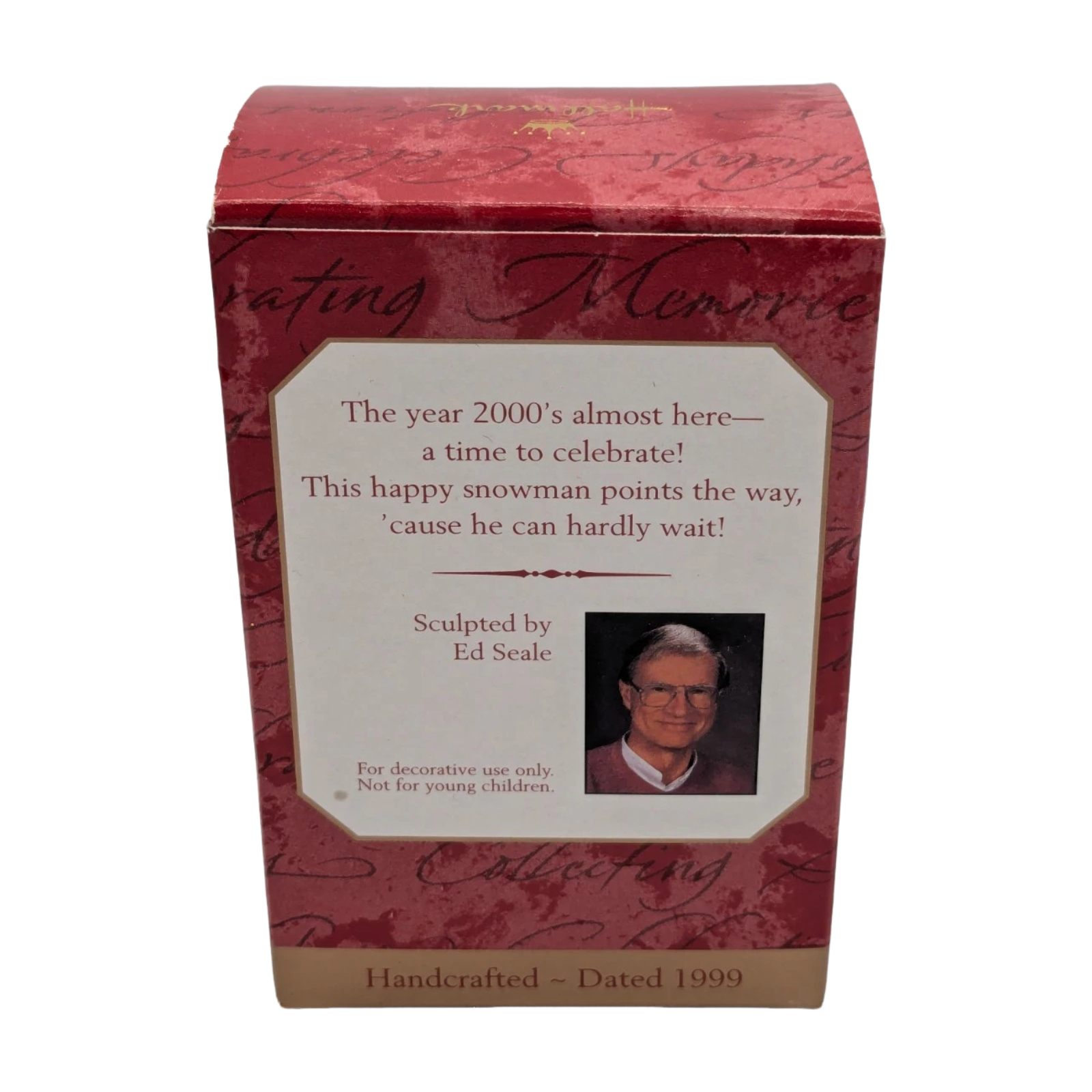 This 1999-dated ornament from the Hallmark Keepsake series celebrates the turn of the millennium with a cheerful snowman tipping his top hat beside a sign reading “Hats off to a new millennium 1999-2000.” The snowman wears a red scarf and green ear-muffs, and the crisp multicolour design gives it both festive charm and commemorative value. Compact yet meaningful, it makes an ideal addition for New Year’s or snowman-themed collections, and holds particular appeal to late-1990s Keepsake collectors.