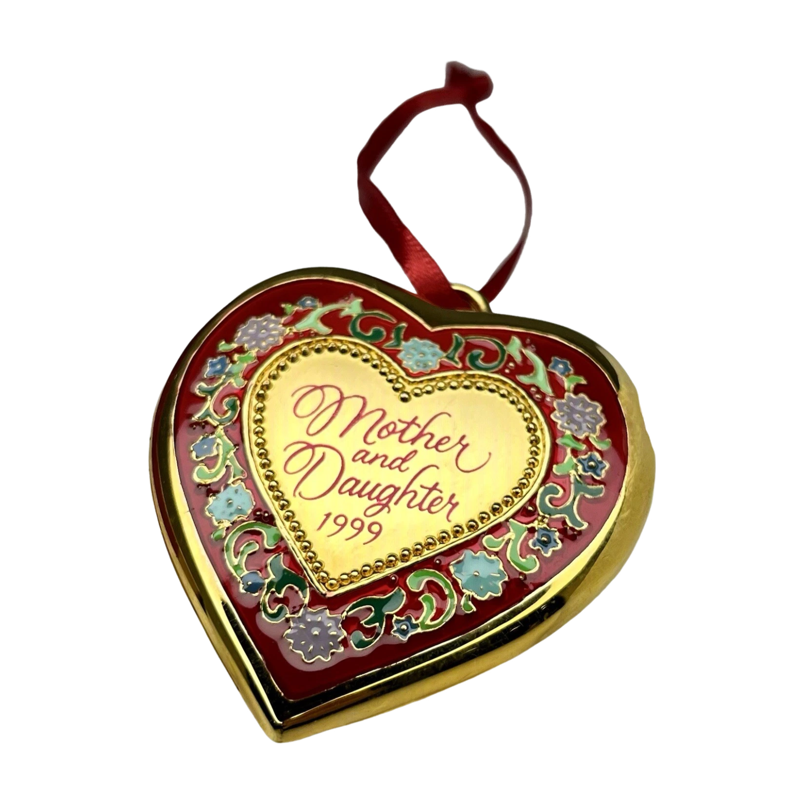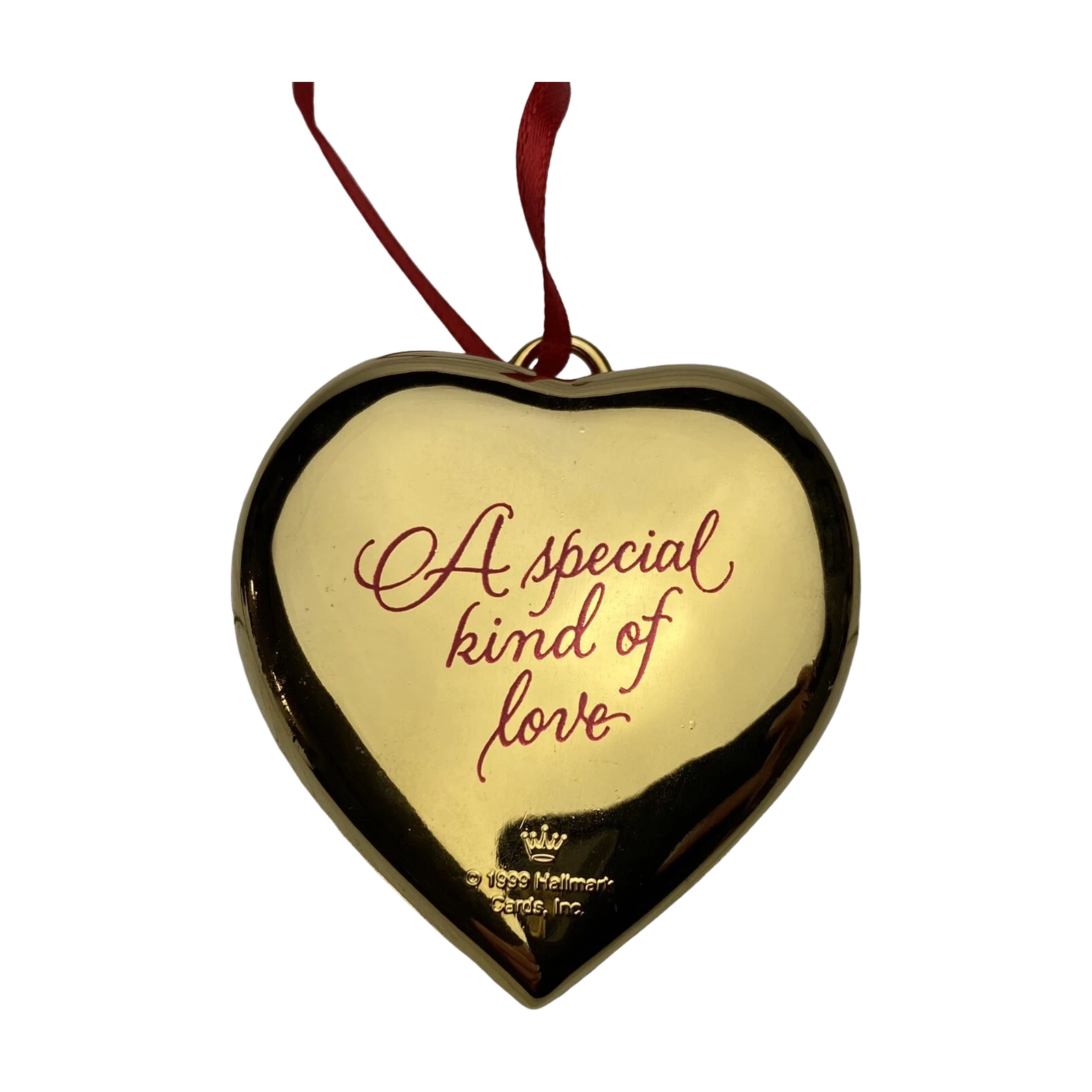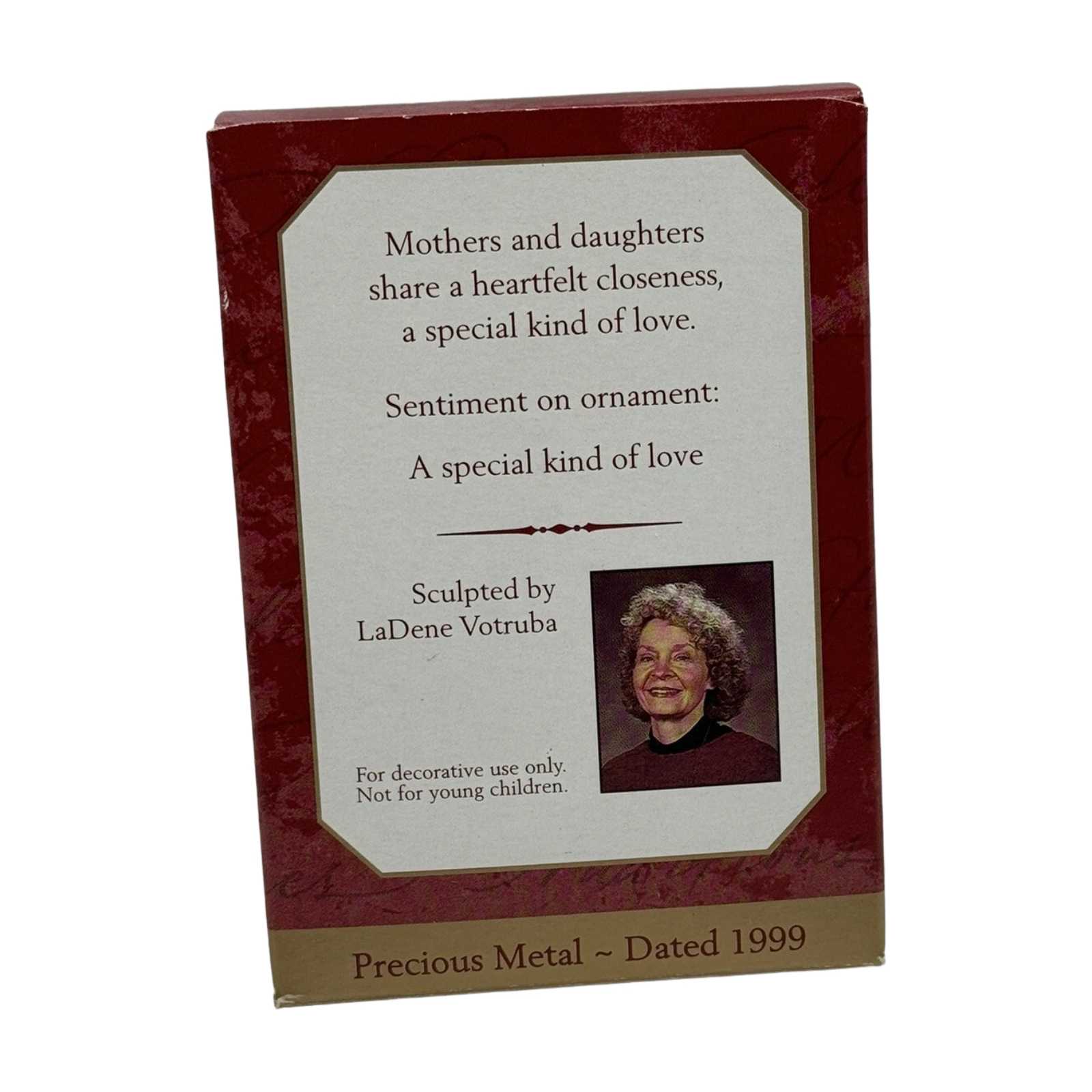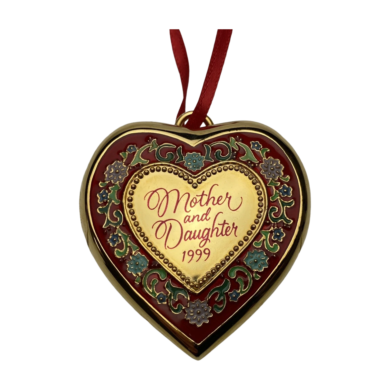 Celebrate the special bond of motherhood with this elegant heart-shaped ornament dated 1999, crafted with a precious-metal finish and suspended from a red ribbon. The front is inscribed “Mother and Daughter 1999,” while the back bears the sentiment “A Special Kind of Love.” Hand-painted floral motifs frame the heart, adding a warm, festive touch ideal for holiday displays or family collections. With its compact size and timeless sentiment, this piece makes a meaningful gift for mothers, daughters, or collectors of sentimental Keepsakes.