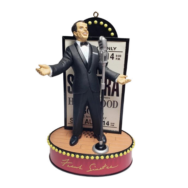Celebrate the legendary voice of Sinatra with the 1999 Ol’ Blue Eyes – Frank Sinatra musical ornament from Carlton Cards’ Heirloom Collection. This finely crafted resin figure features Sinatra in a tuxedo, belt microphone in hand, evoking his smooth crooner style. It plays "Christmas Waltz" when activated, powered by included AAA batteries. Arrives mint-in-box, complete with molded clamshell and hang tag—no cords required. Just hang and let the music play!