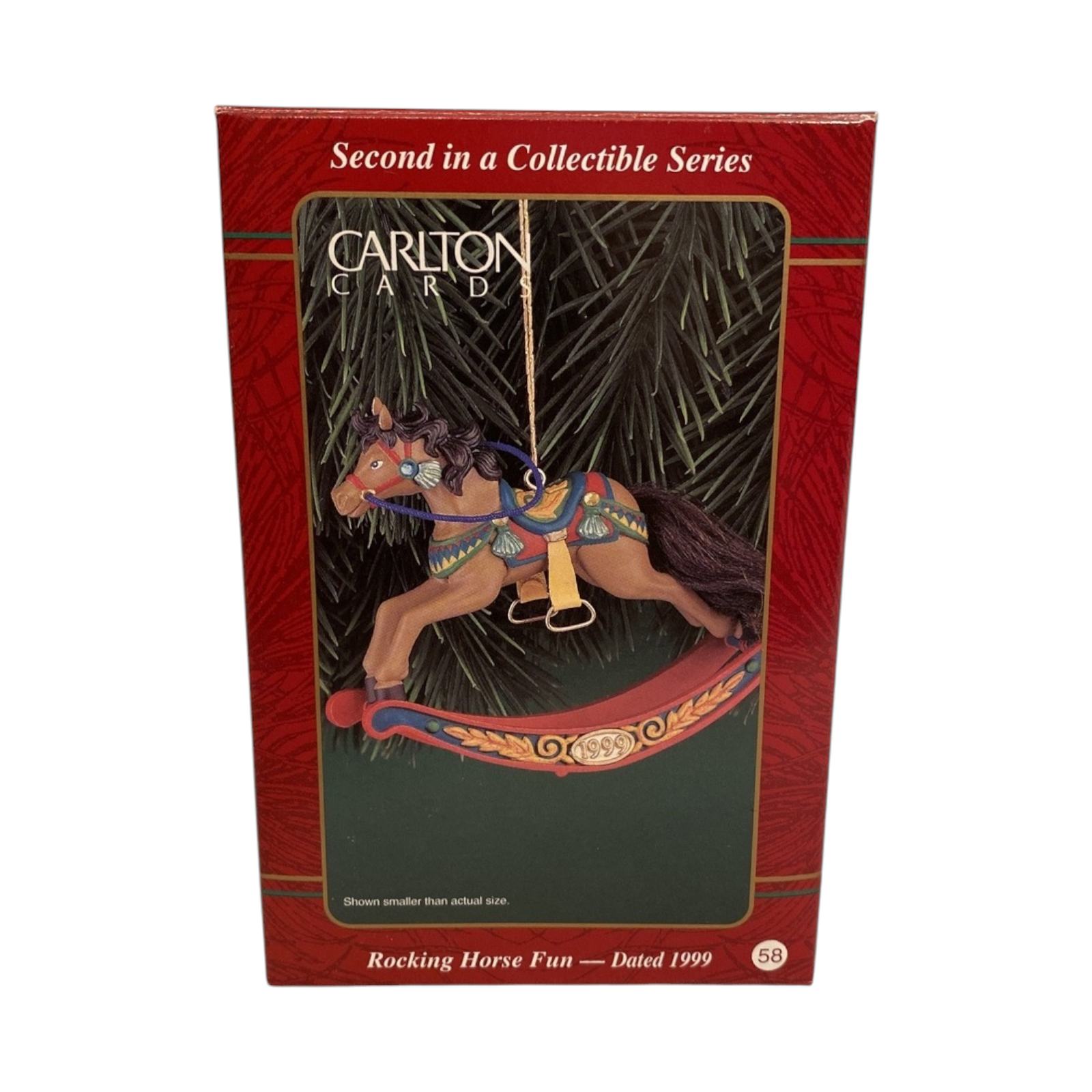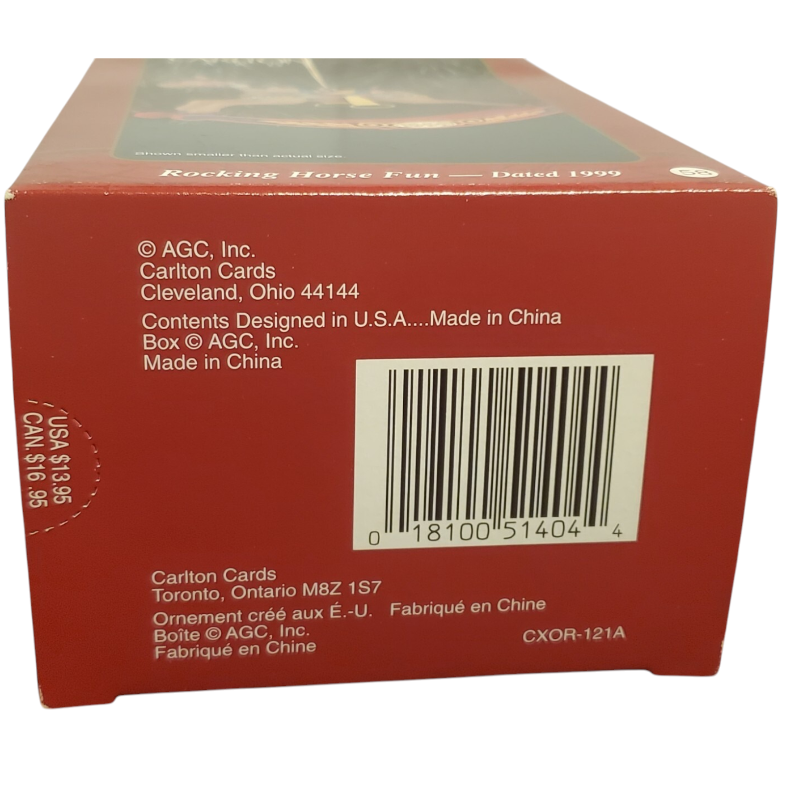 Celebrate vintage holiday style with the 1999 Old-Fashioned Fun (Rocking Horse) ornament from the Carlton Cards Heirloom collection. This charming design features a classic rocking horse motif in nostalgic colors, detailed with a saddle and flowing mane—evoking childhood memories of simpler times. The ornament’s sculpted form and festive finish make it a standout addition to any tree or display, especially for collectors of toy-themed or retro-style ornaments. With the clear year mark of 1999 and the variant SKU CXOR-138A, it offers both decorative appeal and collectible significance.
