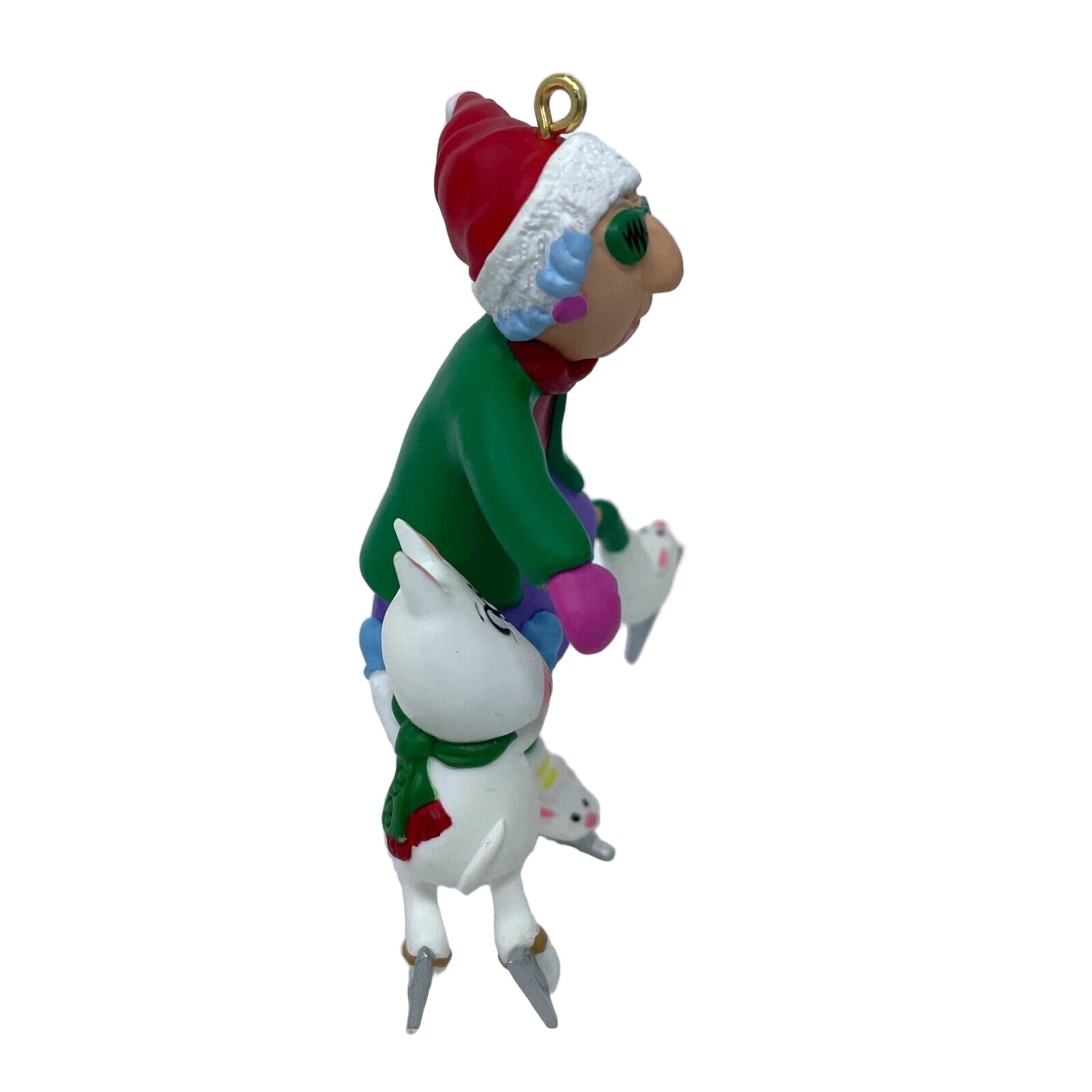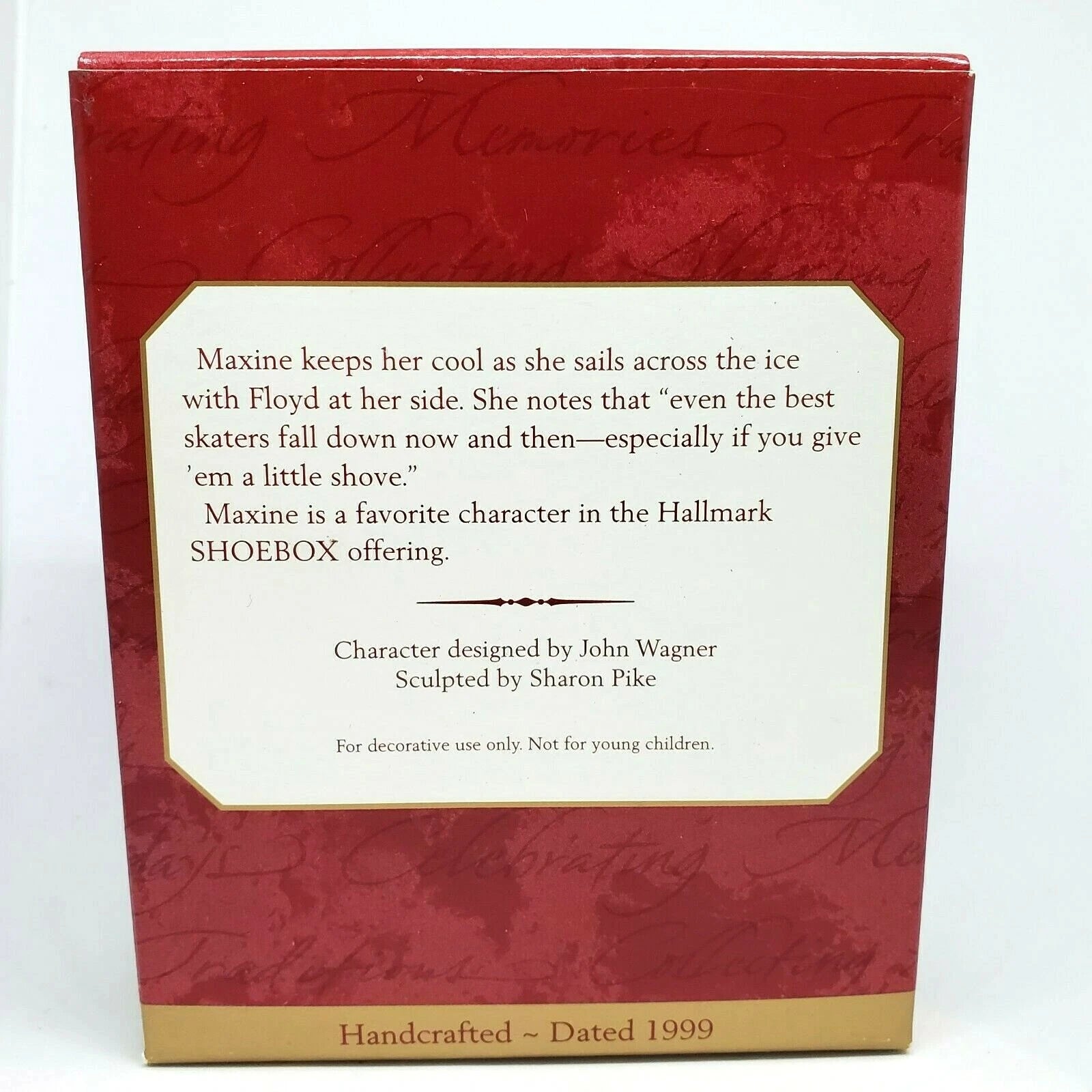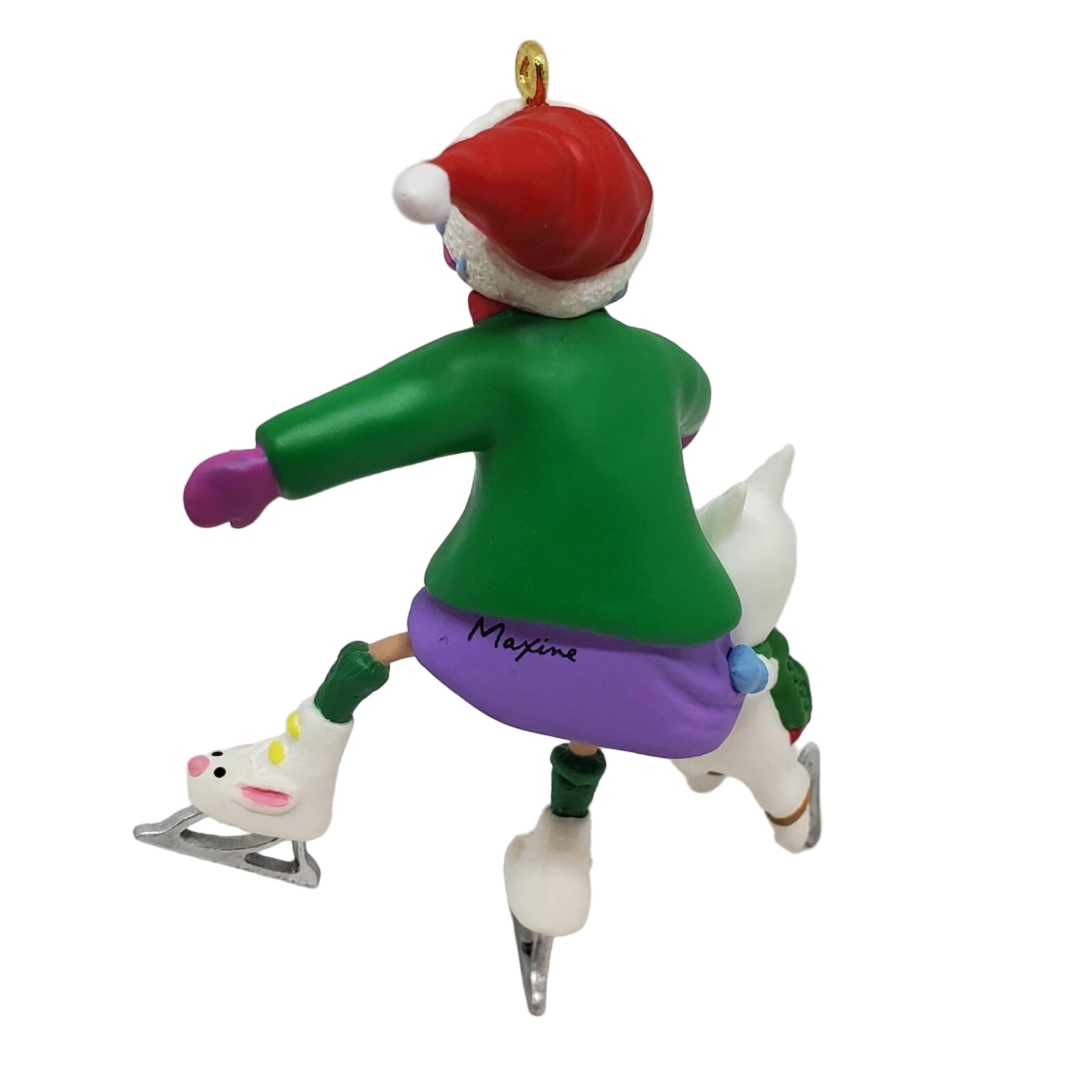 Maxine tries her luck on ice-skating in On Thin Ice, a 1999 Keepsake ornament showing her and her dog Floyd lacing up skates to glide across a frozen pond. With icy humor and expressive detail, this ornament captures her classic attitude and charm. The mixed-material design is multicolored, comes in its original box, and requires no batteries or cords—just hang it and let the frosty fun begin.