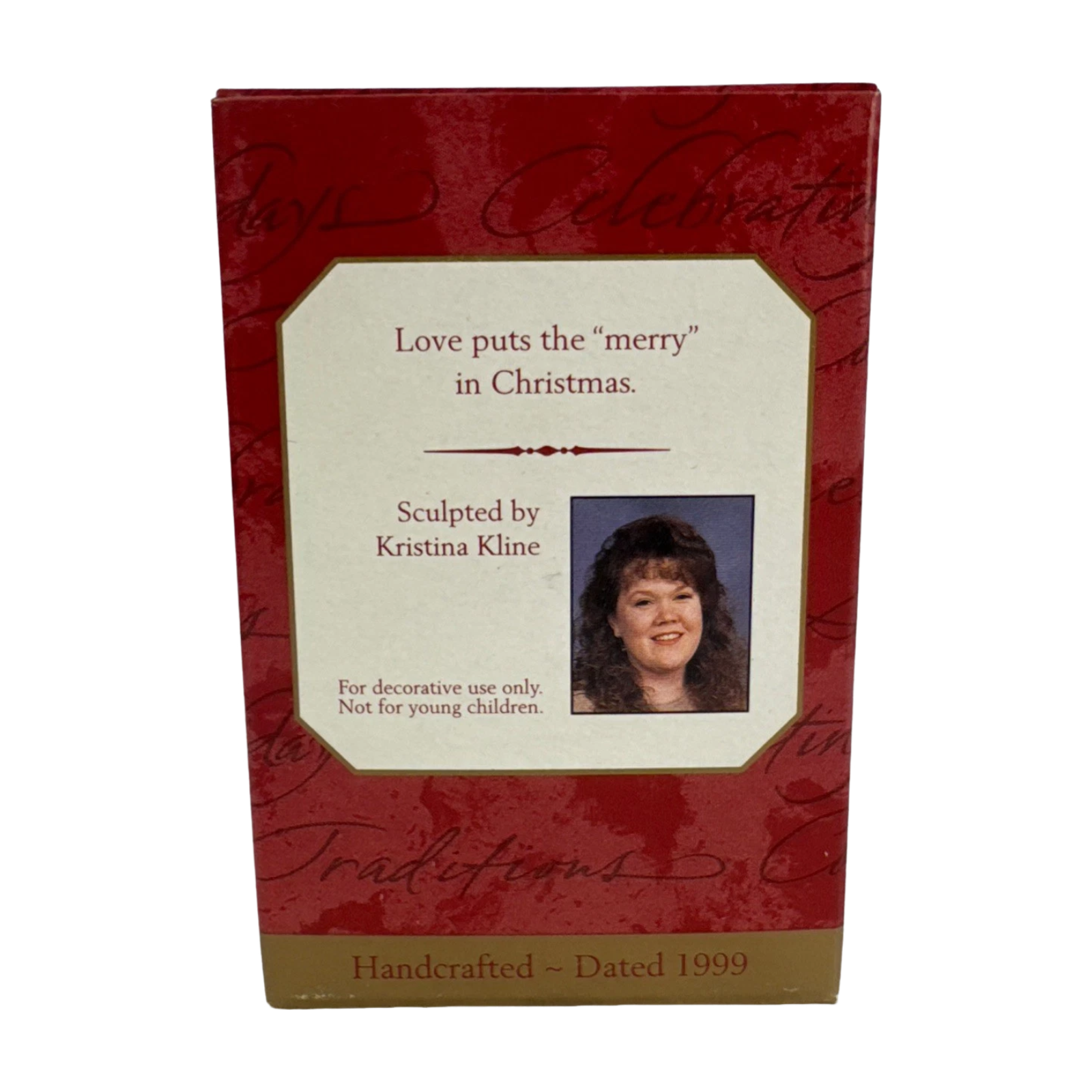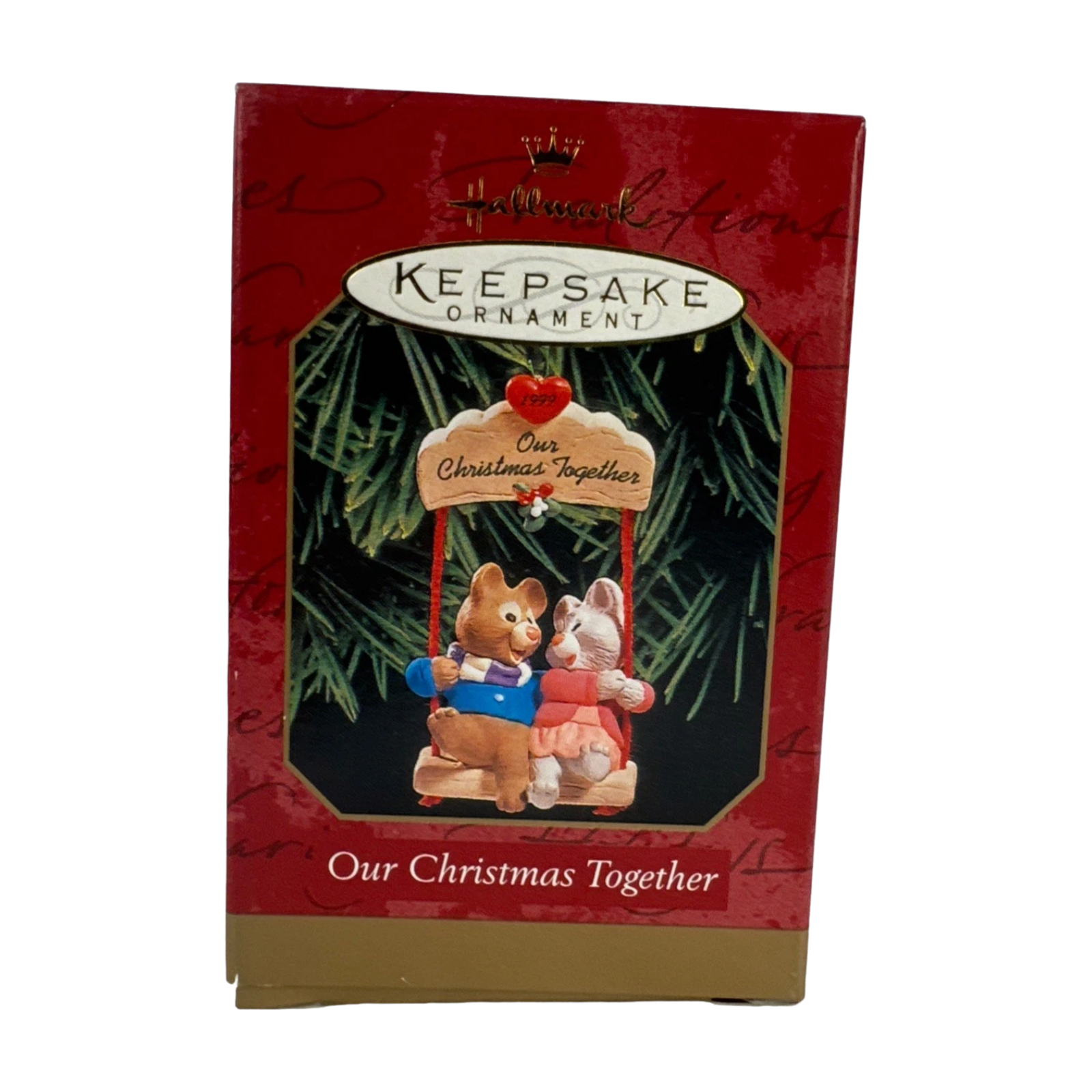 This heart-warming 1999 edition of the Hallmark Keepsake ornament features two charming mice seated together on a swing beneath a festive sign that reads “Our Christmas Together.” The sign itself bears a bold “1999” and is adorned with a bright red heart and hanging mistletoe, symbolizing love and holiday togetherness. Sculpted and hand-painted with fine detail by artist Kristina Kline, the piece uses vibrant winter colors and includes delicate textures that bring the scene to life. With its sentimental theme and modest size (approx. 2.47″ H × 1.55″ W × 1.12″ D) it is an ideal choice for couples, commemorative Christmas décor, or collectors of late-1990s Keepsake ornaments.