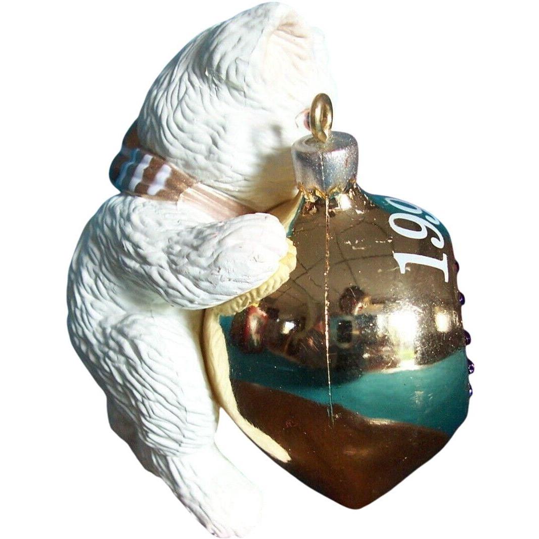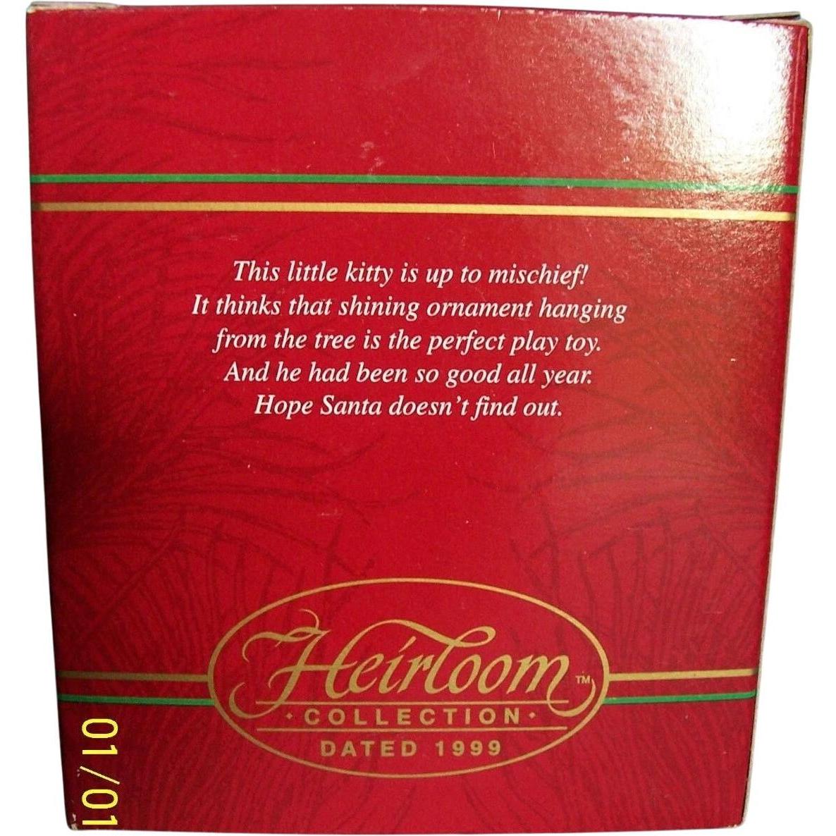 This adorable collectible ornament features a playful kitten clinging to a shiny gold ball ornament, part of the “Purr-fect Holidays” series. The design blends cheerful feline charm with holiday sparkle—capturing the kitten in a delightful pose with rich hand-painted detail and a festive finish. Crafted in durable molded plastic with fine detailing, this piece appeals to both cat-lovers and vintage ornament collectors alike. Released in 1999, it stands as a sweet seasonal accent with nostalgic appeal.