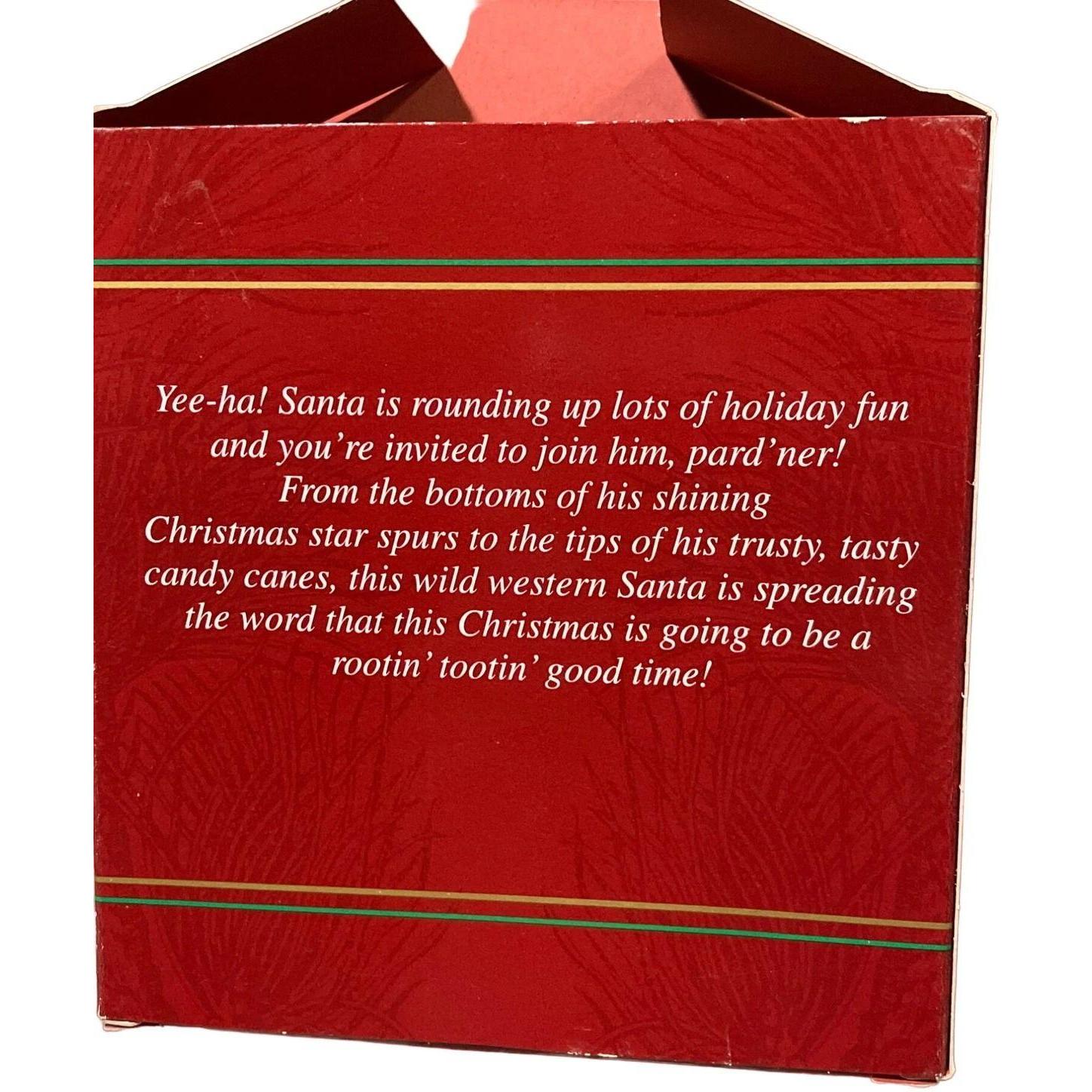 Saddle up for a festive twist on holiday décor with this 1999 Rootin’ Tootin’ Christmas ornament from the Carlton Cards Heirloom Collection. The design features Santa dressed in full cowboy regalia—boots, hat, bandana and lasso—in a lively Wild West motif that blends Christmas charm with a playful western flair. With its bright multi-color finish and detailed sculpting, it captures both holiday spirit and collector appeal. The clear variant SKU CXOR-113A adds to its collectibility among fans of themed ornaments, cowboy décor or unique holiday accents.