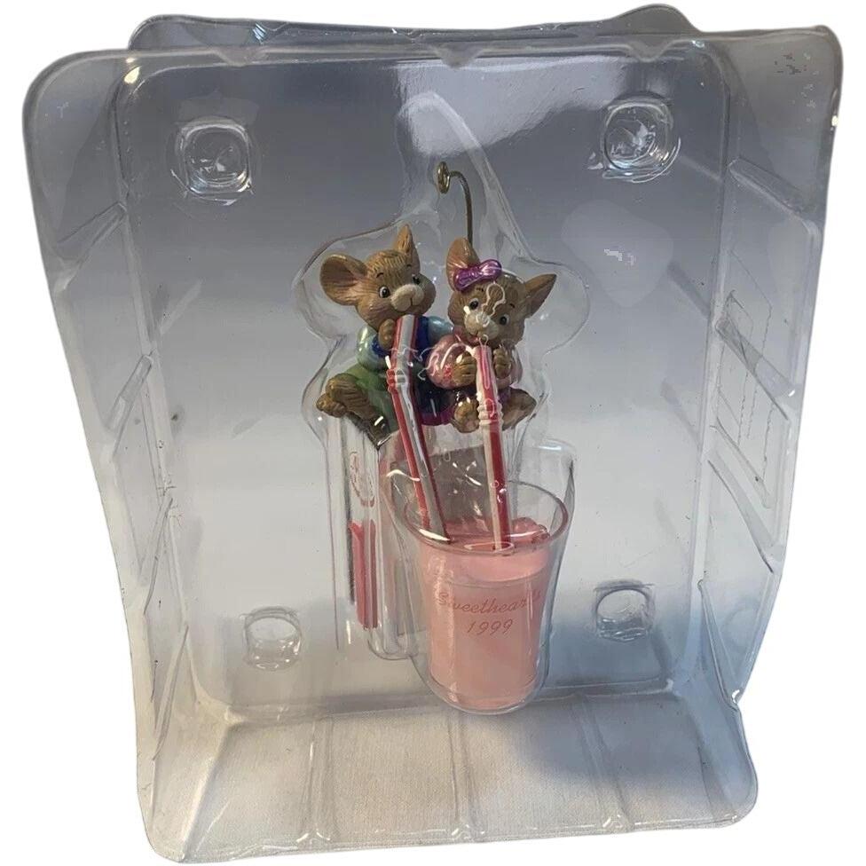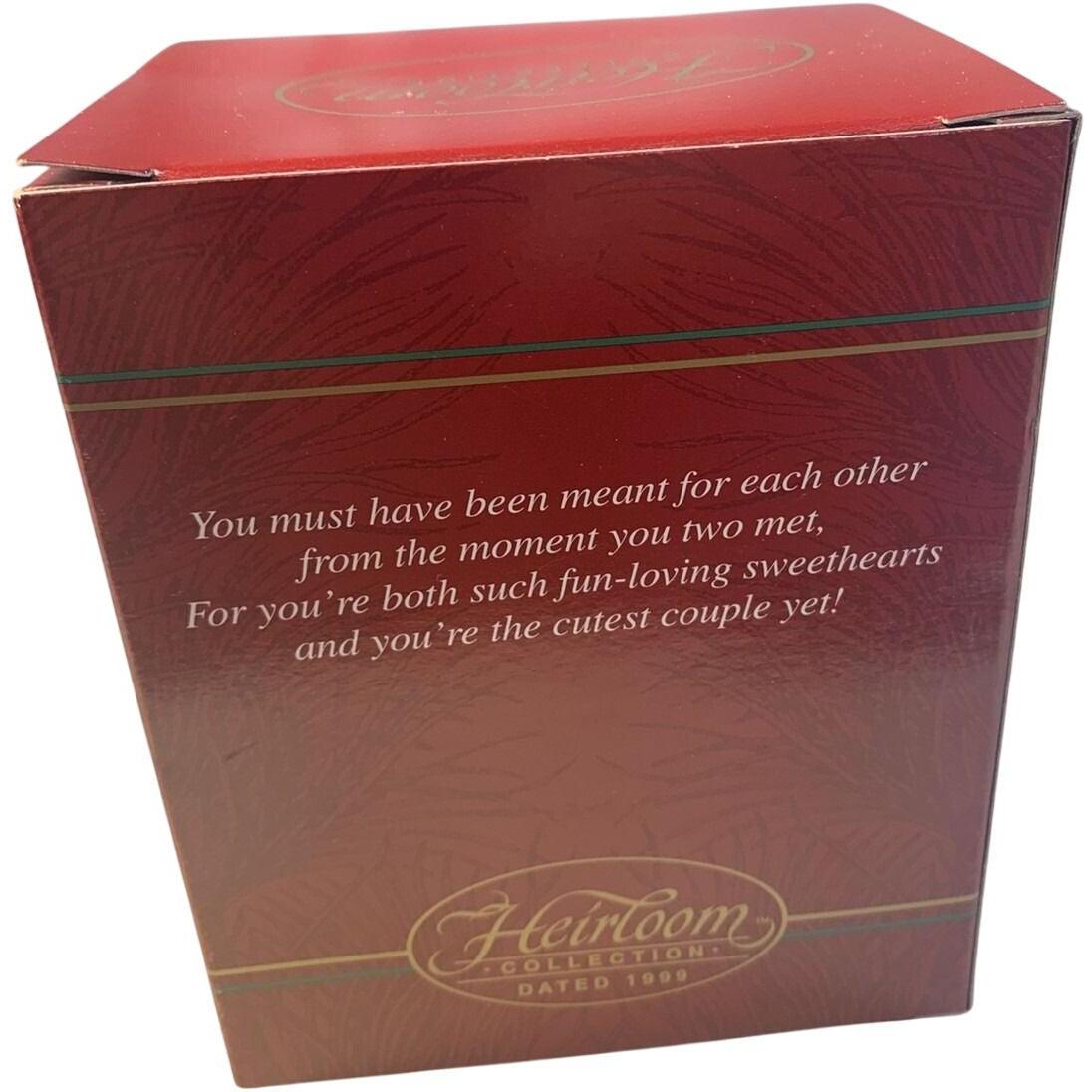 This charming collectible ornament features two adorable mice sharing a sweet moment together—part of the “Sweethearts” series in the Heirloom Collection. The design blends romantic charm with holiday festivity: the mice are lovingly posed, the palette is warm and multicolored, and the craftsmanship reflects the fine detail of molded resin/plastic with a hand-painted finish. Released in 1999, this piece is ideal for couples, anniversary gifts, Valentine-style tree décor, or collectors of romance-themed holiday ornaments.