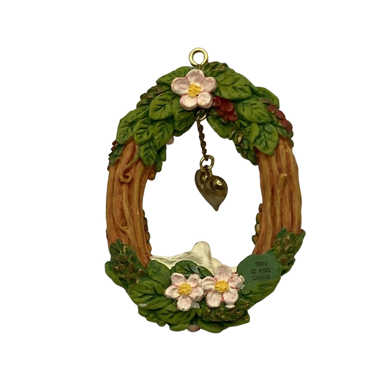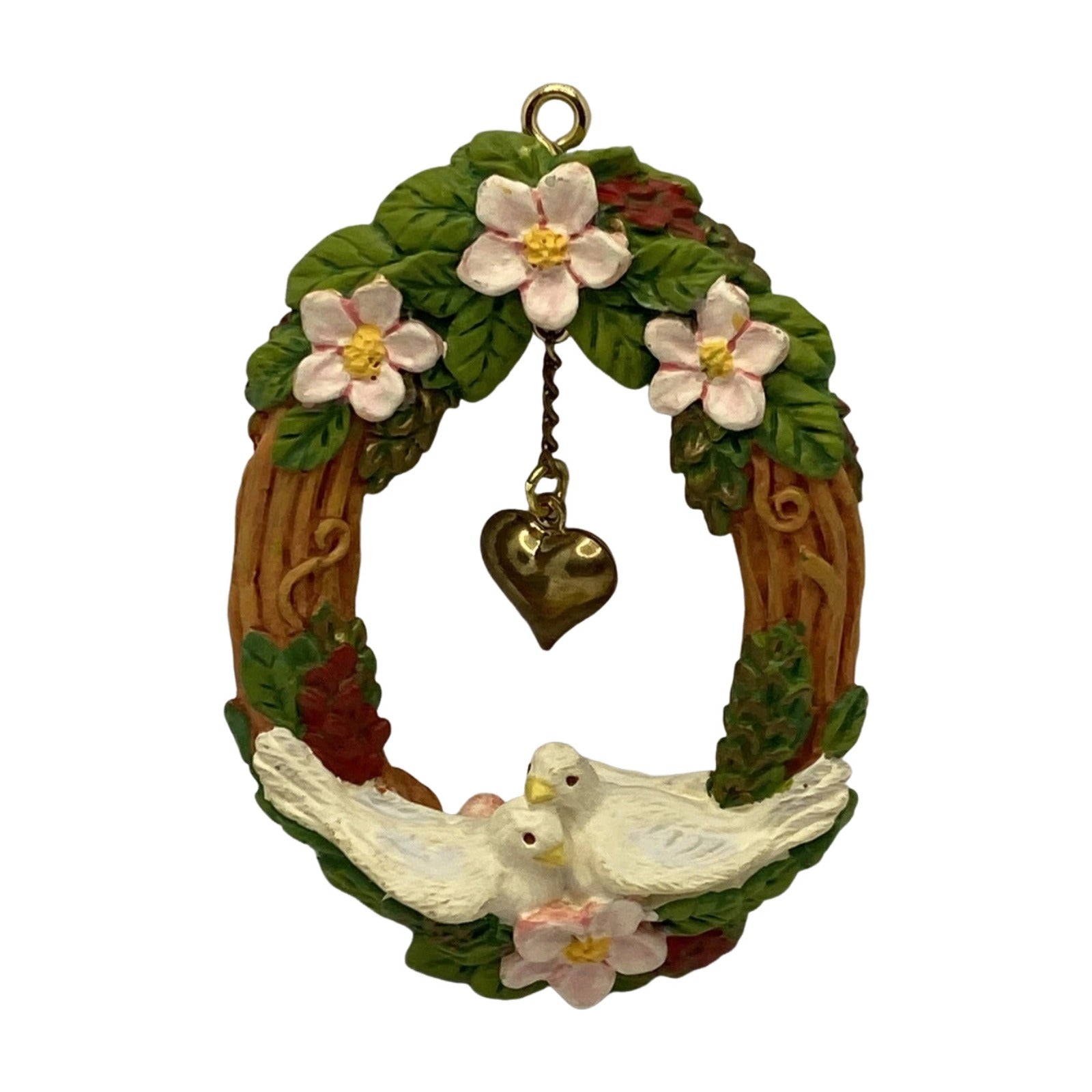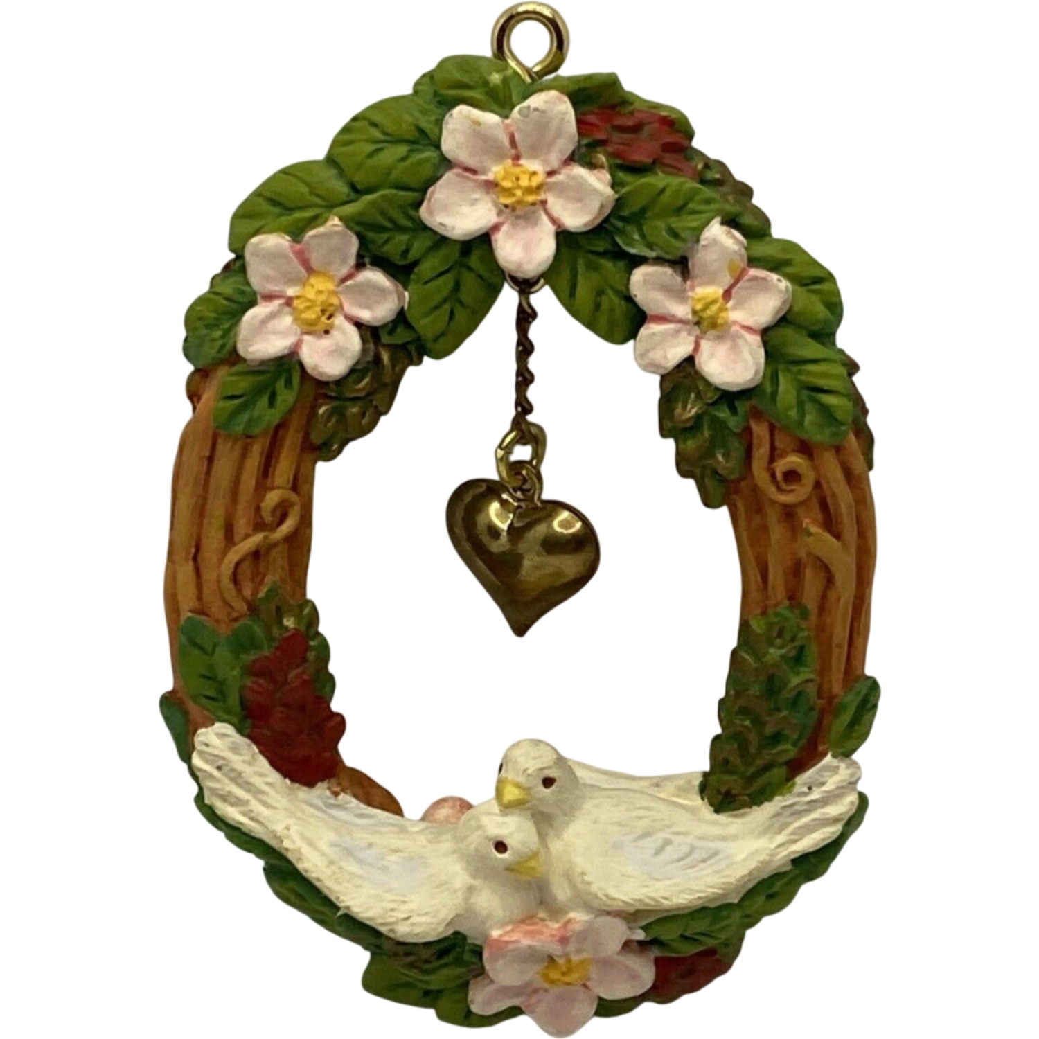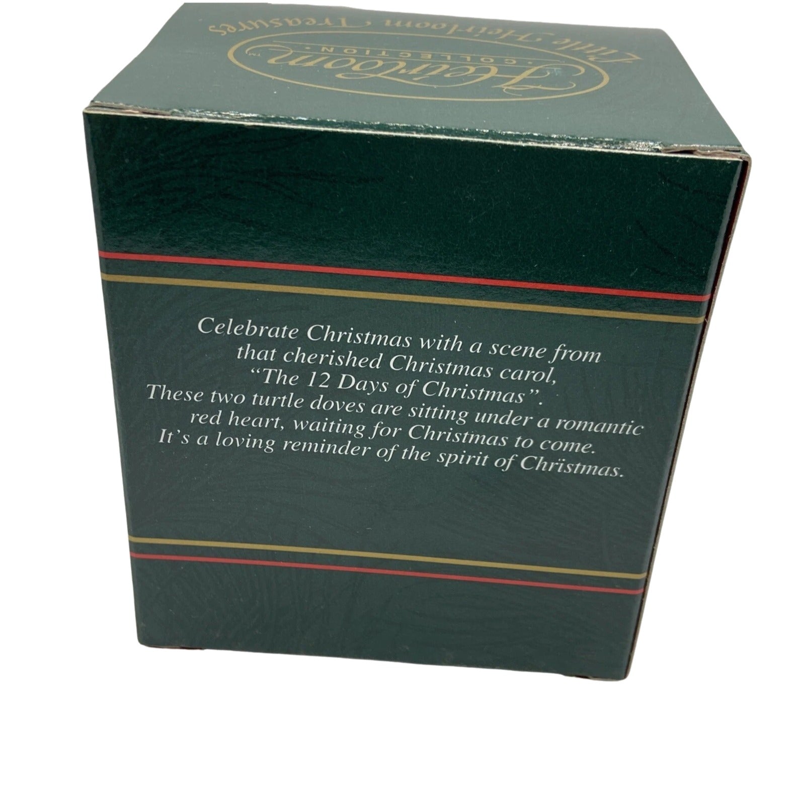 Celebrate a symbol of love and timeless romance with the 1999 Vintage Two Turtle Doves ornament (Bird series) by Carlton Cards Heirloom Collection. This charming piece features two sculpted doves resting beneath a wreath of sculpted blossoms, with a dangling gold heart—a nod to the beloved “Twelve Days of Christmas” carol. Housed in its original green-and-gold Carlton Cards box with a clear display window and tagged for collectors. No batteries, cords, or lights are needed—just hang and enjoy its elegant holiday spirit