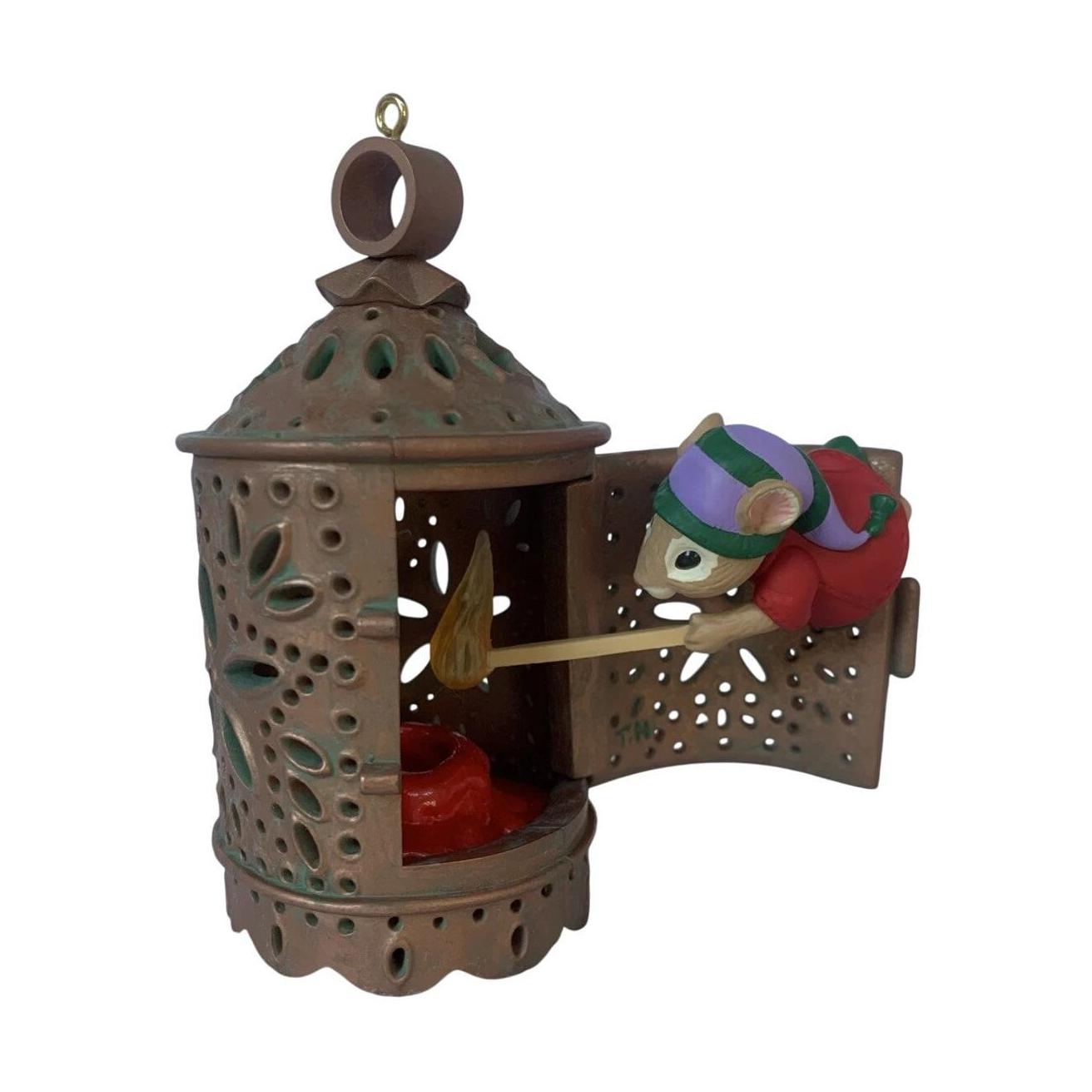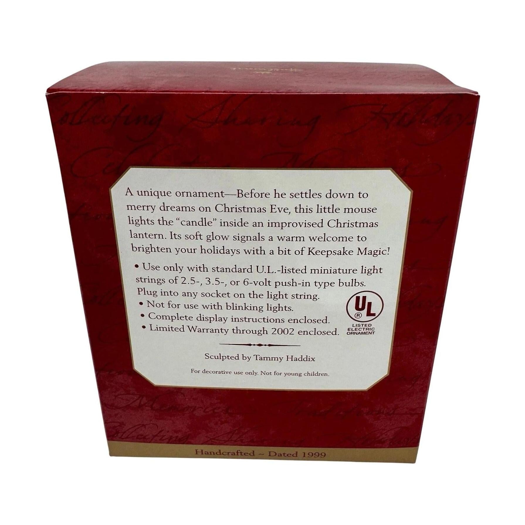 Invite a cozy touch of Christmas cheer with the 1999 Warm Welcome Hallmark Keepsake ornament. This adorable Magic ornament features a friendly little mouse standing at the doorway of his snow-covered home, complete with a glowing lantern and a tiny wreath that lights up when connected to a miniature light strand. The detailed sculpting showcases the warmth of the interior and the mouse’s cheerful expression, creating a heartwarming holiday scene. Perfect for collectors who adore whimsical Hallmark Magic ornaments and classic storybook charm.