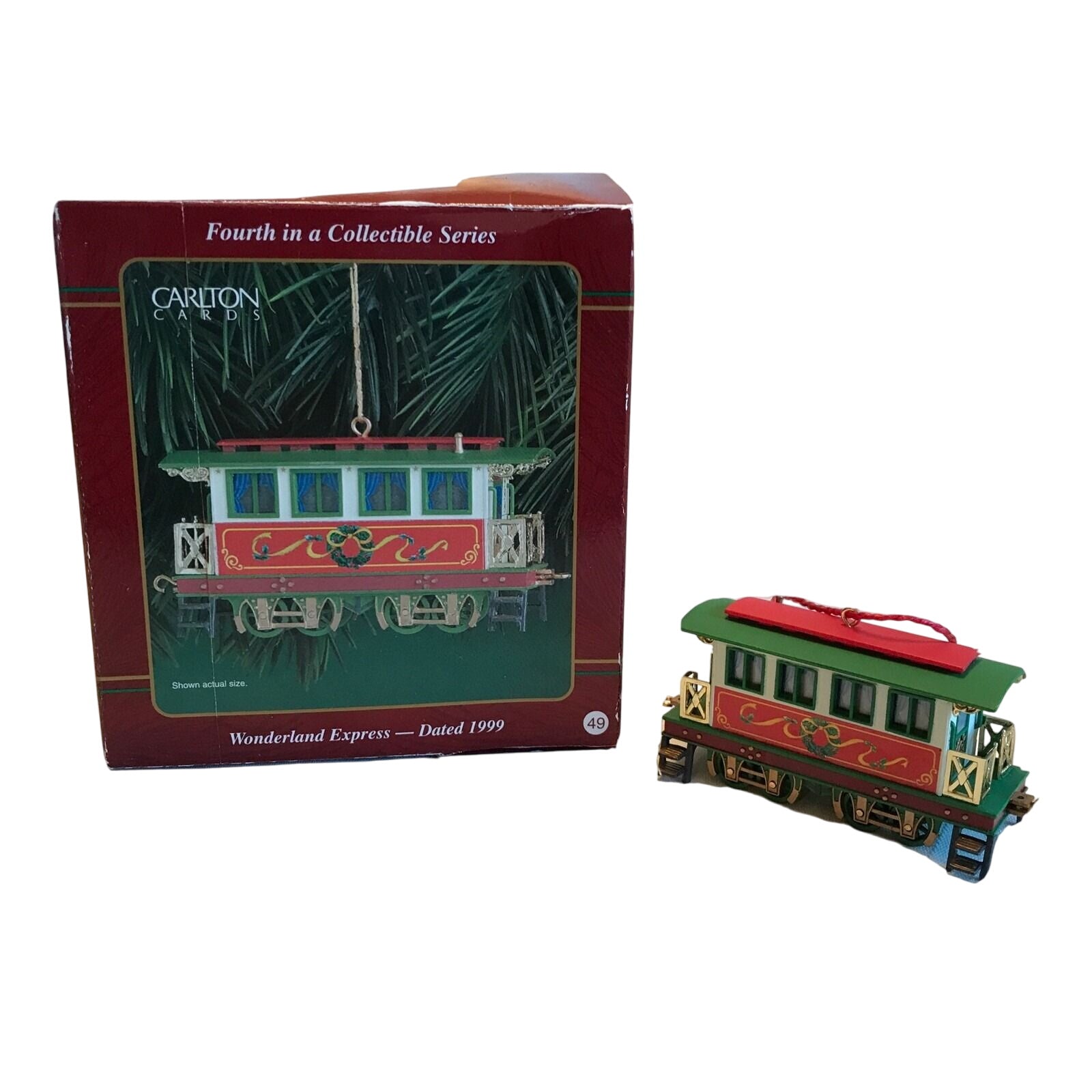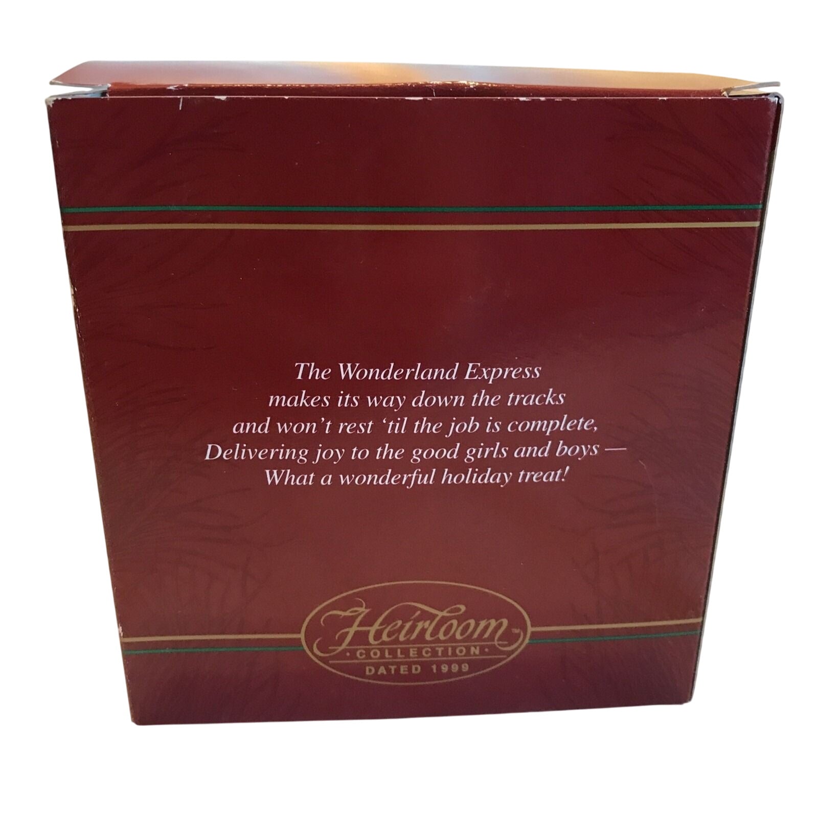This collectible ornament features a festively detailed passenger car from the “Wonderland Express” train series released in 1999. The piece showcases classic holiday train styling — rich reds and greens, gold trim, snow-accented motifs and rolling wheel detailing — making it ideal for lovers of train-themed décor and vintage Christmas accents. Crafted in molded resin/plastic with a high-quality painted finish, the ornament brings nostalgic charm and collector appeal, especially for those building the full series.