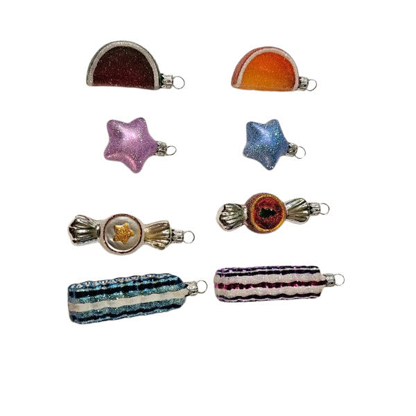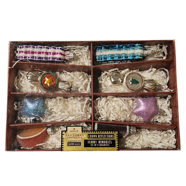 This collectible piece is a set of eight hand-blown glass ornaments from Hallmark’s Crown Reflections line, released in 1999 under SKU QBG6049. The set features a vibrant “Yummy Memories” candy motif – including blown glass representations of ribbon candy, wrapped sweets, and glittering stars/fruit slices, all rendered in rich colours and sparkling finishes. These small-scale ornaments (≈ 2½″ high) are meant to evoke nostalgic holiday treats and vintage tree-jewelry styling for collectors of blown glass decoration and themed Christmas décor.