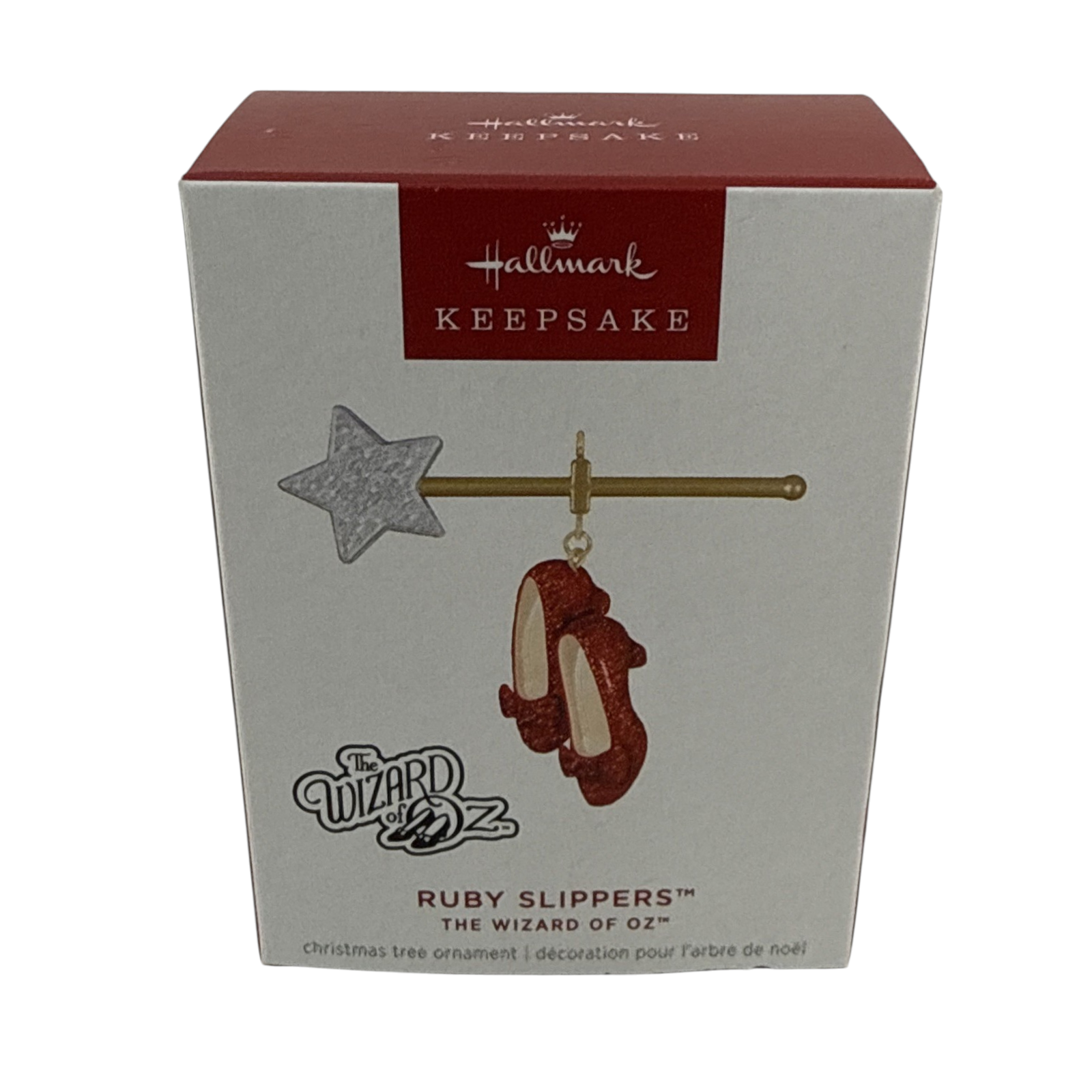 This enchanting 2021 “Ruby Slippers” ornament from the Hallmark Keepsake collection celebrates a beloved classic from The Wizard of Oz. The design features Dorothy’s iconic glittering red shoes styled in finely sculpted resin with shimmering accents—a perfect nod to the famous line “There’s no place like home.” Its compact size, film tie-in, and collectible nature make it an ideal gift or display piece for both movie buffs and Keepsake collectors. The inclusion of the dated year and model number 1HCM1079 enhances its appeal for those tracking the ornament series by year and theme.