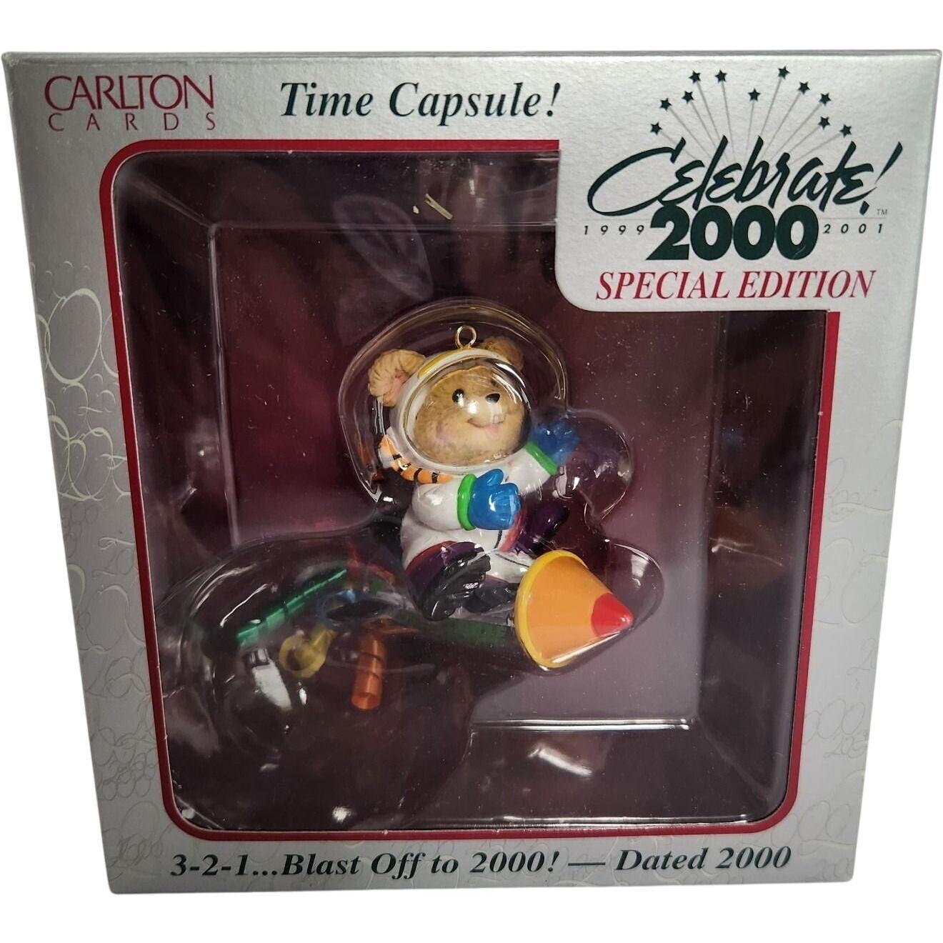 Celebrate the dawn of the new millennium with this spirited 2000 edition ornament from the Heirloom collection by Carlton Cards. It features a festive teddy bear adorned in astronaut gear, ready for lift-off with a rocket and time-capsule motif that evokes the excitement of Y2K. The vibrant colors, dynamic pose and “Blast Off to 2000!” theme add both nostalgia and collectible charm, making it a standout piece for teddy bear collectors, millennium-theme décor and anyone who appreciates vintage holiday ornaments.