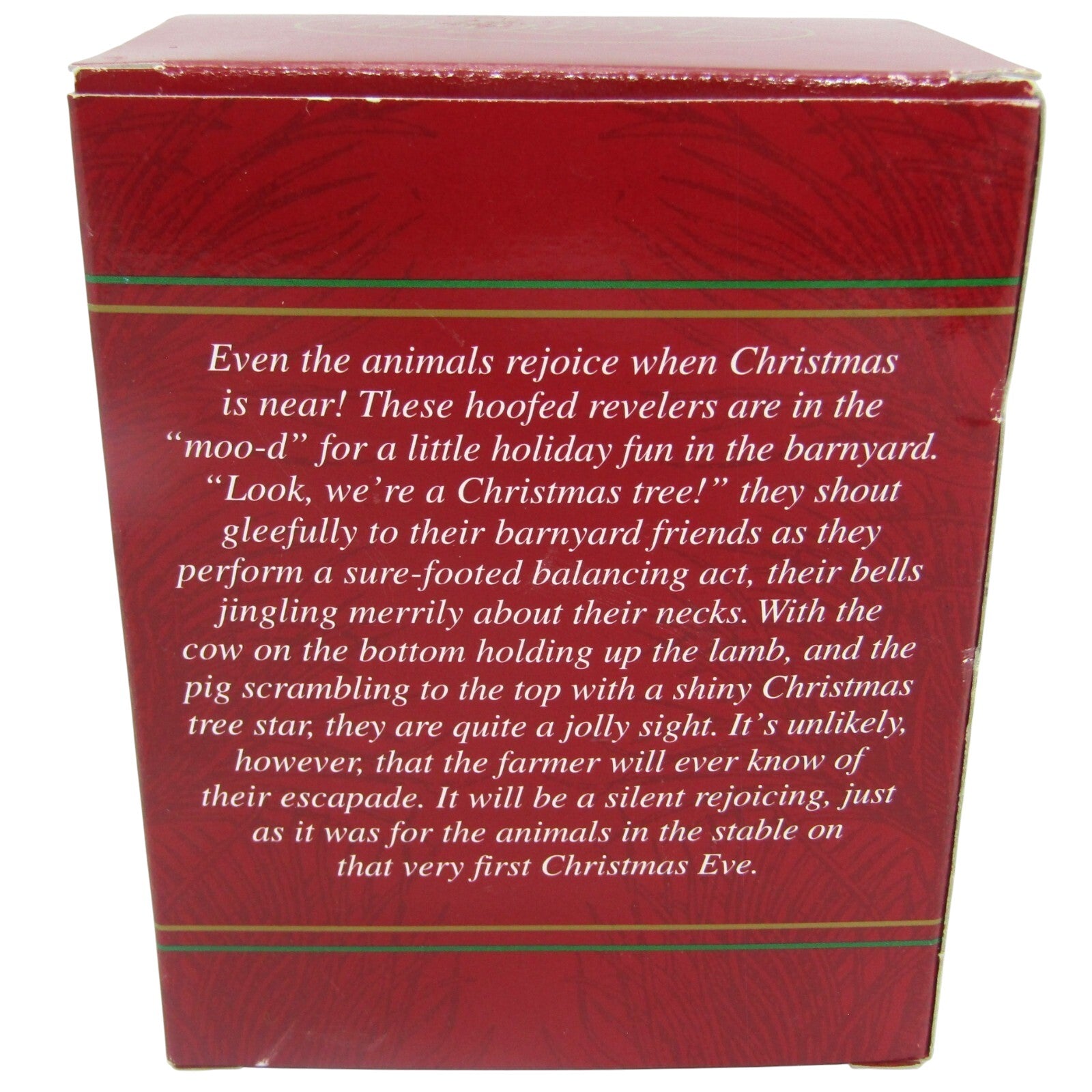 This delightful 2000 edition ornament from the Carlton Cards Heirloom collection features a stacked trio of barnyard animals—cow, sheep and pig—each wearing a jingle bell, topped by a star and joyful holiday design. Crafted in resin with playful faux rope and metal bell details, it blends farmhouse charm with Christmas whimsy. With its vintage release year and lively farm-animal theme, it’s a perfect addition for animal lovers, farm décor enthusiasts and collector-focused holiday displays.