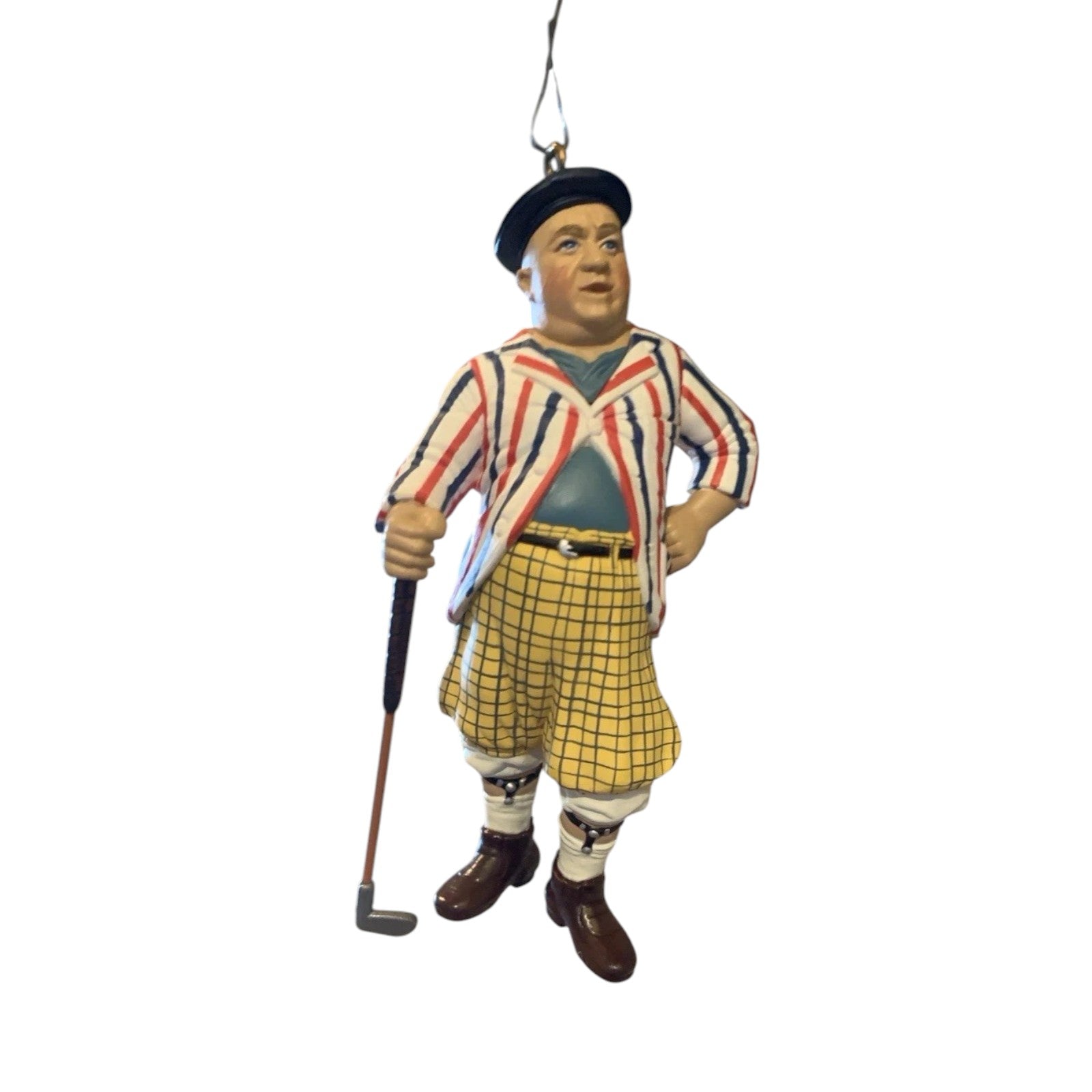 Celebrate classic slapstick comedy with this 2000 Golfing Goofballs “Curly” ornament from Carlton Cards. Styled as Curly Howard from The Three Stooges, this piece shows him in full golfing garb—club in hand, hat tipped and expression full of mischief. The finely painted resin figure features vibrant colors, playful detailing and a hanging loop, making it both decorative and collectible. As part of the Golfing Goofballs series, it brings nostalgic character appeal and holiday fun in one charming package.