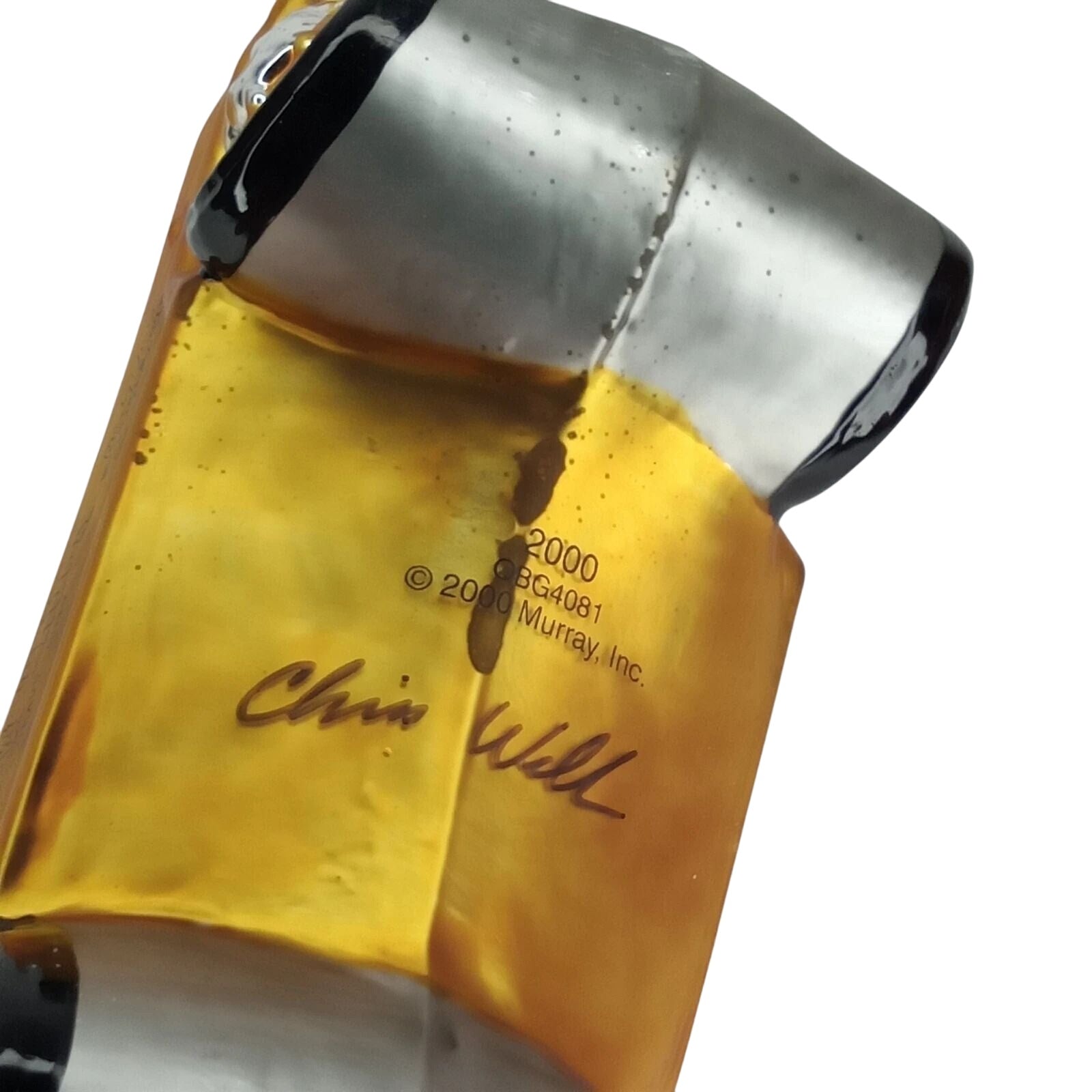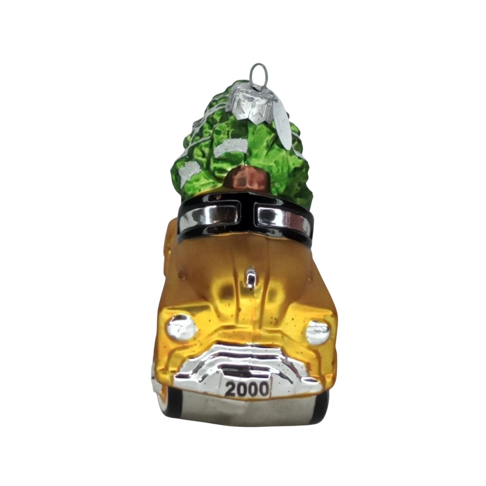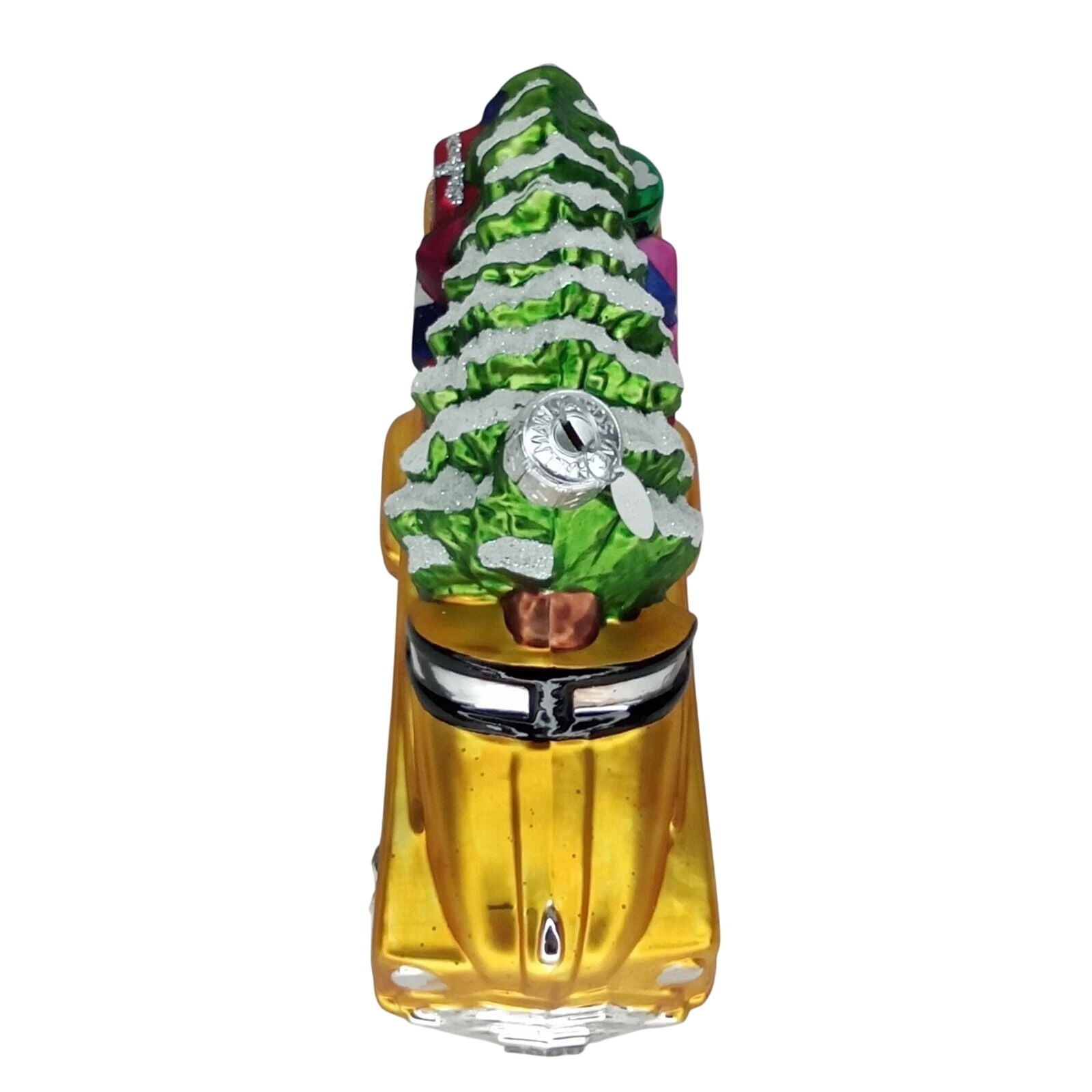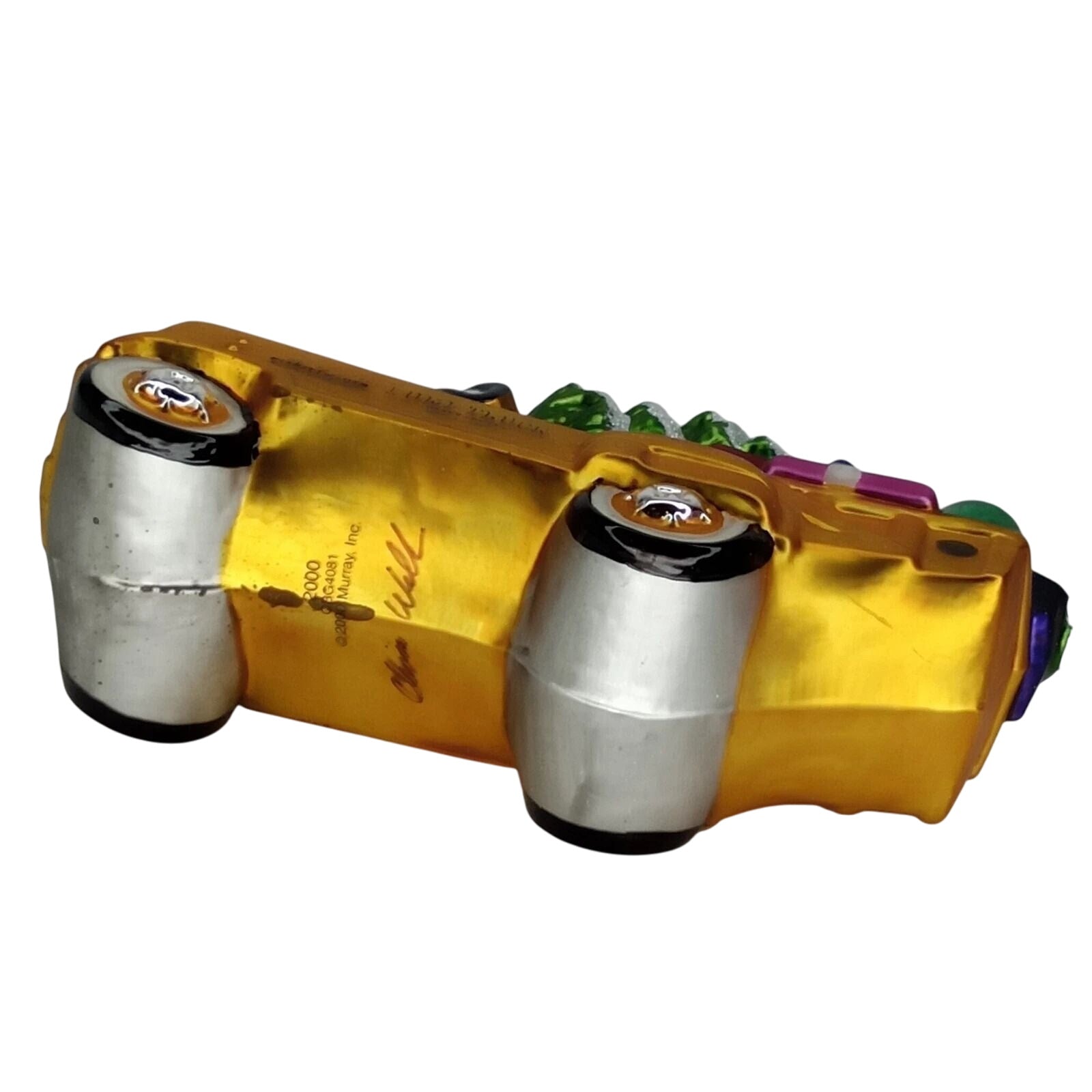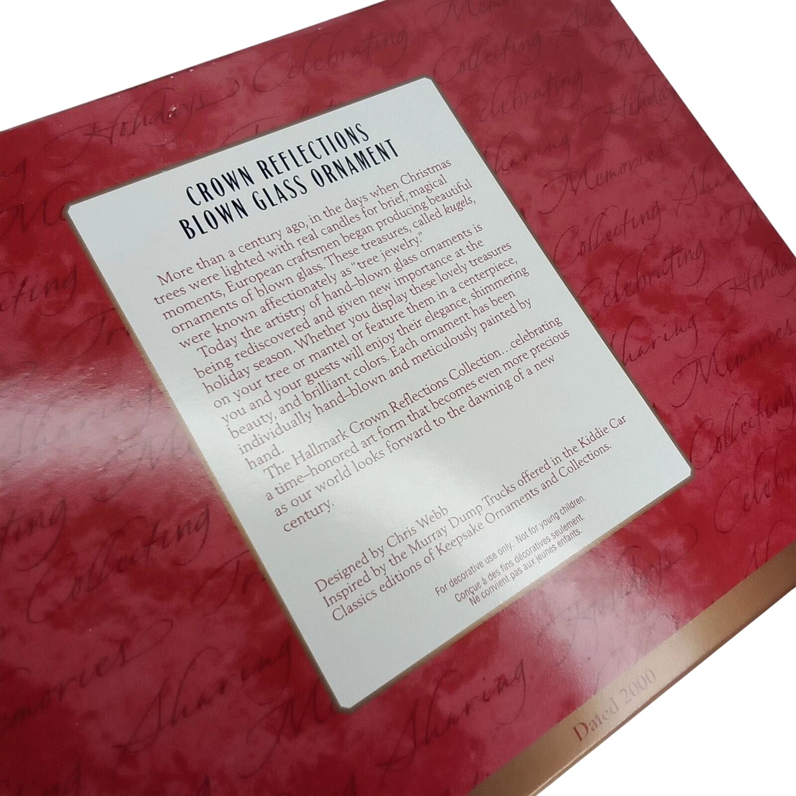 Drive nostalgia home with the 2000 1955 Murray Dump Truck from Hallmark’s Kiddie Car Classics series. Crafted in blown glass by artist Chris Webb, this ornament portrays a classic 1955 Murray dump truck, complete with a lively truck bed carrying a green Christmas tree and wrapped gifts, all dressed in festive colors and trimmed with delicate snow-like highlights. It’s a beautifully detailed piece with a ~4-inch height (approx 4″ H) and arrives in its original packaging when available.