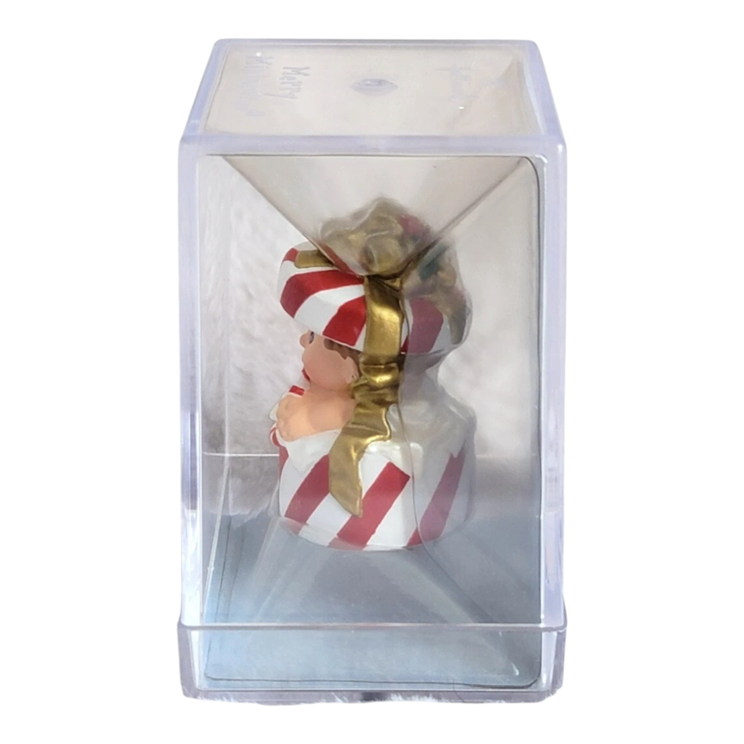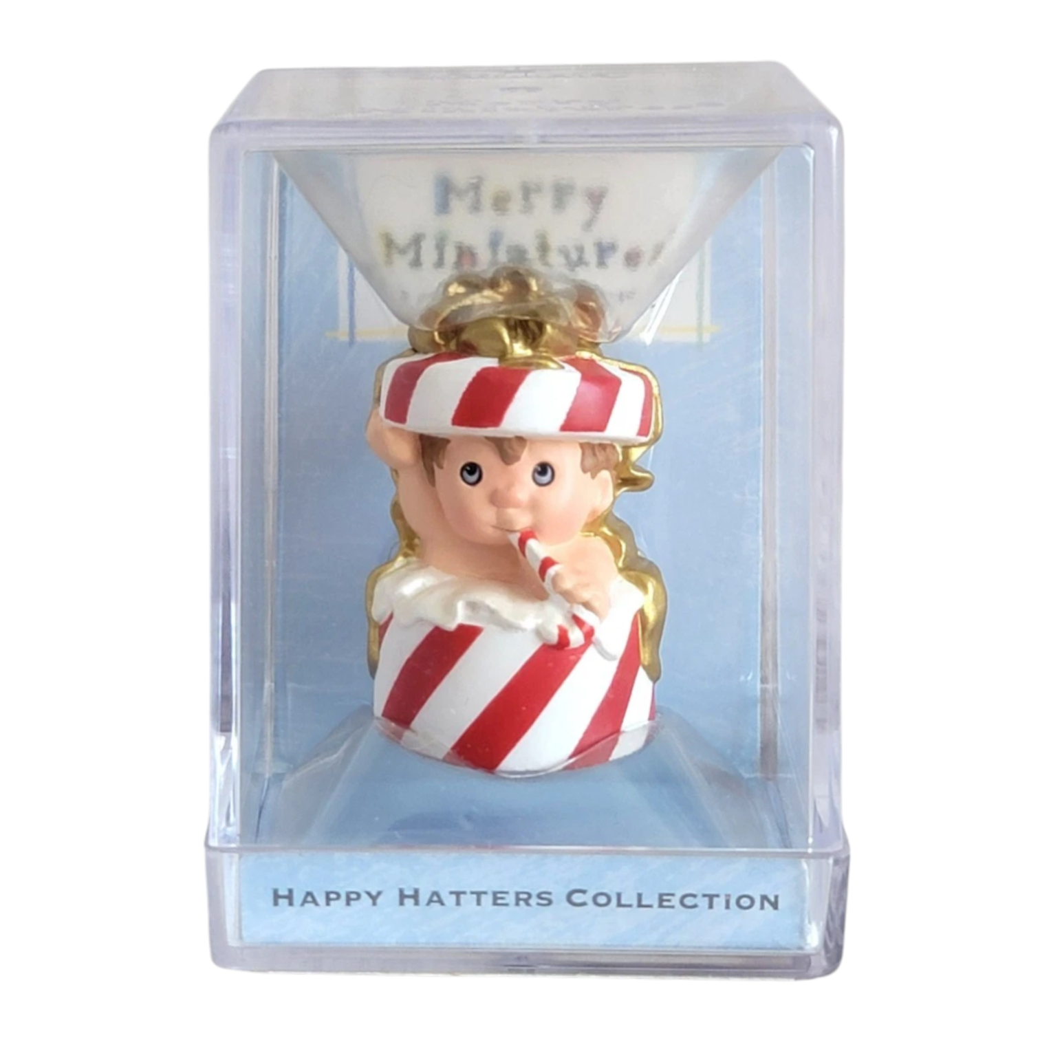 Bring festive fun to your tree with 2000’s "Hattie Boxx", the twelfth and final Merry Miniature in Hallmark’s Happy Hatters series. This cheerful figure features Hattie perched inside a red-and-white striped present box, delightfully munching on a candy cane. Measuring just over 1.5″ tall, this collectible arrives in its original keepsake box with hanging tag—no batteries or cords required.