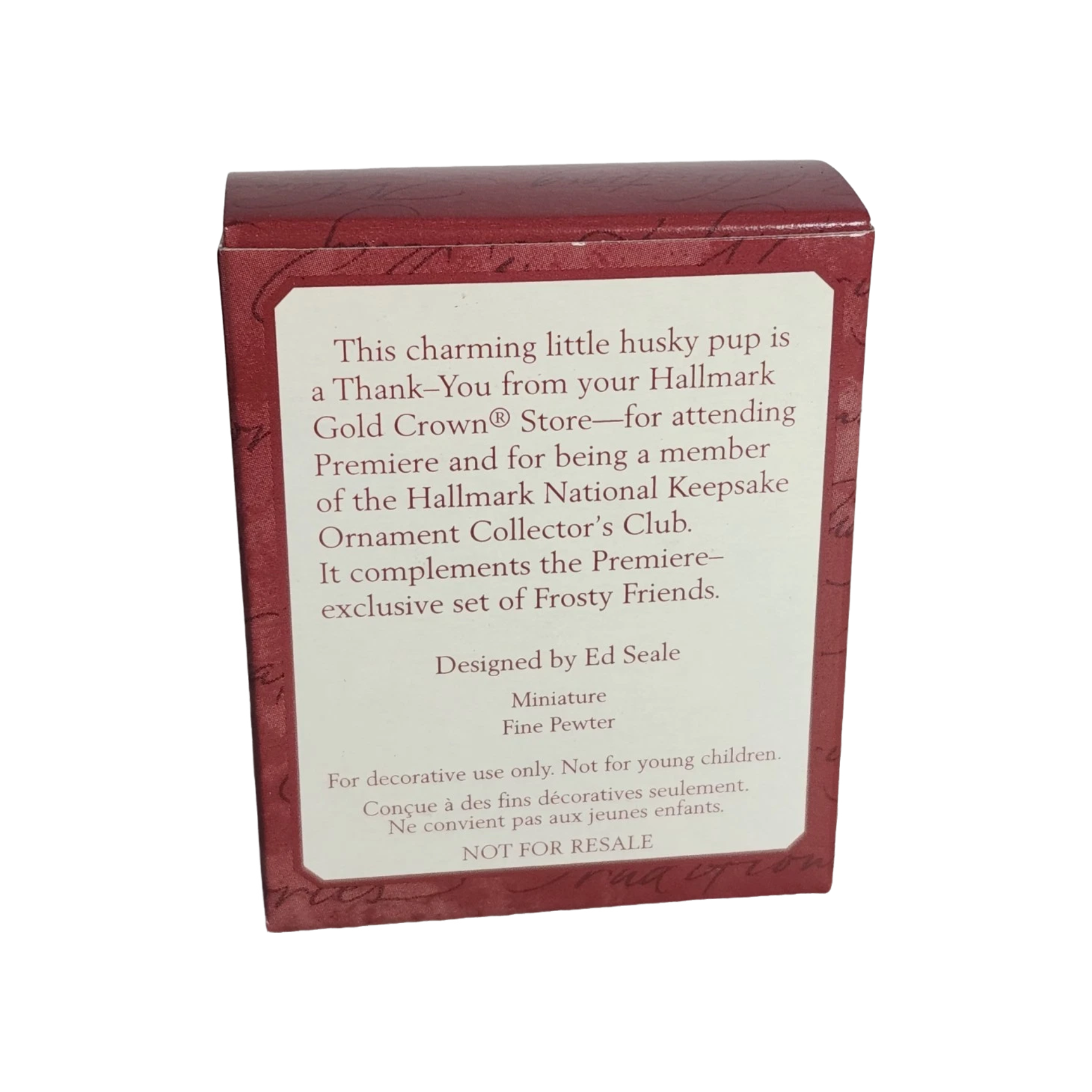Meet the adorable Husky, a delightful pewter miniature introduced in 2000 as part of Hallmark’s Frosty Friends series. Crafted with fine detail, this tiny husky pup captures the cozy spirit of the season in a collectible keepsake form. Originally offered as an exclusive gift for members of the Hallmark Keepsake Ornament Club’s Premier event, this miniature complements the main Frosty Friends ornament, making it a perfect companion piece. The ornament typically comes in its original box, making it a treasure for collectors. No batteries or cords are needed—just hang it and enjoy the charm of winter companionship.