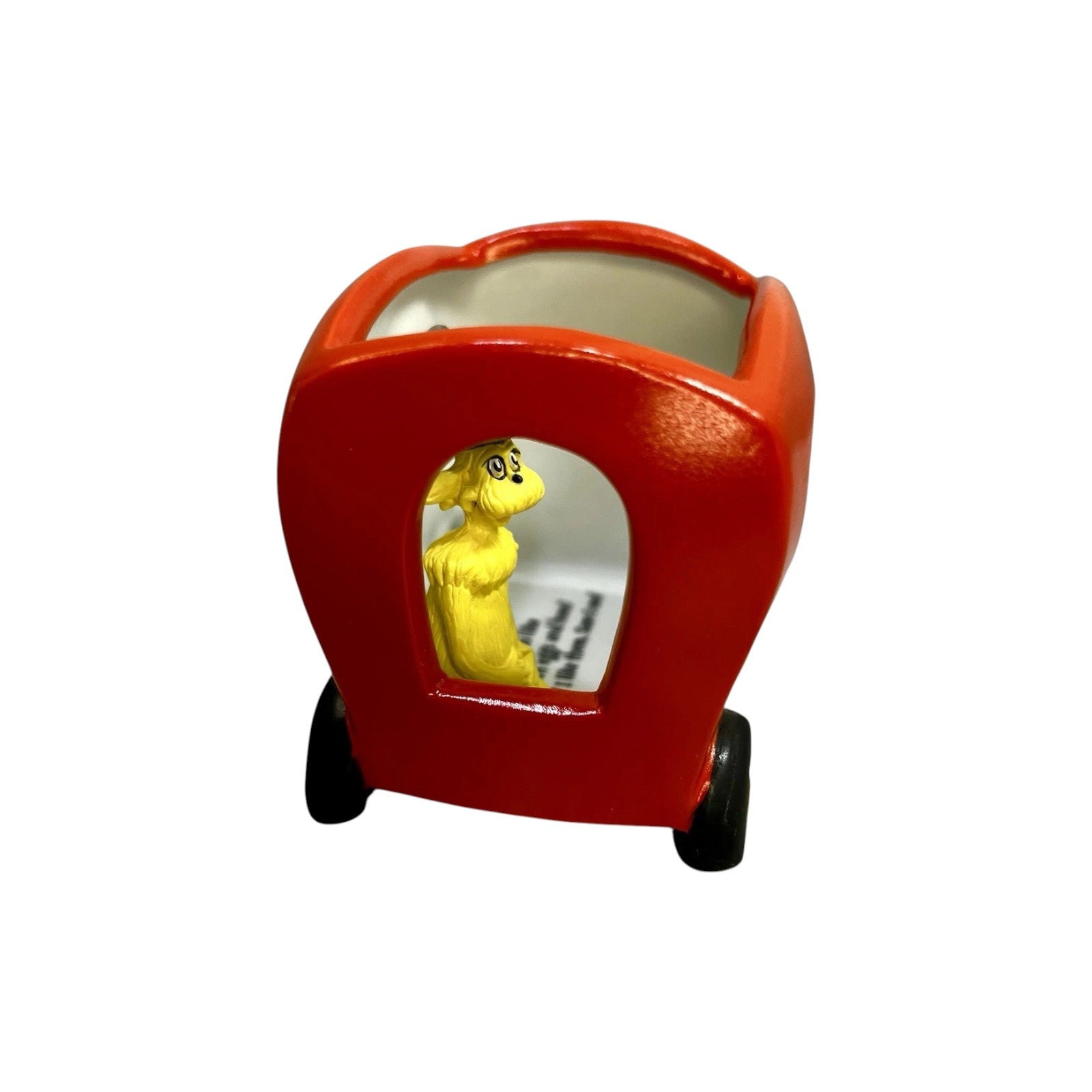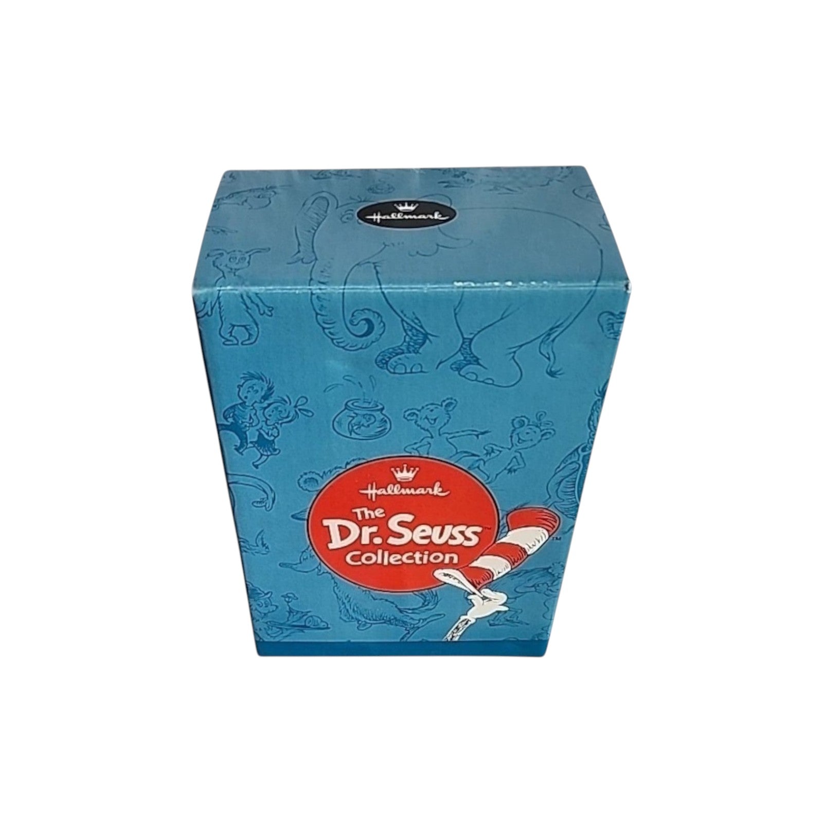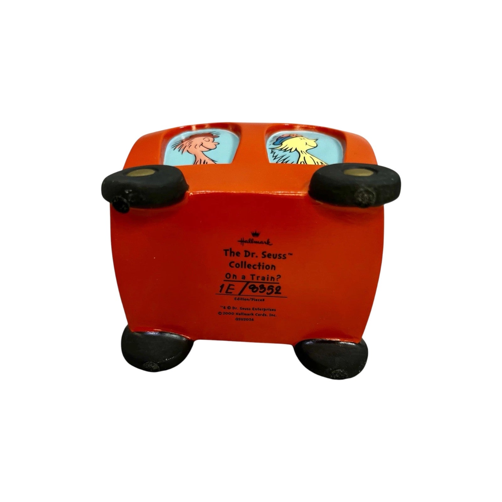 From Hallmark’s short-run Dr. Seuss Collection, this 2000 numbered porcelain edition titled “On a Train?” brings the classic Green Eggs and Ham moment to life. The design features Sam-I-Am relaxed atop a bright, whimsical train car that doubles as a small lidded keepsake box. On the roof you’ll find the famous line, “Could you, would you, on a train?” and inside the box is another printed quote from the story, making it a fun display piece with hidden Seussian charm. As issued, it comes with the original Hallmark Dr. Seuss Collection gift box, protective packaging, and a certificate of authenticity/numbered-edition paperwork when new. This is a static collectible (no sound, motion, or lighting), so it does not require batteries, cords, or light strings.