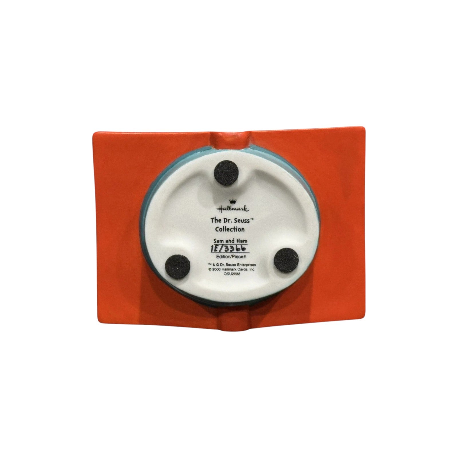 This 2000 Hallmark Dr. Seuss Collection numbered porcelain figurine, “Sam and Ham,” brings Green Eggs and Ham to life in a whimsical tabletop keepsake. The design features Sam-I-Am presenting a tray piled high with the famous green eggs and ham, poised atop an open “storybook” base printed with lines from the classic tale. It’s sculpted in bright Seussian colors with playful curves and a story-accurate vibe that makes it a standout for Dr. Seuss fans. As originally issued, it includes the Hallmark Dr. Seuss Collection gift box with protective packaging and a certificate/numbered-edition card (when new-in-box). This is a static collectible with no sound, motion, or lighting, so it does not require batteries, cords, or light strings.