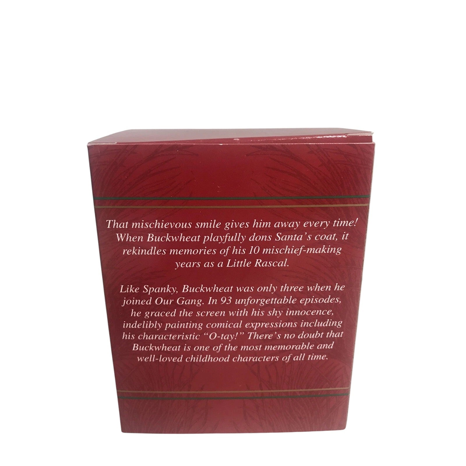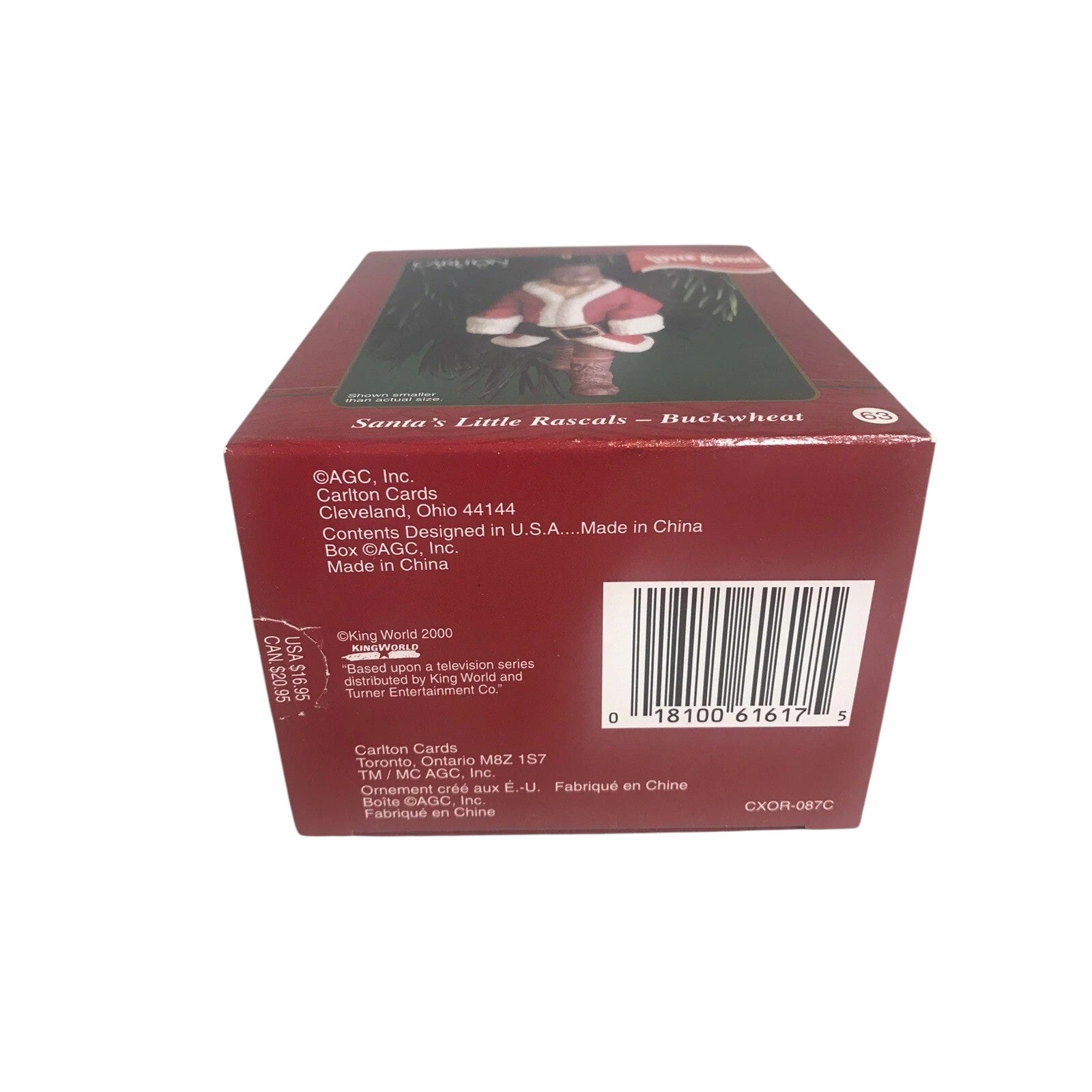 Celebrate a beloved pop-culture character this holiday season with the 2000 Santa’s Little Rascals – Buckwheat ornament from the Carlton Cards Heirloom collection. This festive piece features Buckwheat dressed in a Santa suit, complete with his signature charm and classic styling, rendered in painted resin/plastic with fine detail. The clear “2000” date marking and variant SKU CXOR-087C make this a standout for fans of the classic TV show The Little Rascals, vintage holiday décor and licensed-character ornament collectors. With its fun design and nostalgic appeal, it works equally well for display, gifting or completing a millennium-themed ornament collection.