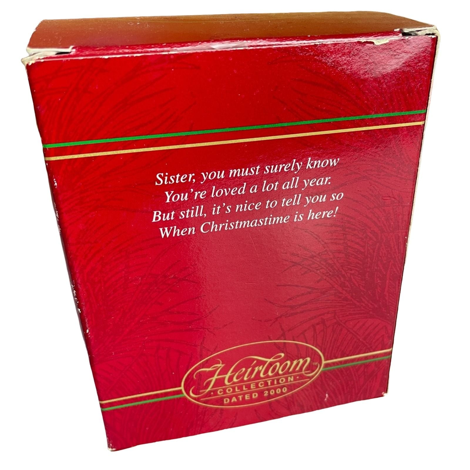 This elegant collectible ornament from the Heirloom Series highlights sisterly sentiment with a beautifully crafted miniature shoe motif—styled in a Victorian-inspired design with soft velvet-like body, decorative fabric roses, metallic trim and intricate detailing. The “Sister” inscription makes it a meaningful gift piece as well as a decorative collectible. Launched in 2000, this ornament combines feminine charm, vintage flair and the sentimental appeal of a sibling-theme, making it ideal for sisters, collectors of sister-themed décor, and fans of Carlton Cards’ Heirloom craftsmanship.